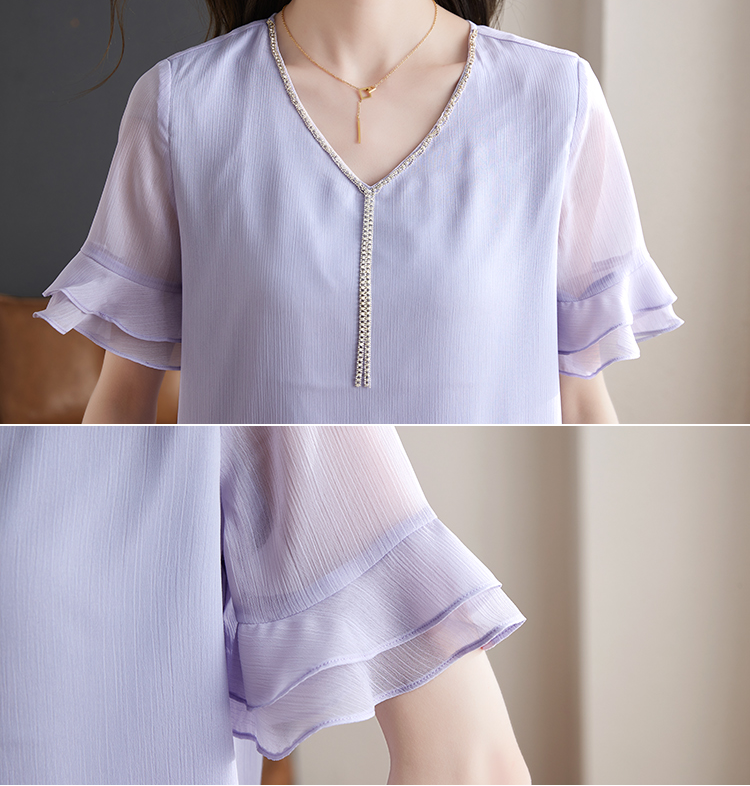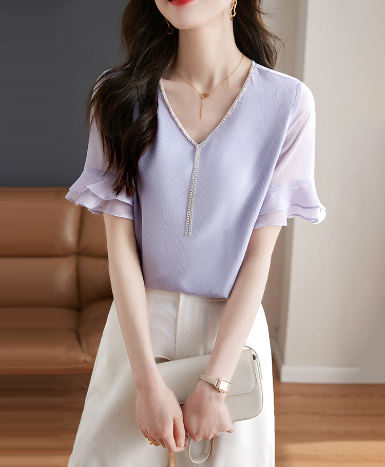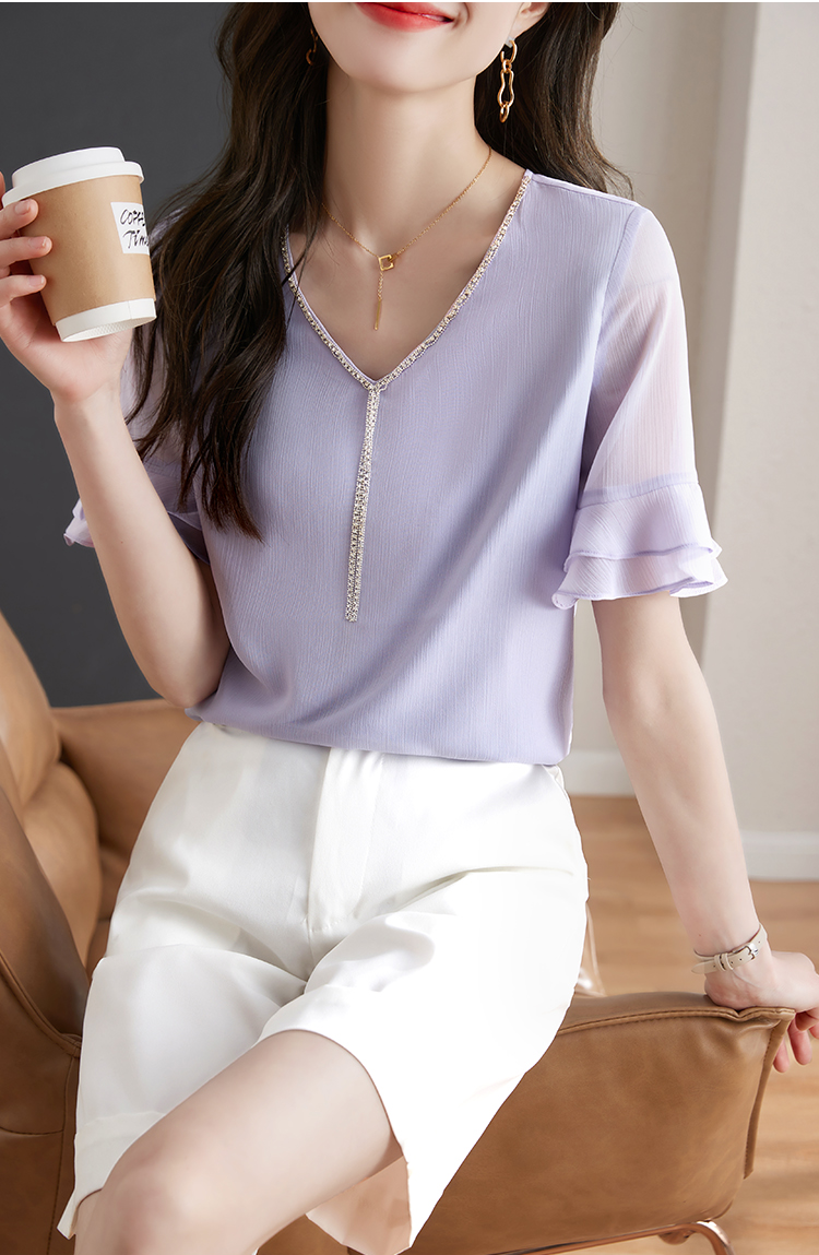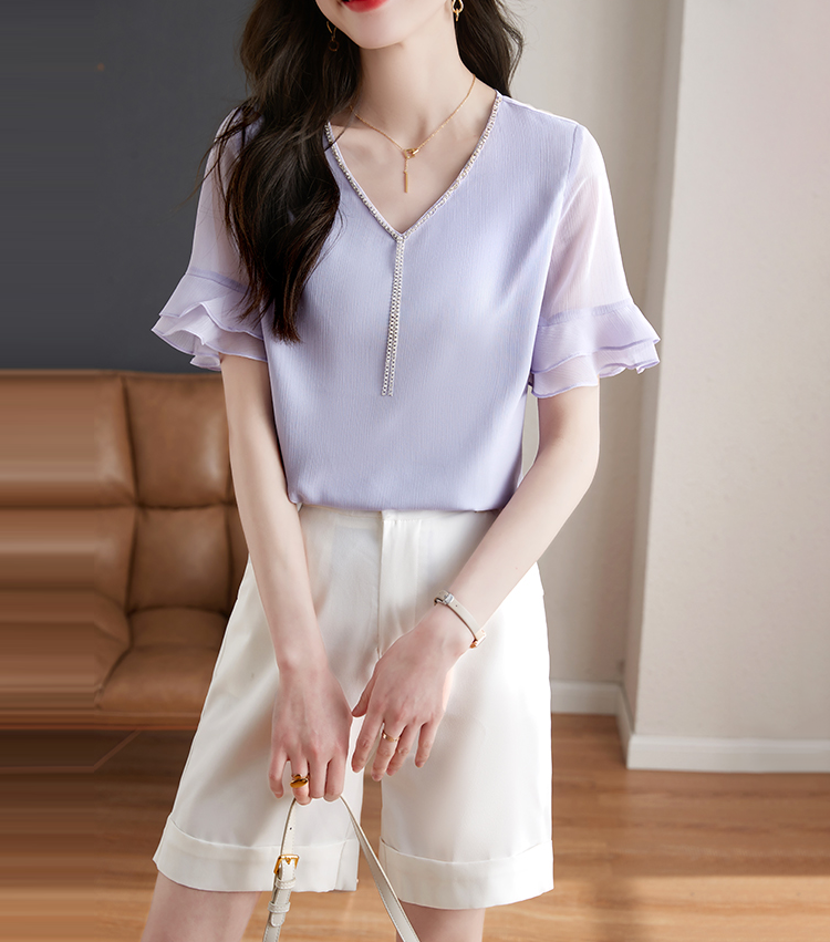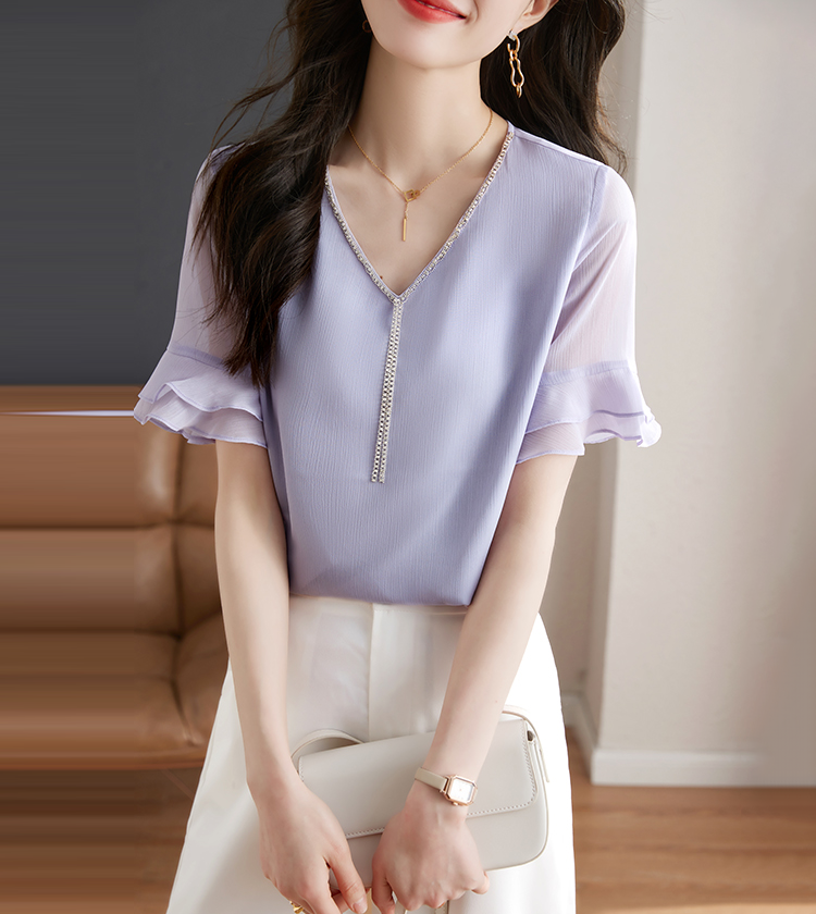 別緻鏈條V領透視荷葉喇叭短袖小衫