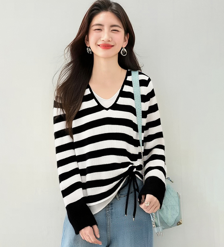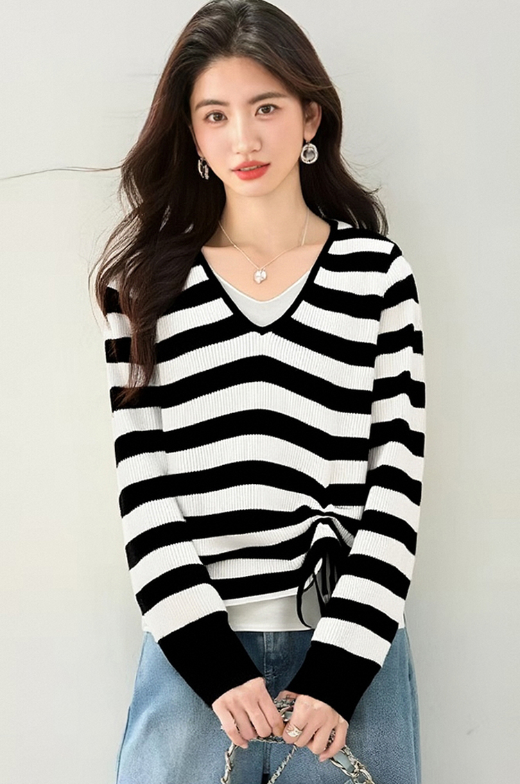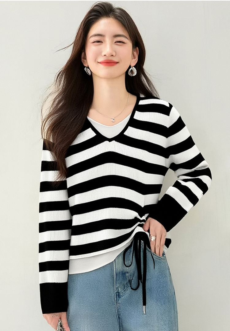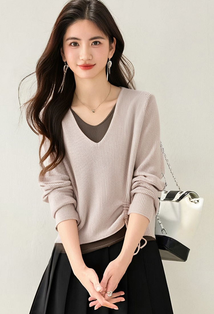 撞色V領假抽繩休閒針織衫(2色)