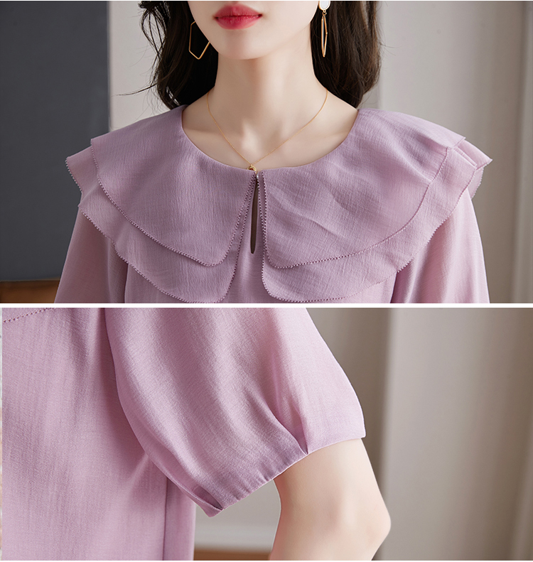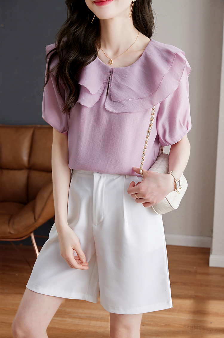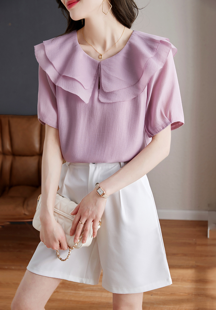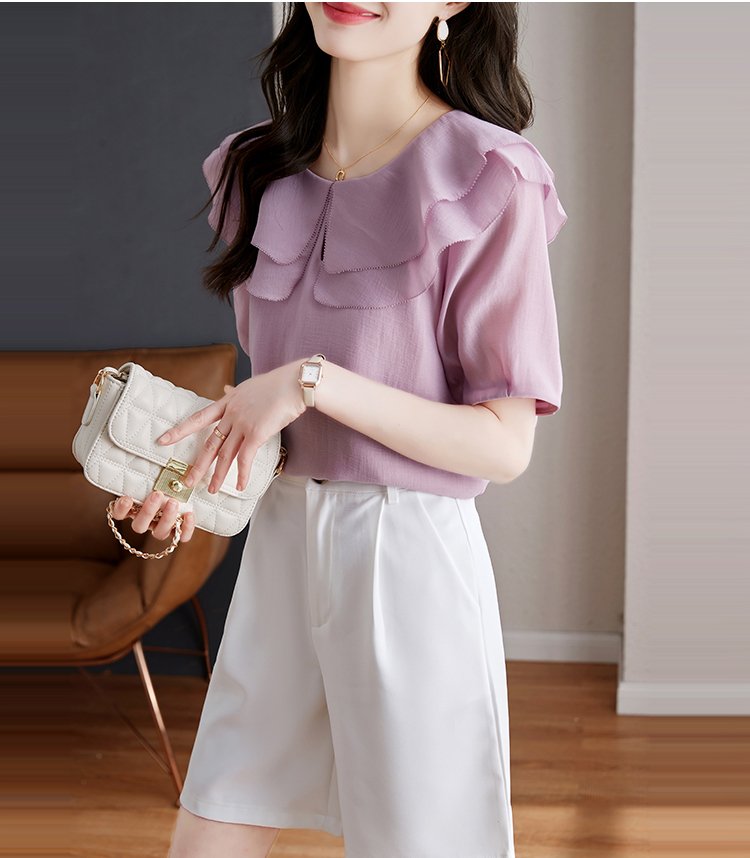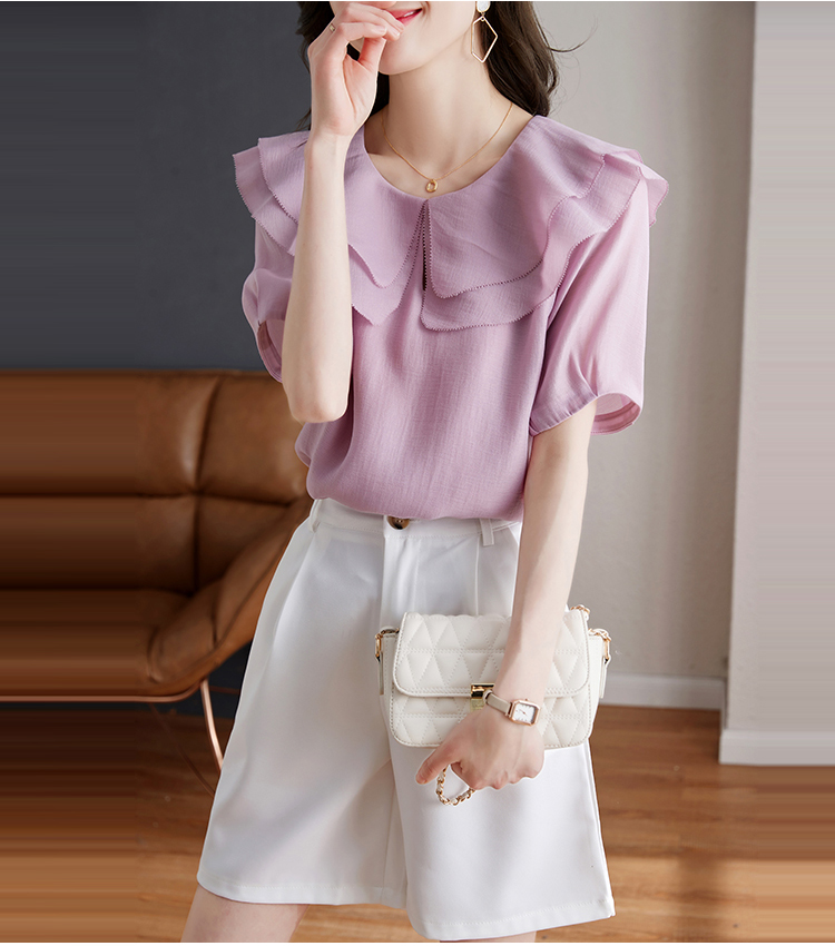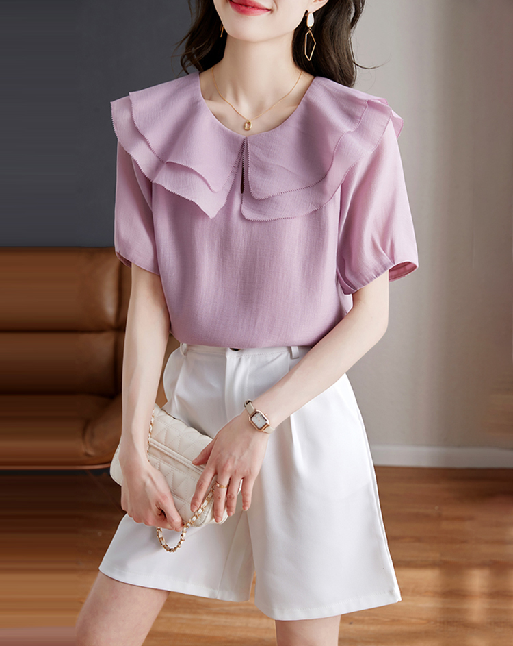設計感小眾紫色荷葉領短袖小衫