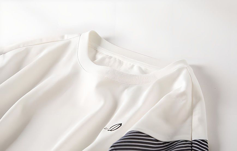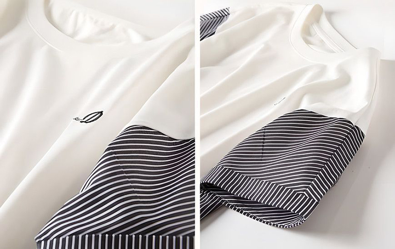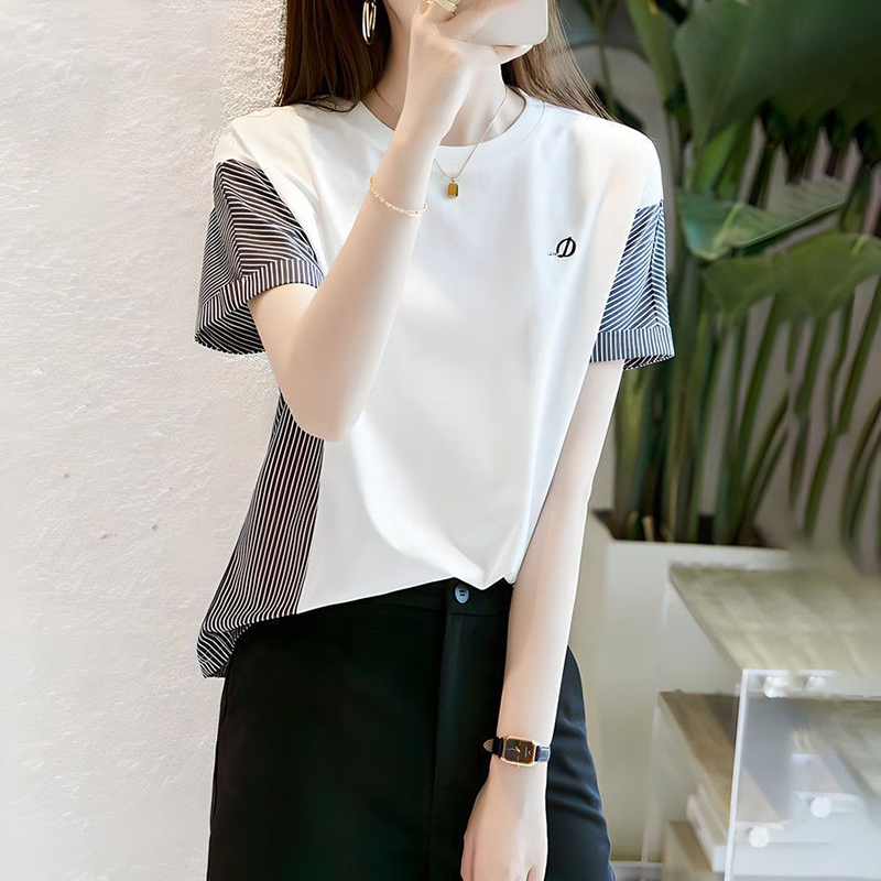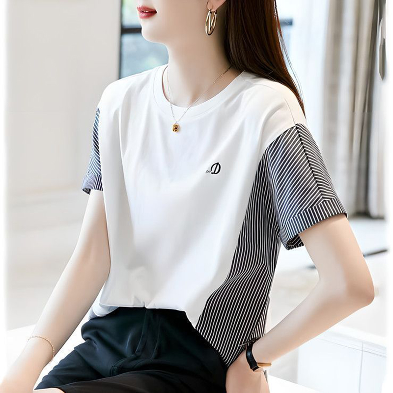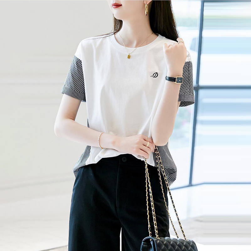 時尚圓領刺繡條紋短袖T恤