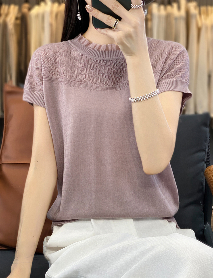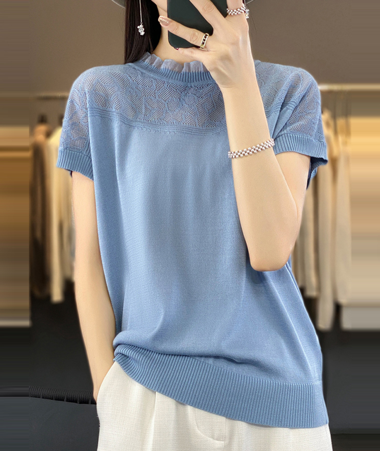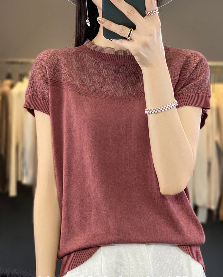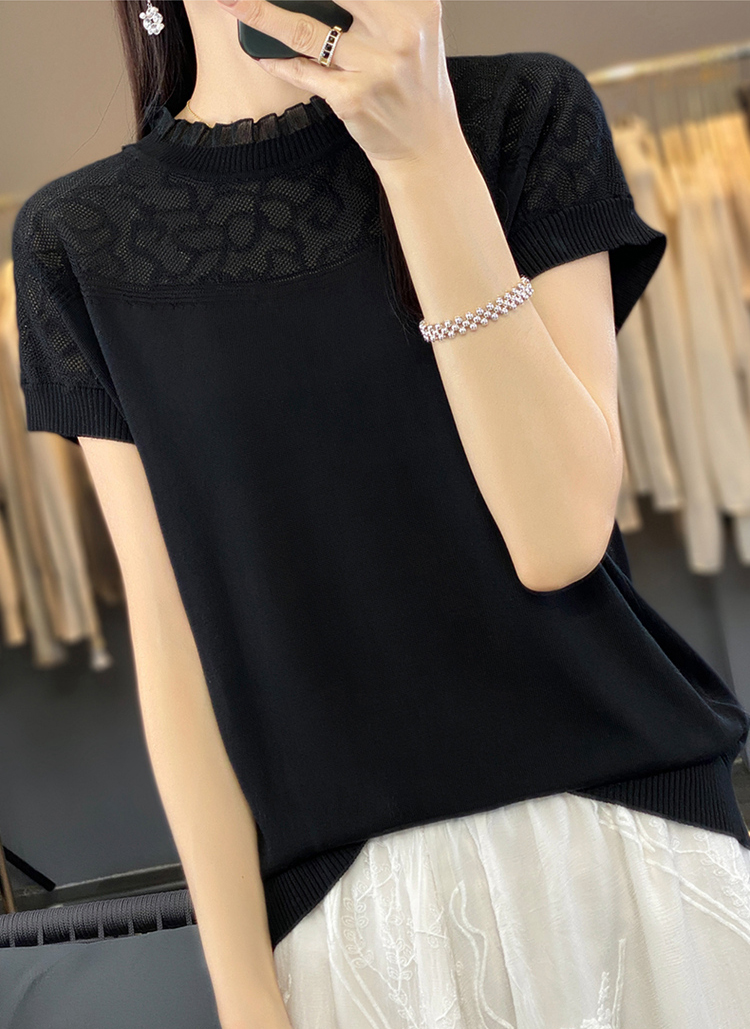 洋氣百搭拼接荷葉領鏤空短袖(6色)