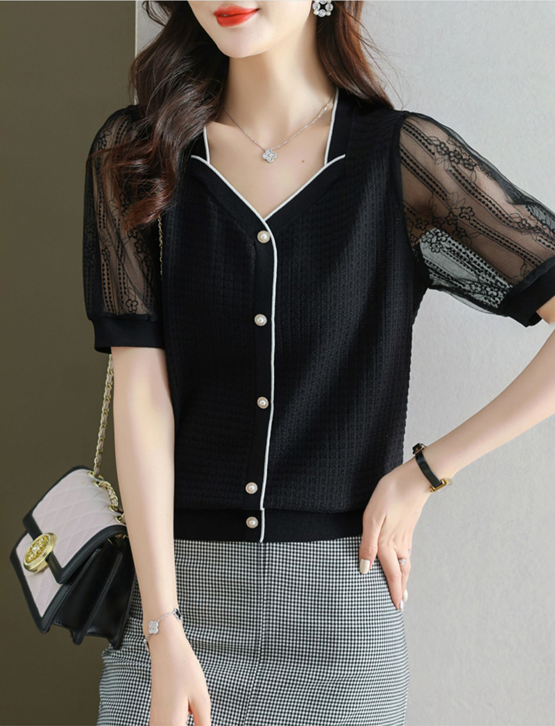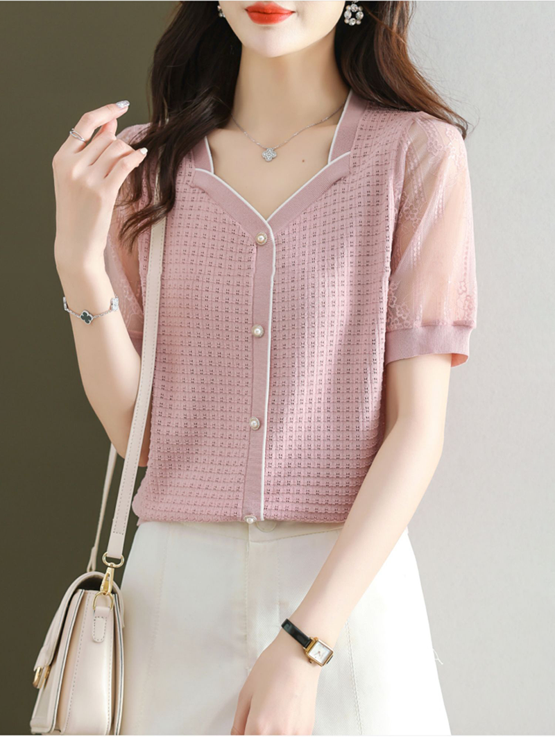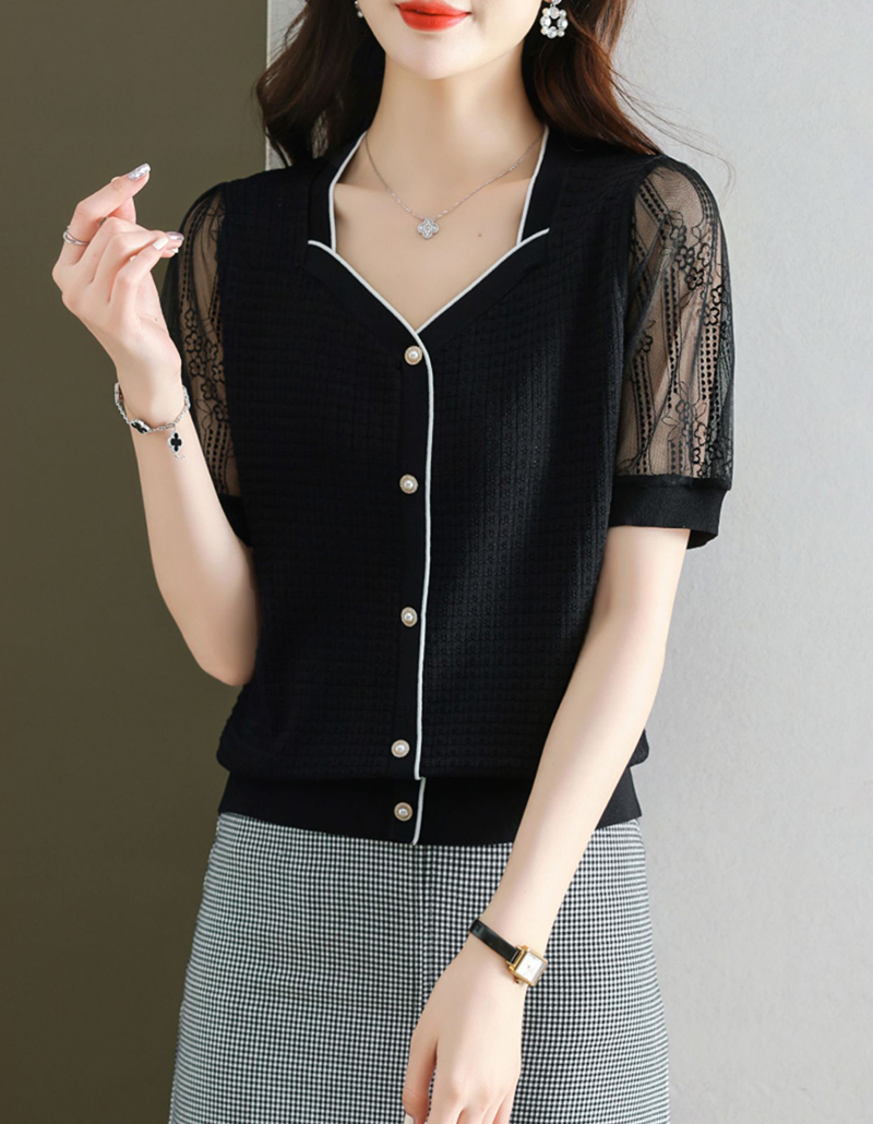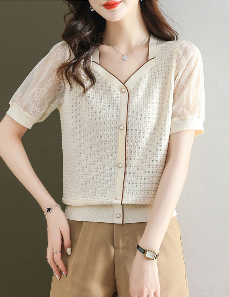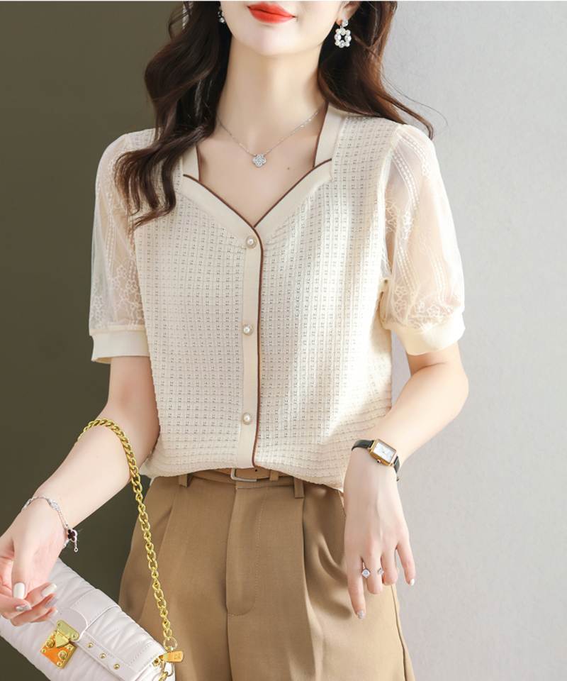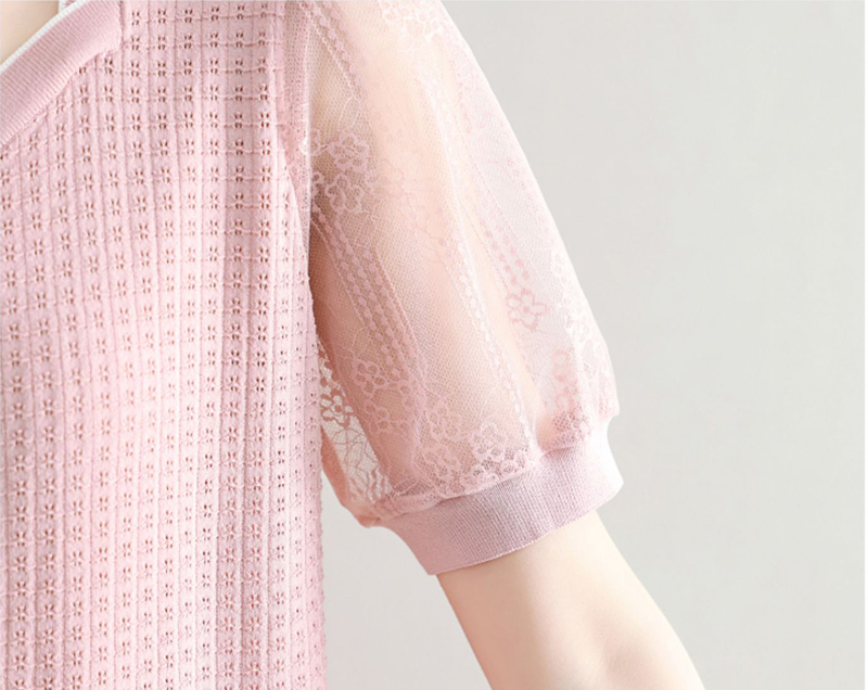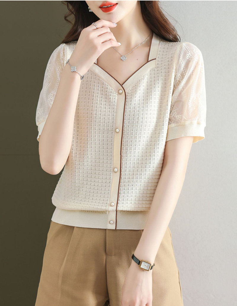法式方領拼接蕾絲短袖T恤小衫(4色)