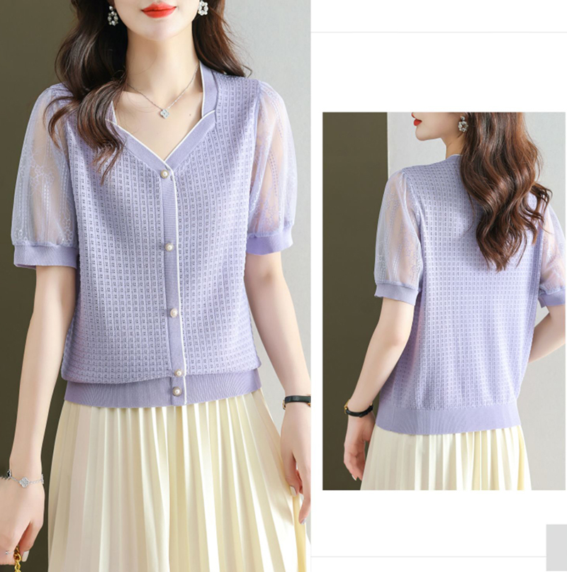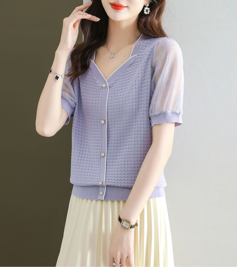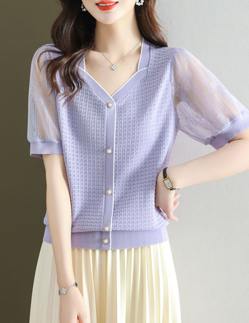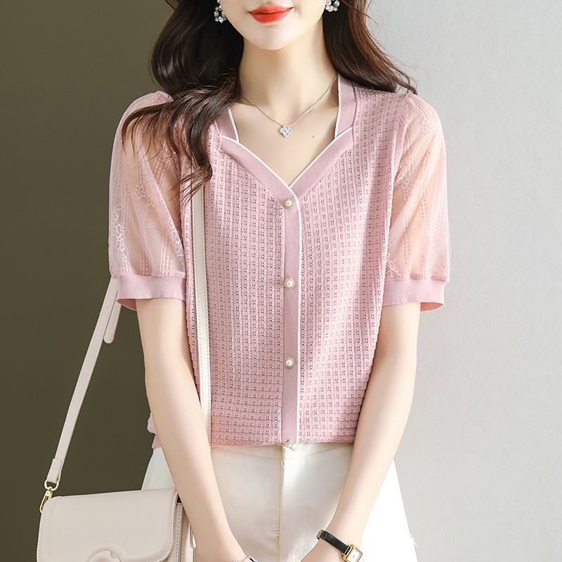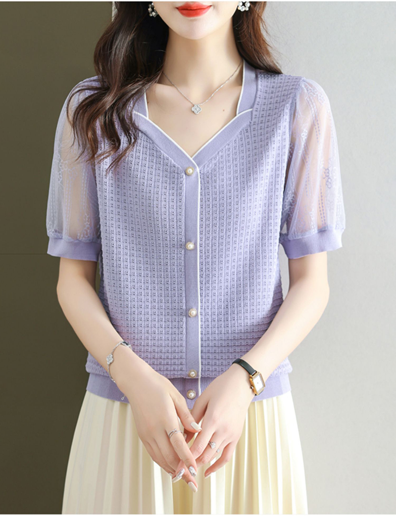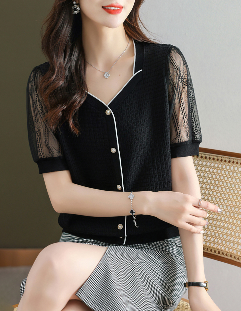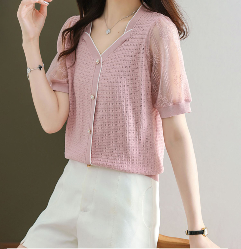 法式方領拼接蕾絲短袖T恤小衫(4色)