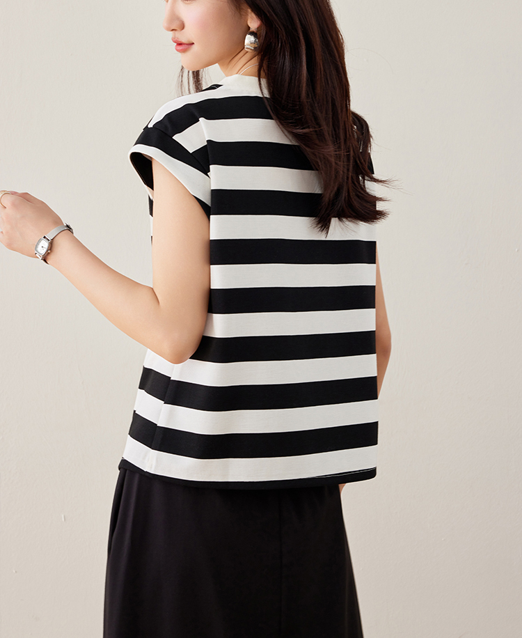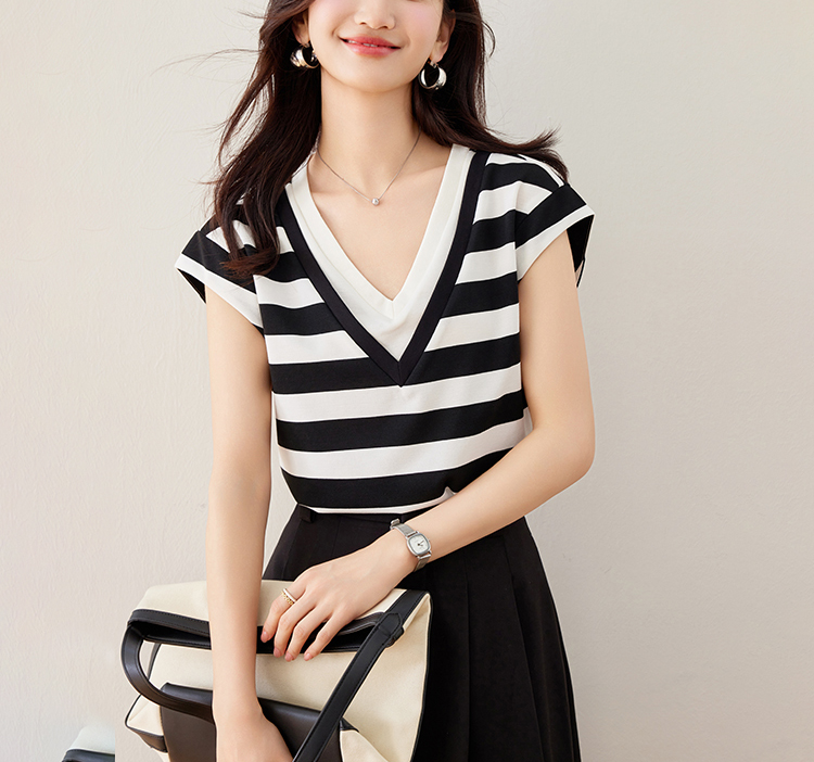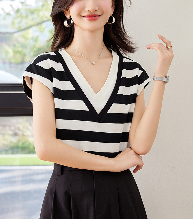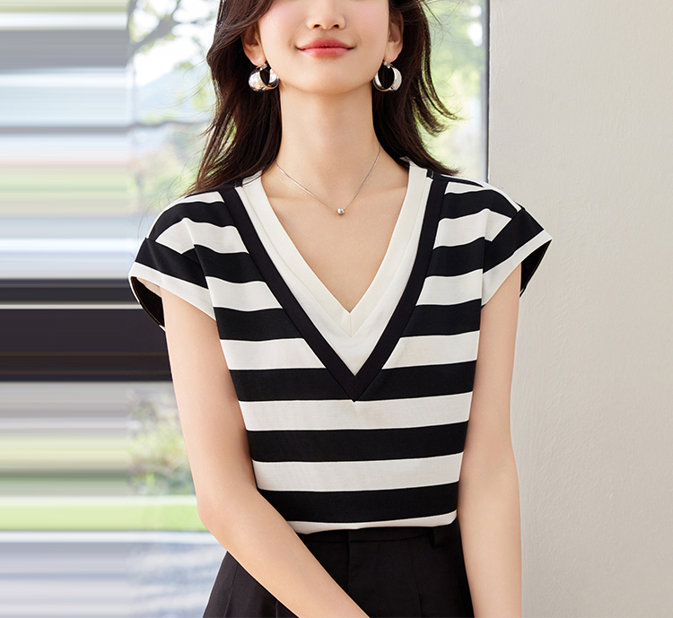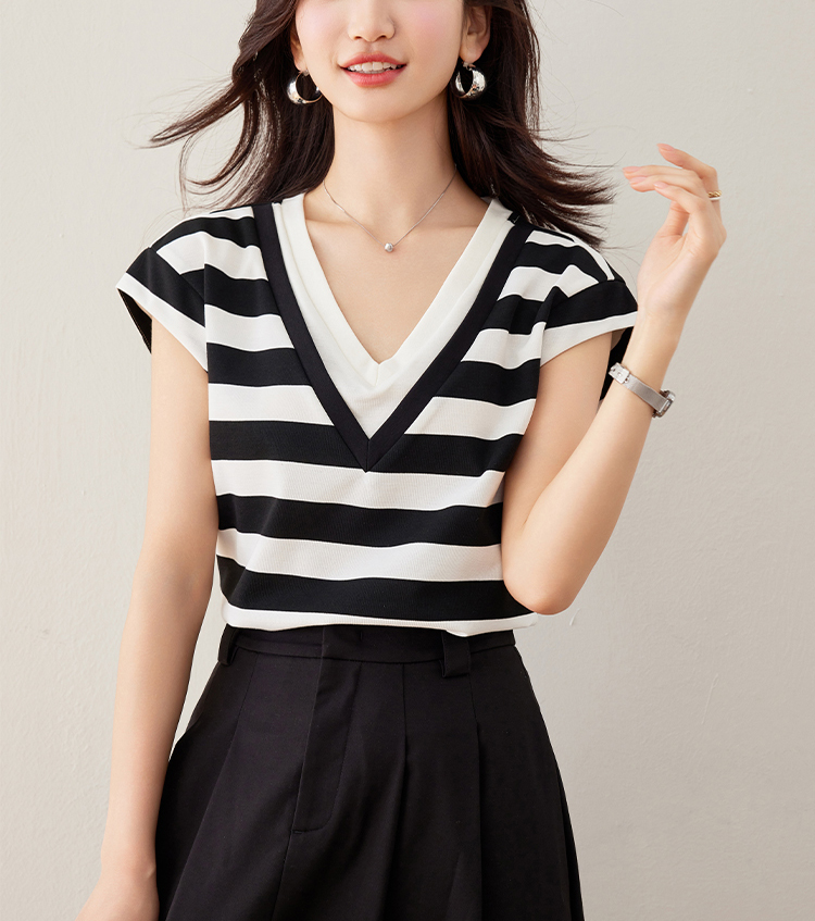 韓系假兩件V領拼色短袖T恤