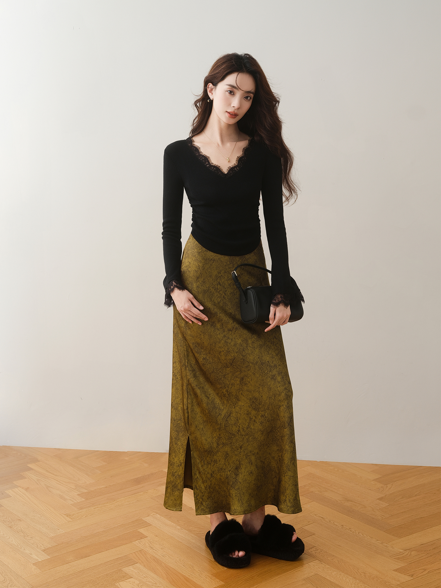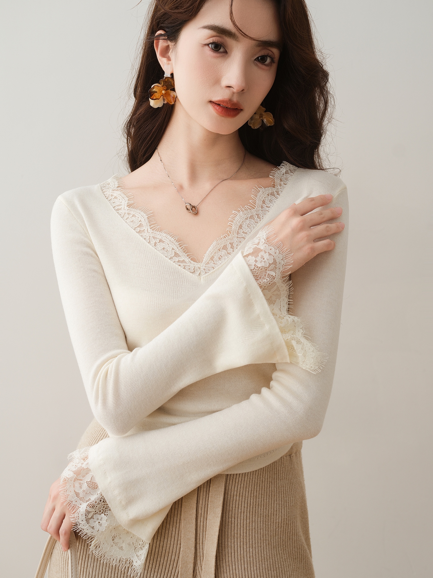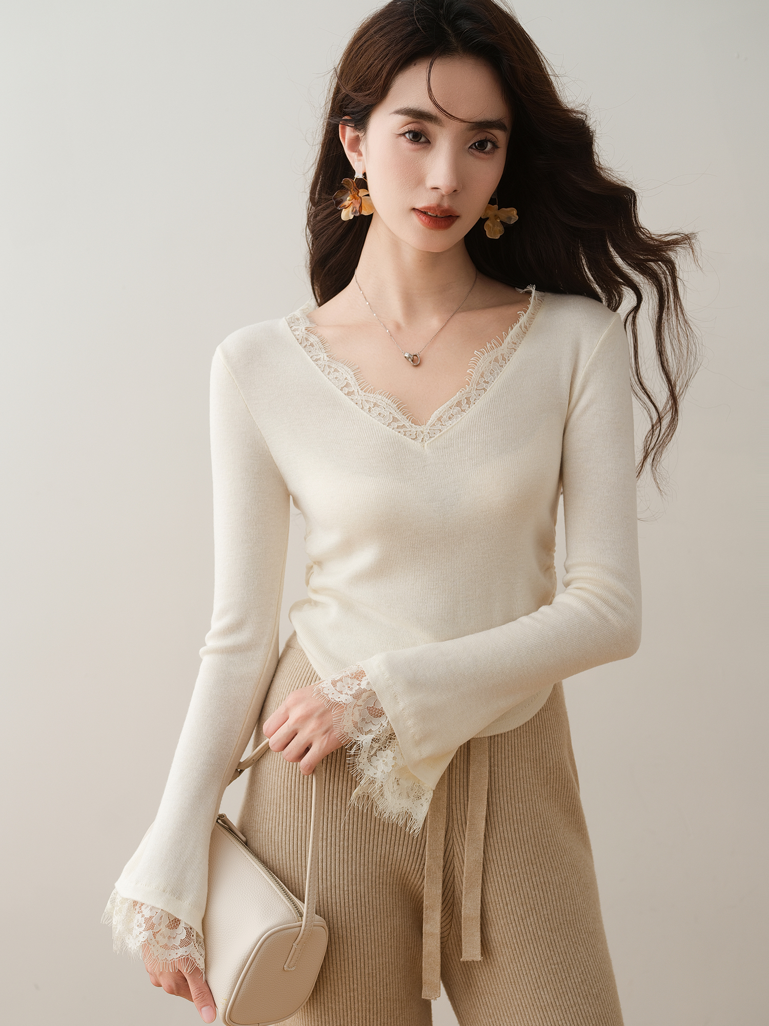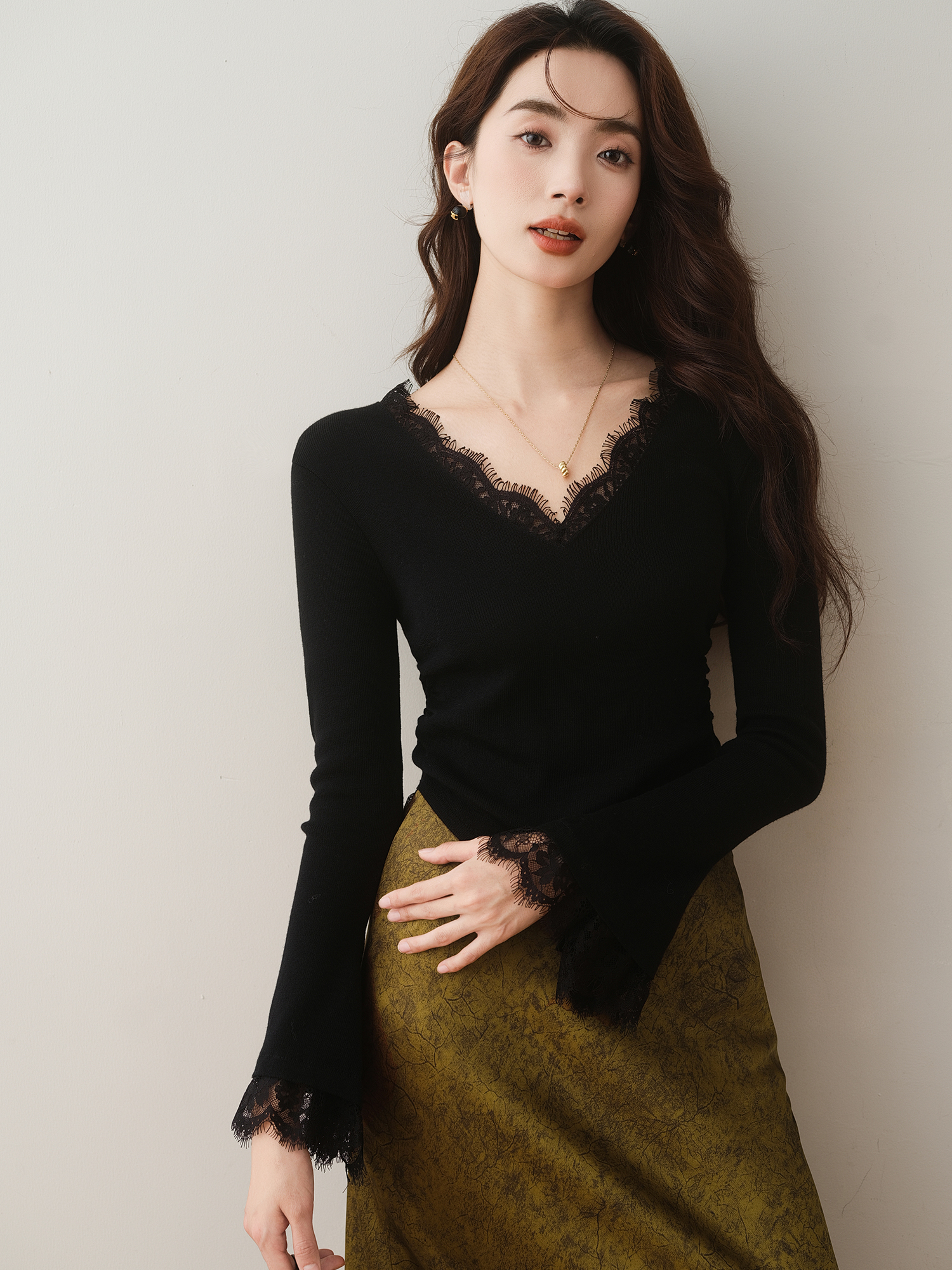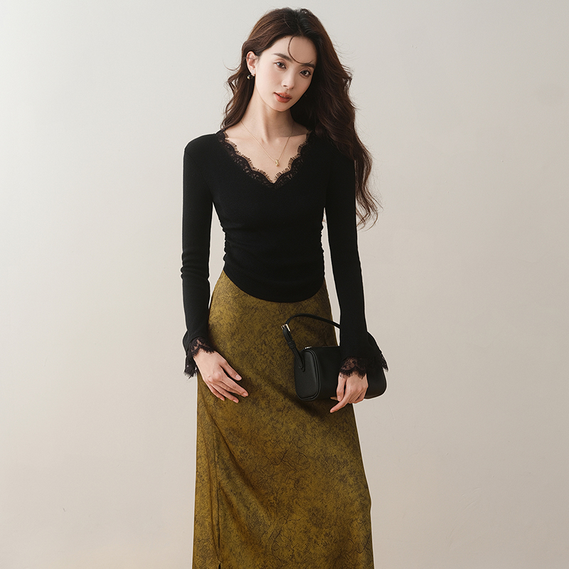 蕾絲拼接V領褶皺喇叭袖修身針織衫(2色)