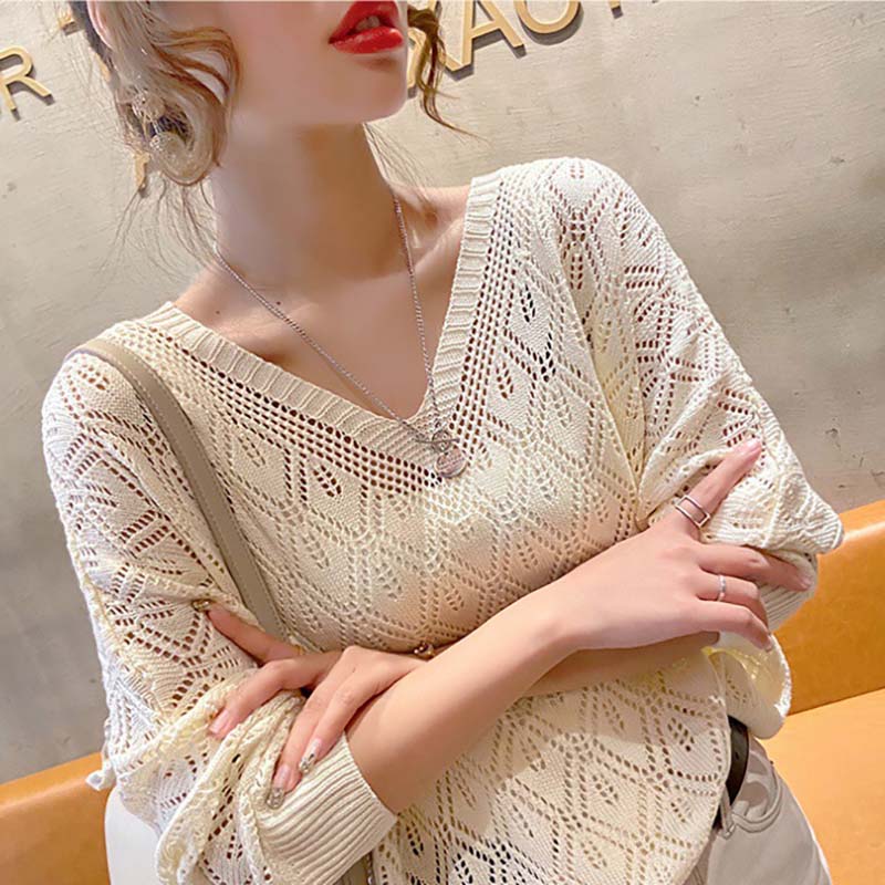 寬鬆V領鉤花鏤空蝙蝠袖針織衫(4色)