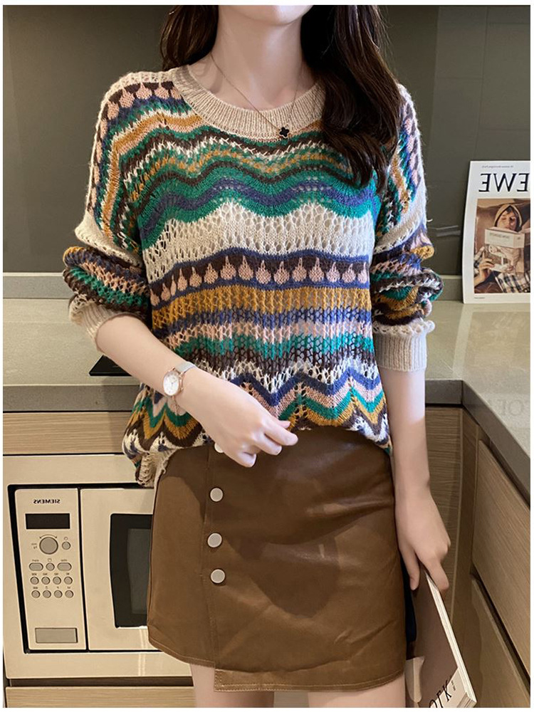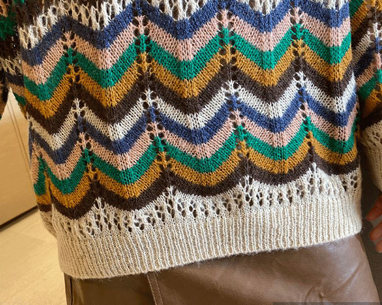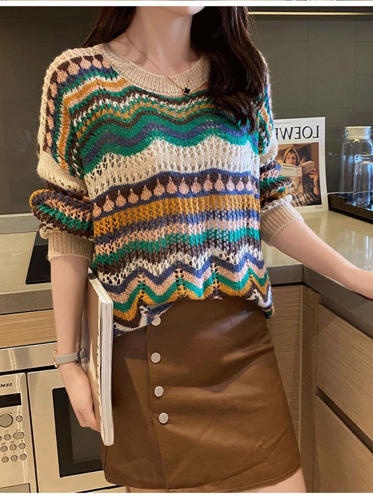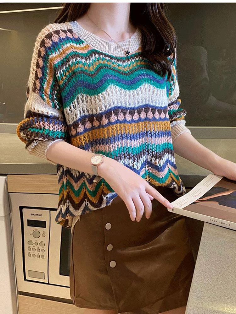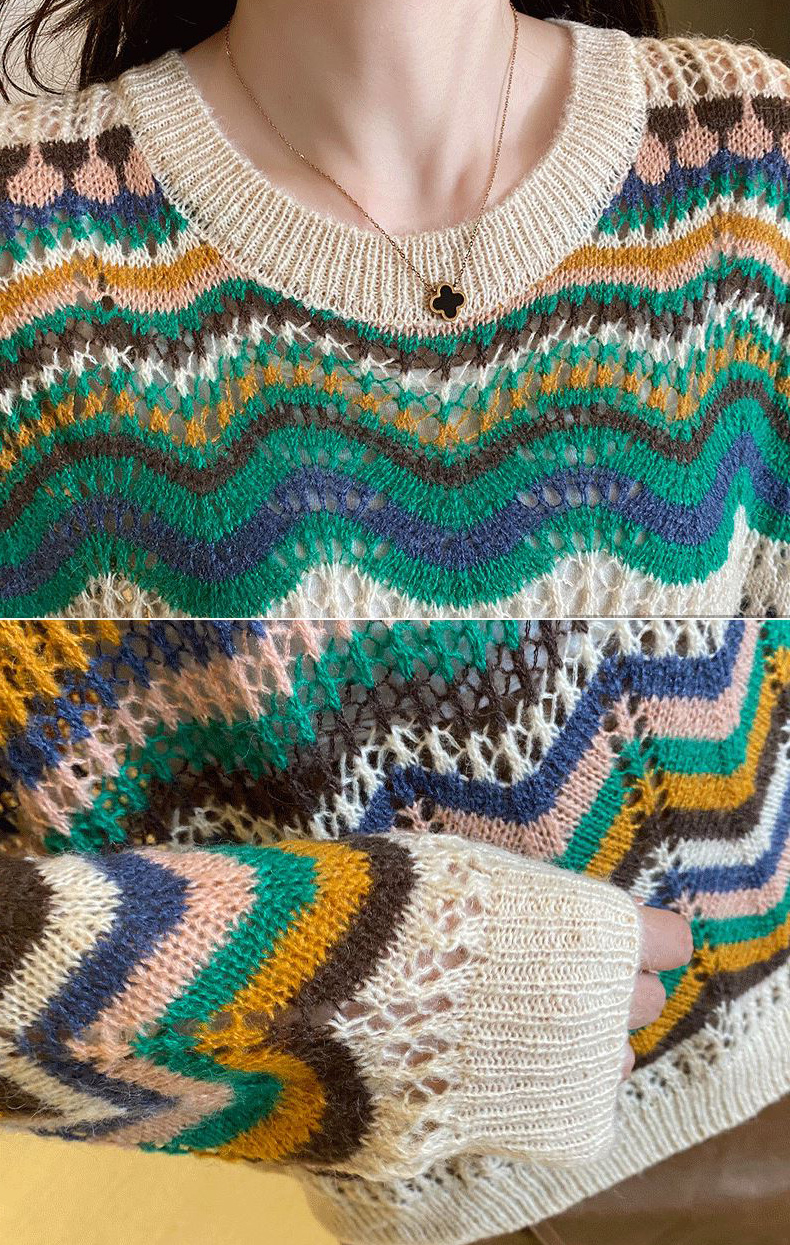條紋撞擊色鏤空薄版針織衫(2色)