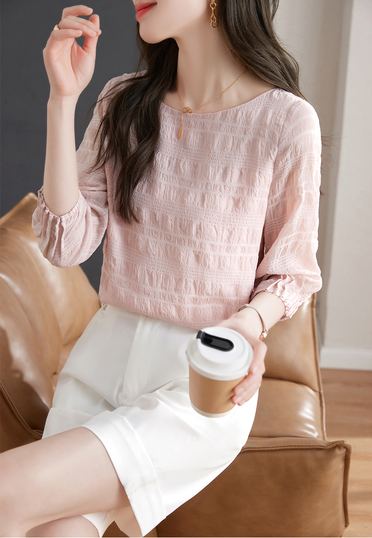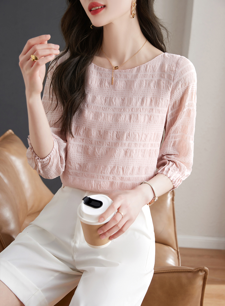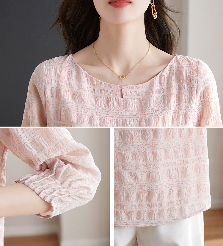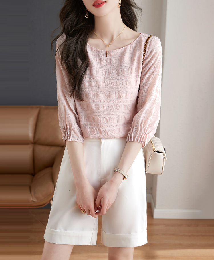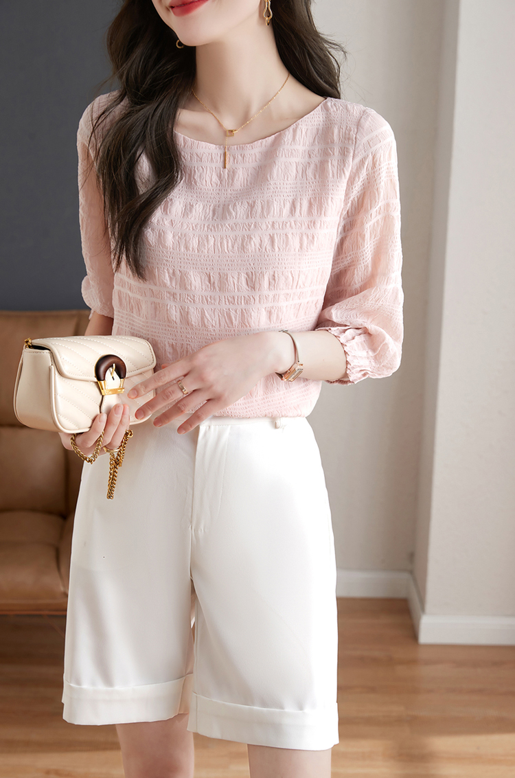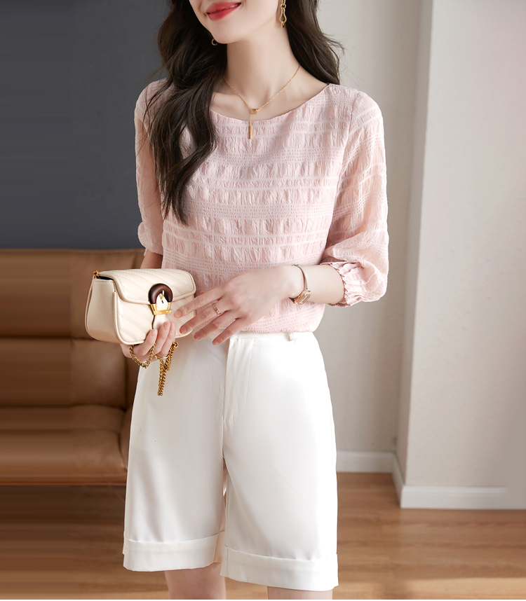 甜系圓領壓褶皺七分袖小衫