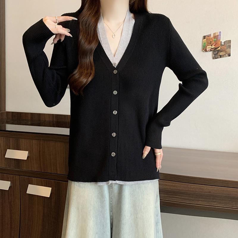 寬鬆V領假兩件針織開襟衫