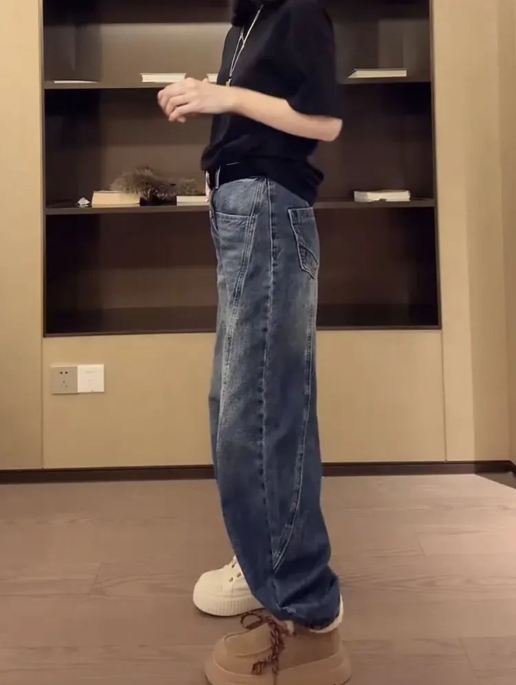 【S-4XL】秋冬顯瘦寬鬆直筒彎刀闊腿牛仔褲