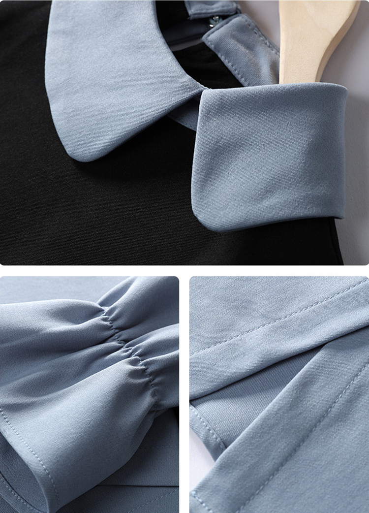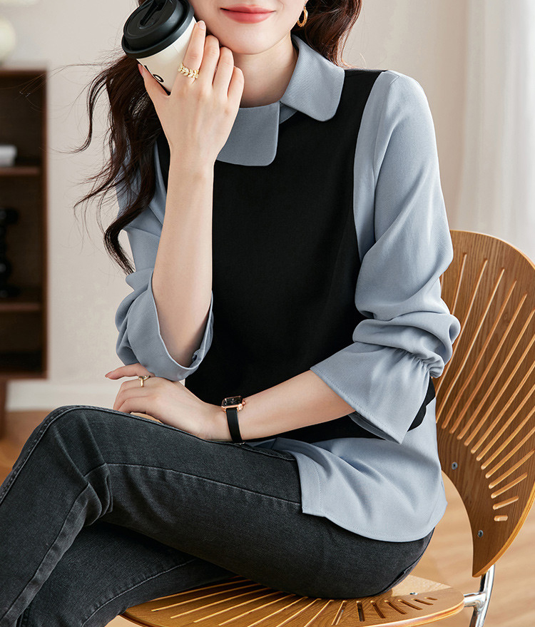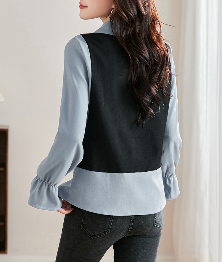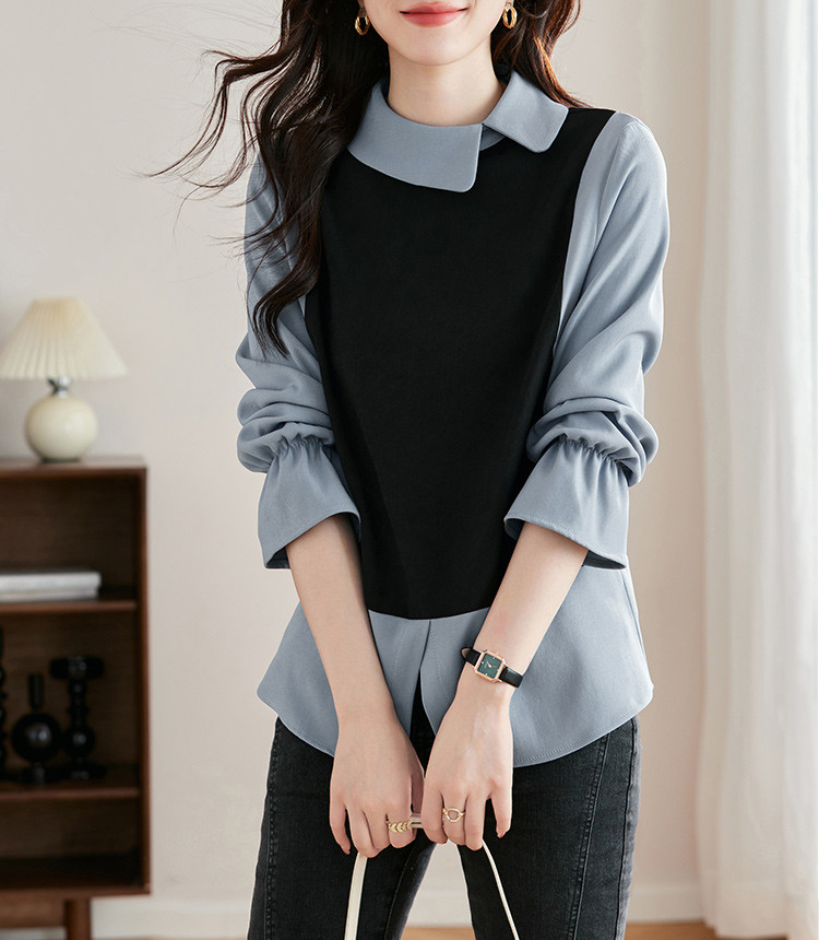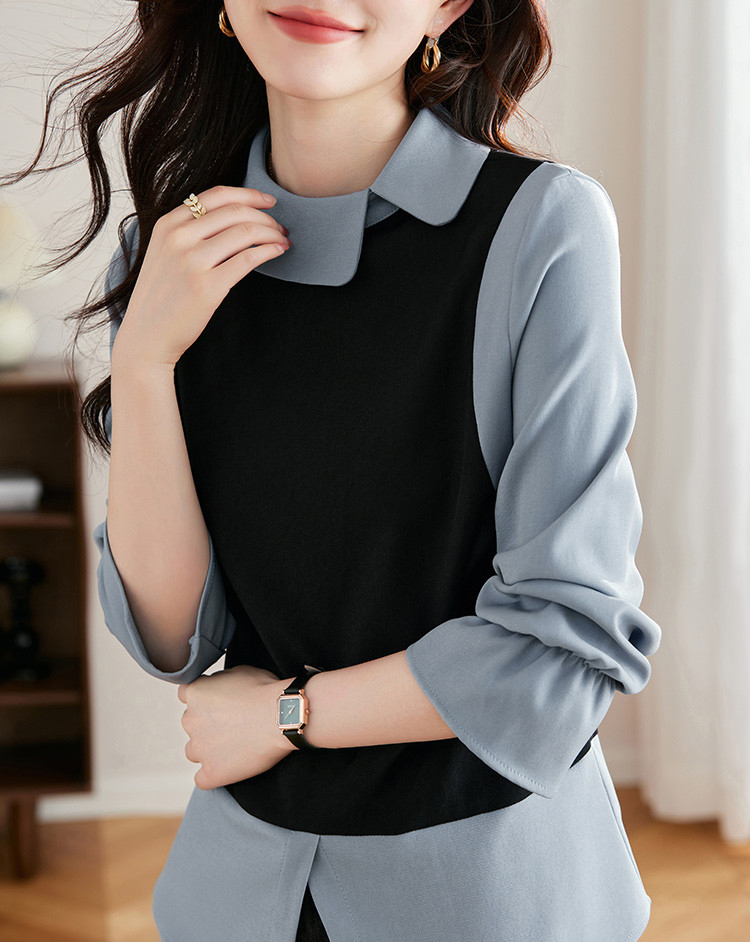 撞色娃娃領喇叭袖拼接假兩件襯衫