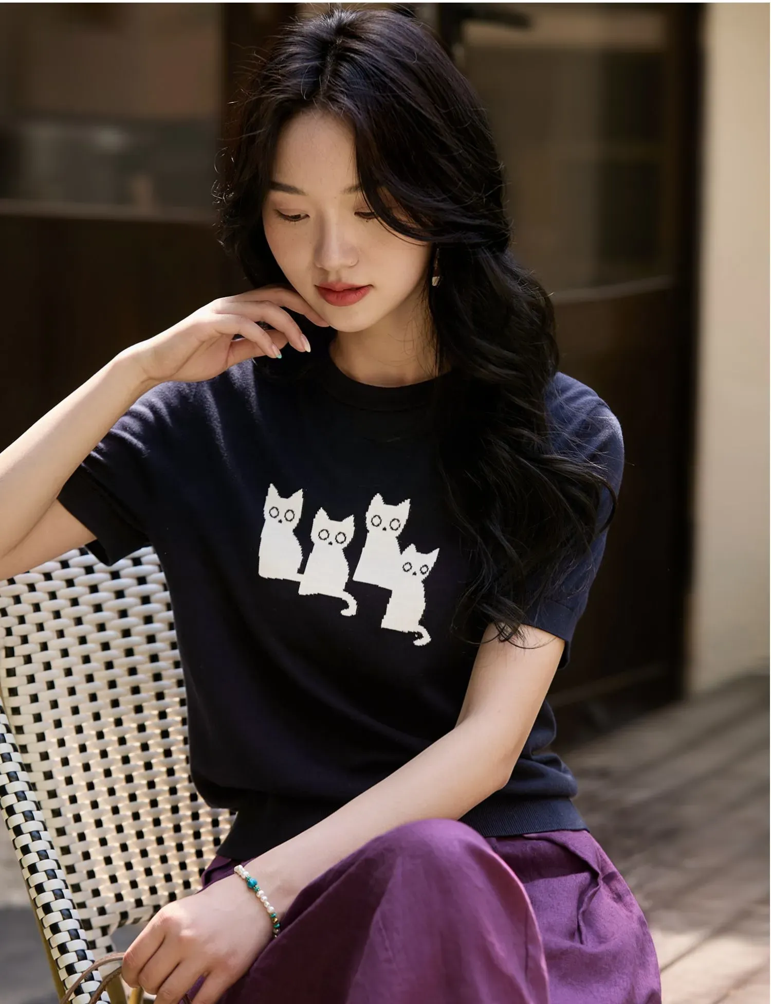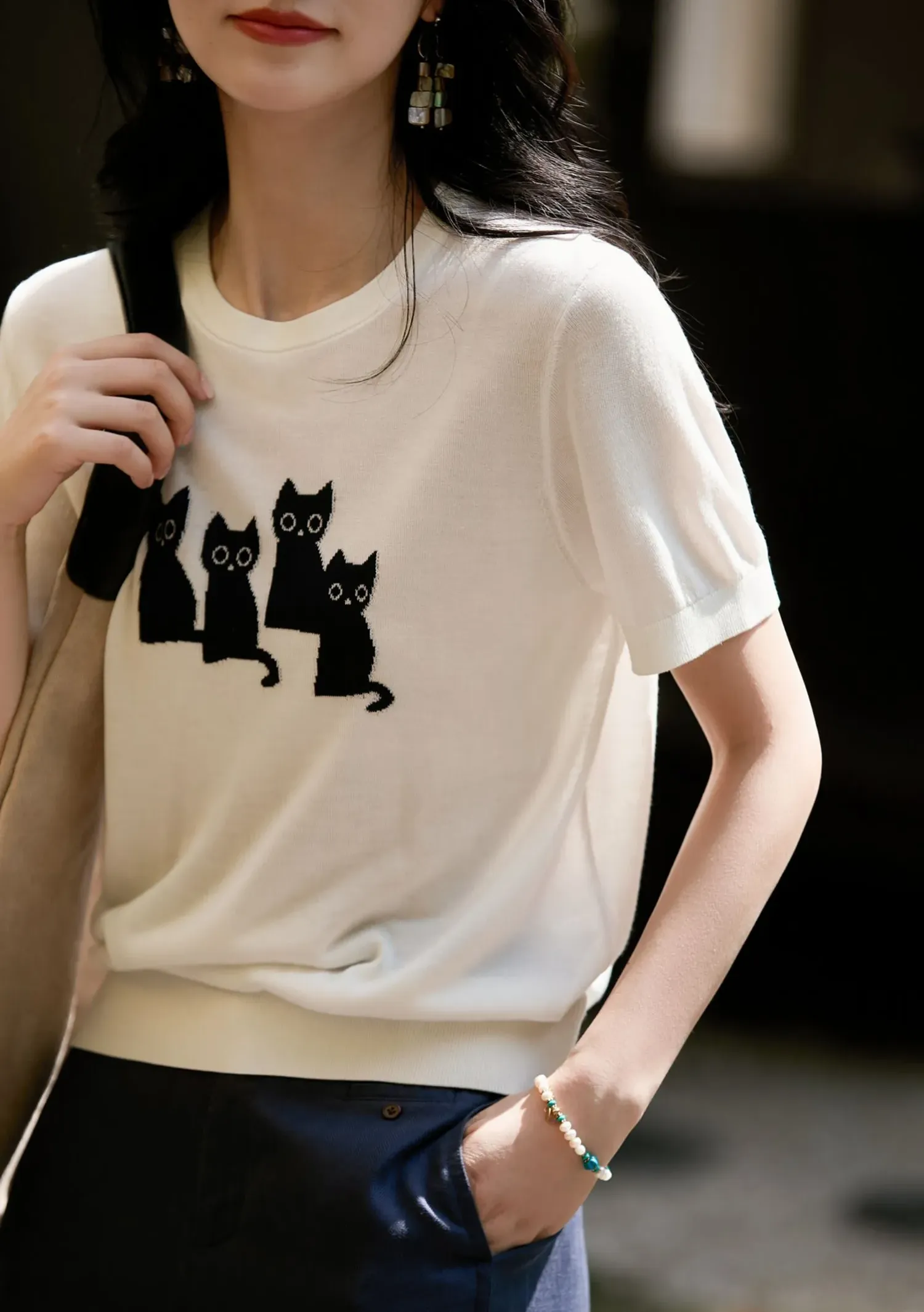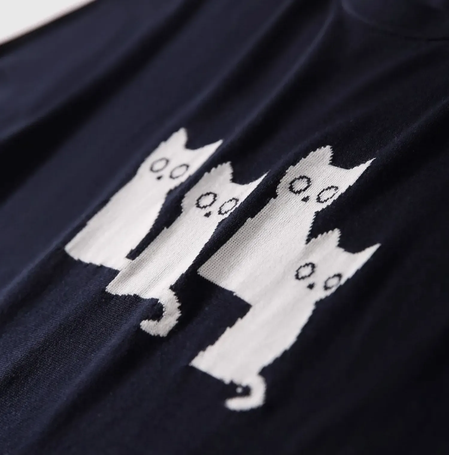 可愛貓咪圖案短袖針織T恤(2色)