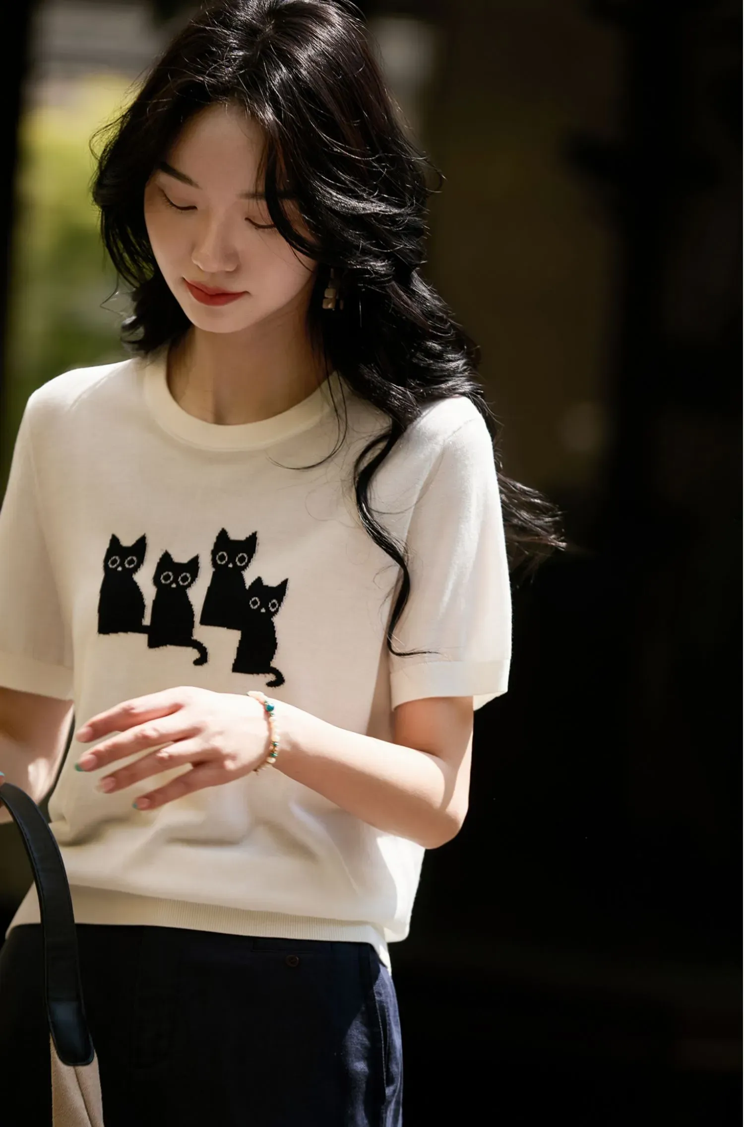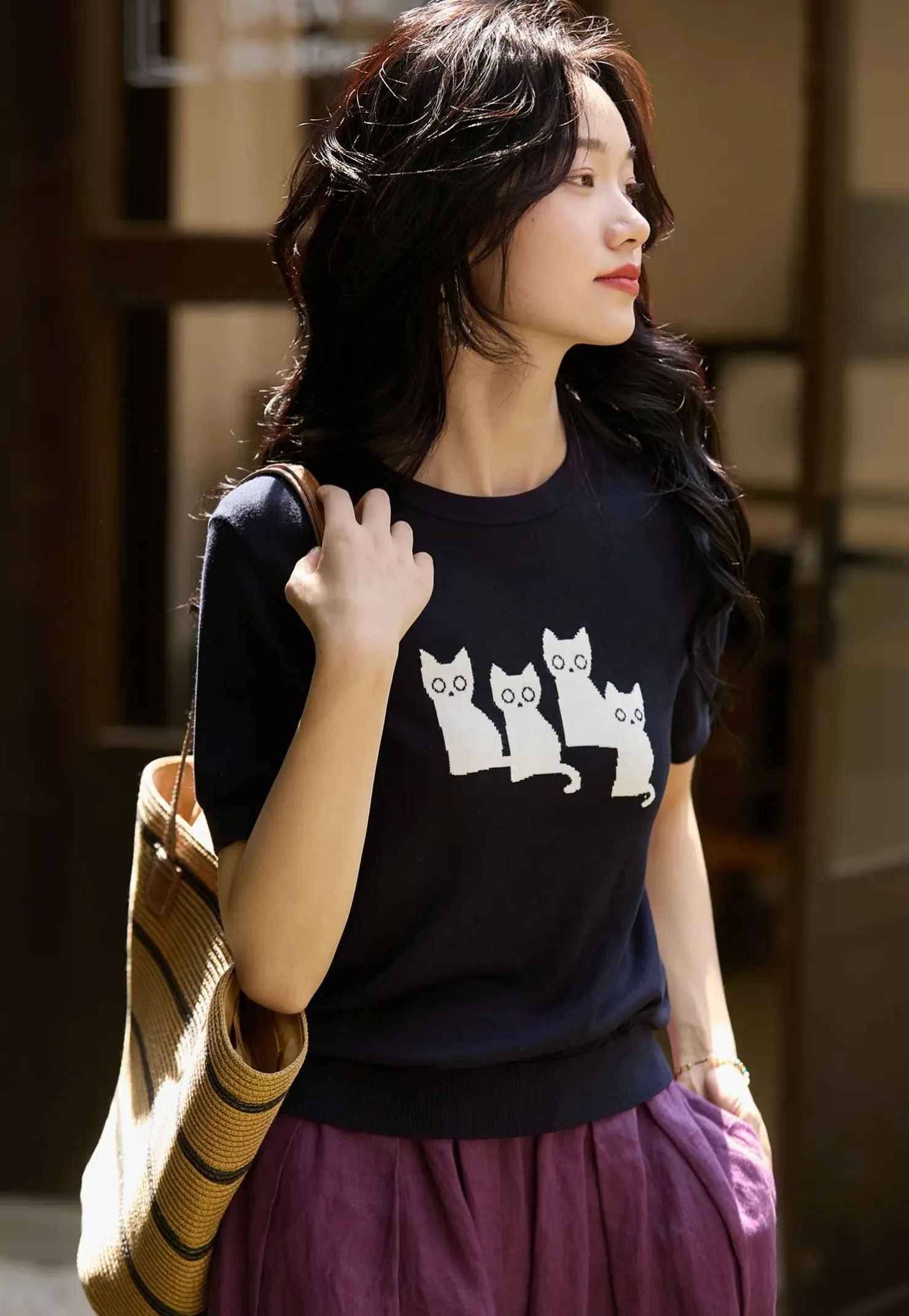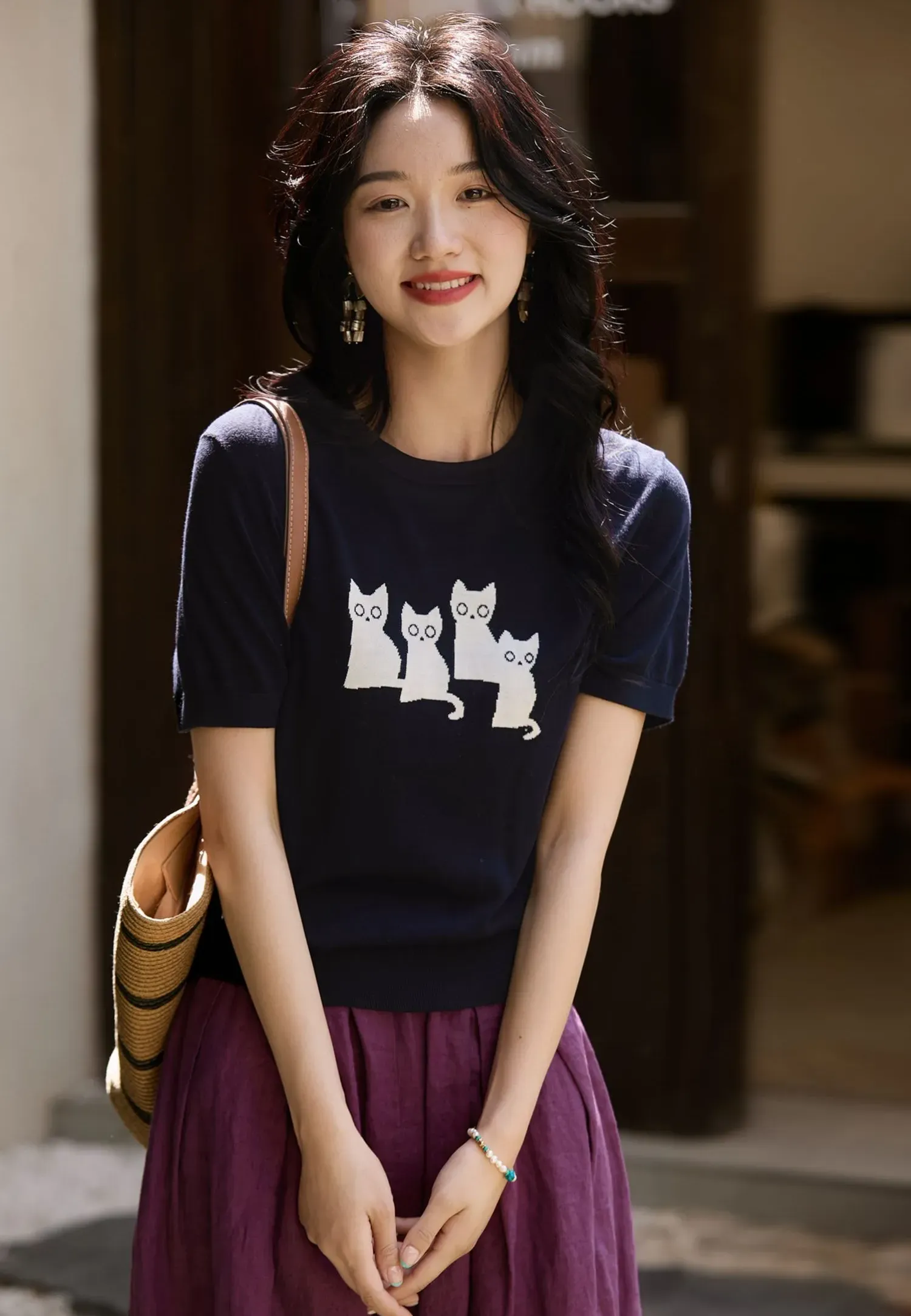 可愛貓咪圖案短袖針織T恤(2色)