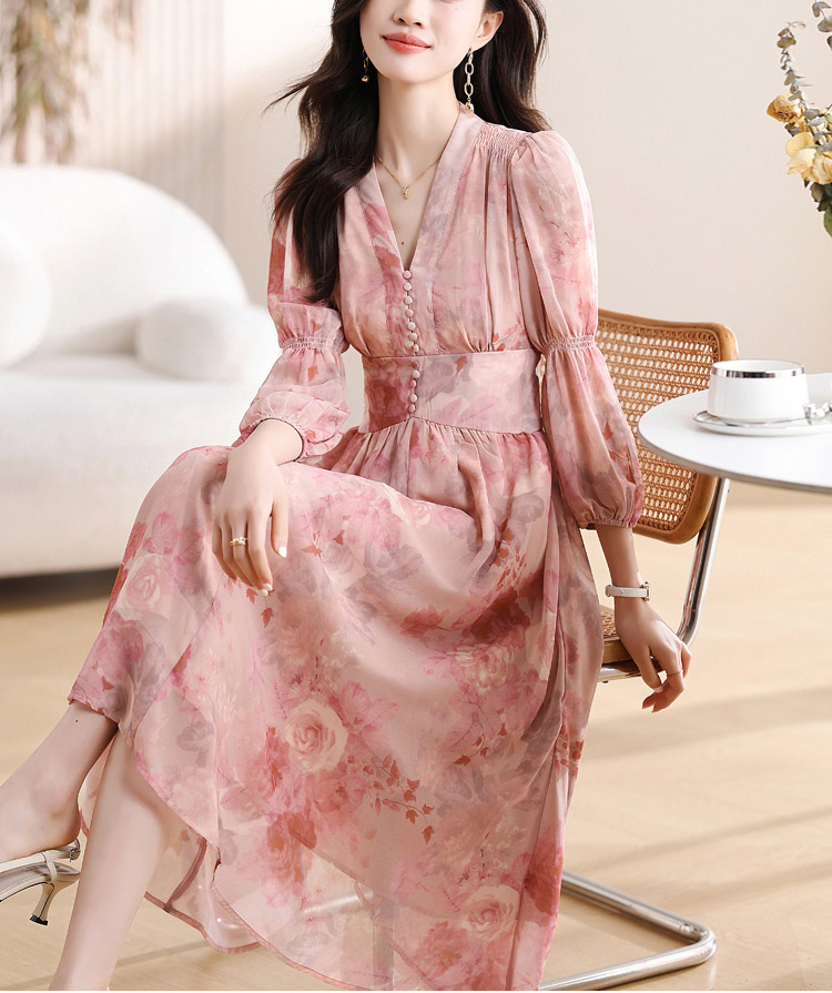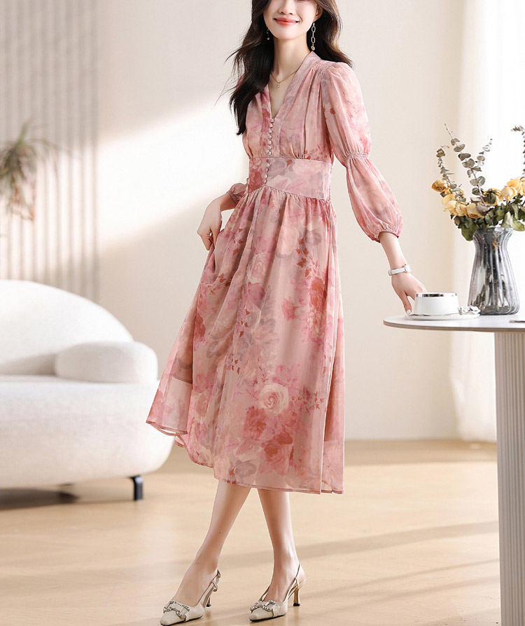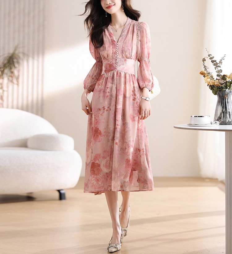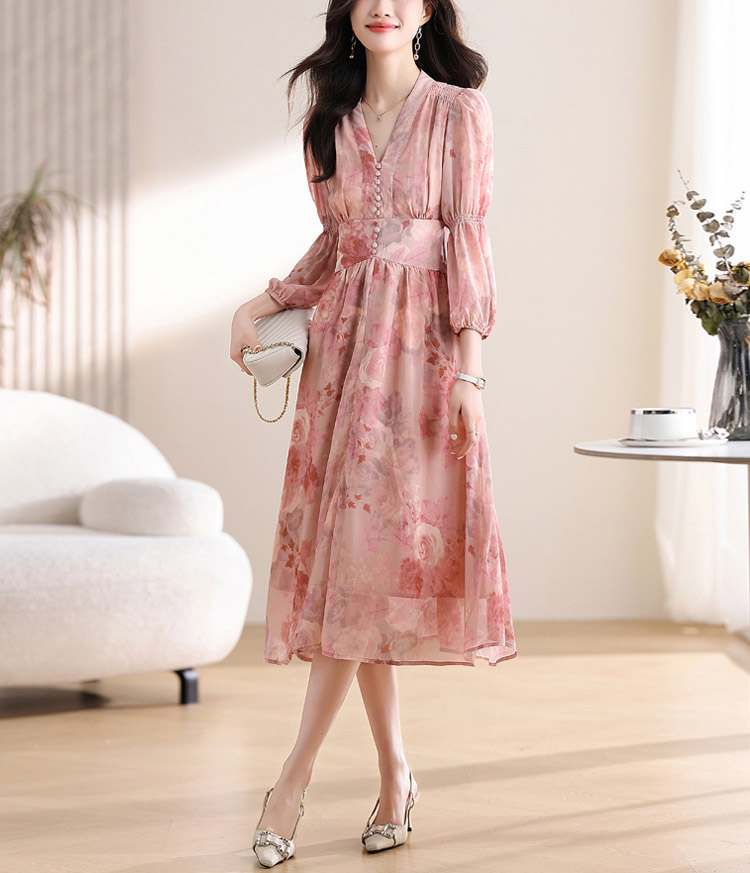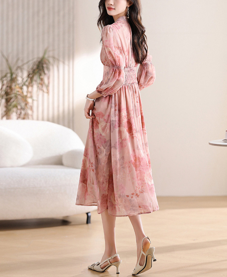 優雅收腰燈籠袖碎花連身裙