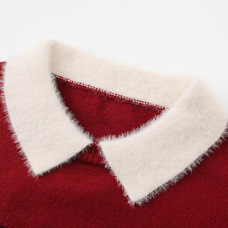 假两件撞色翻领提花针织衫