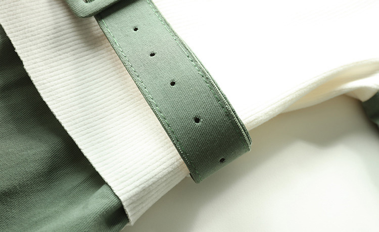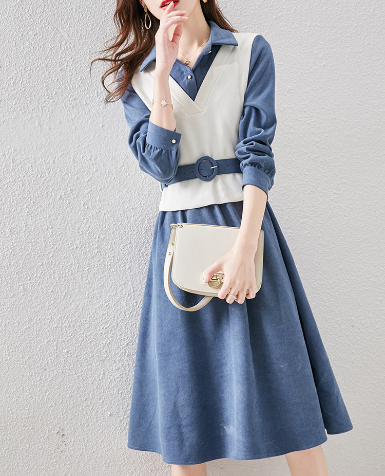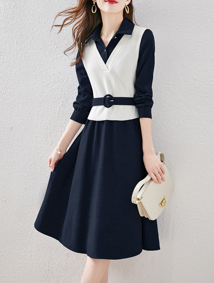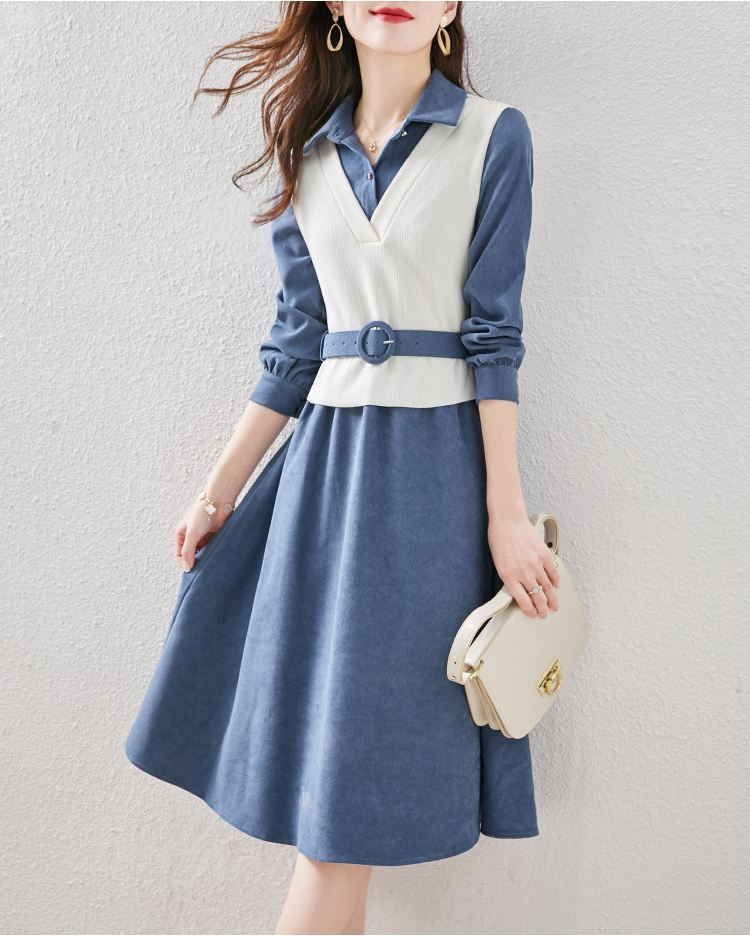 時尚韓版假兩件翻領腰帶收腰A字連身裙(3色)