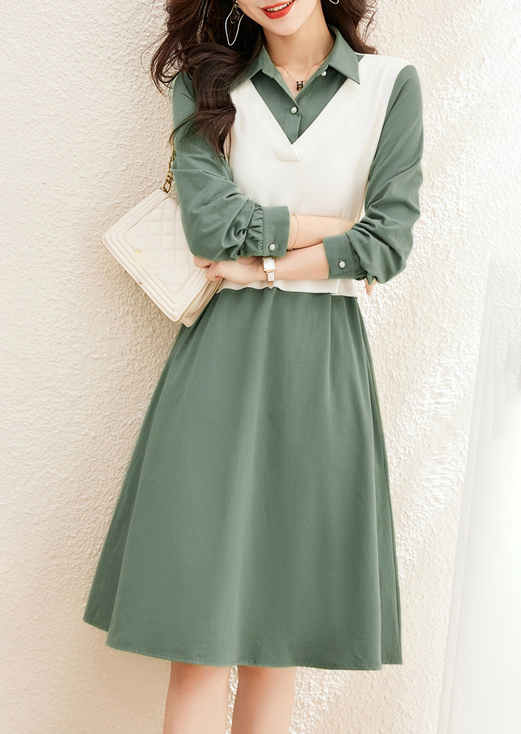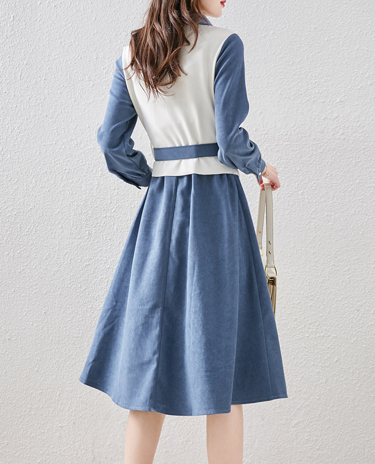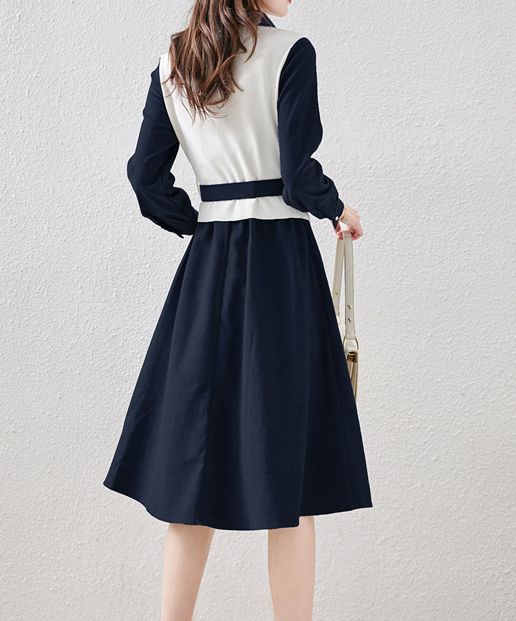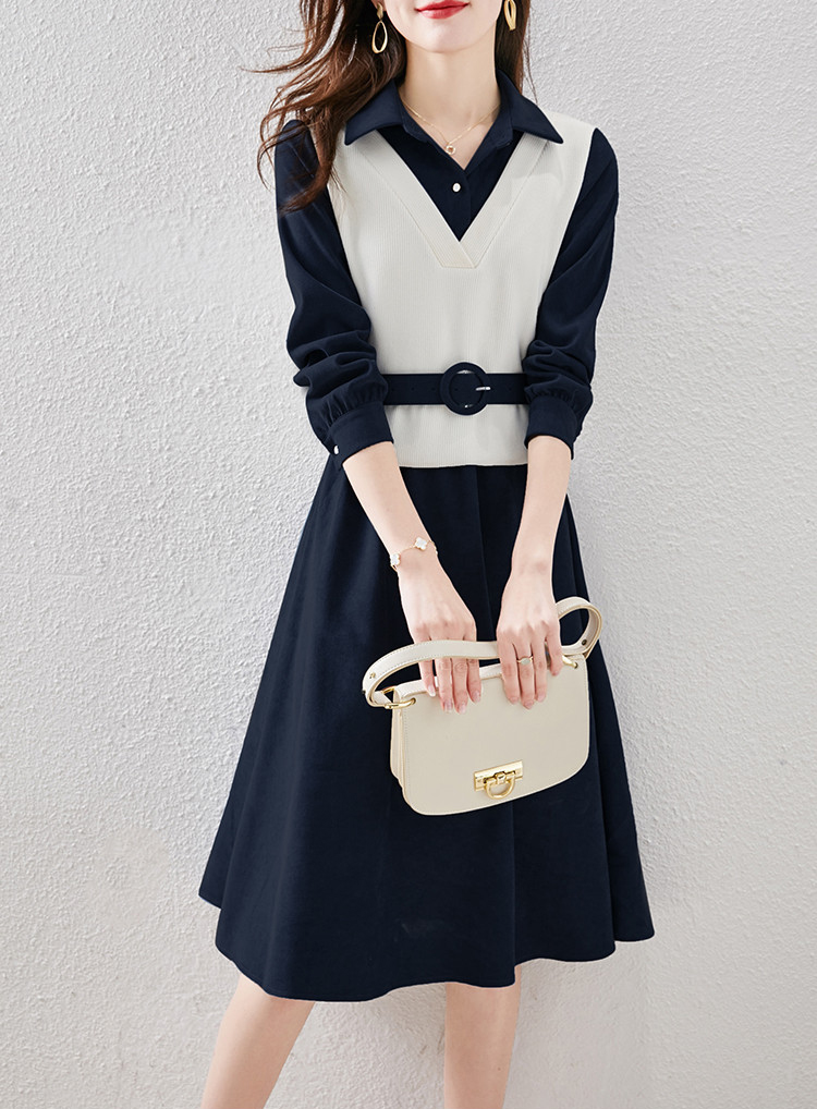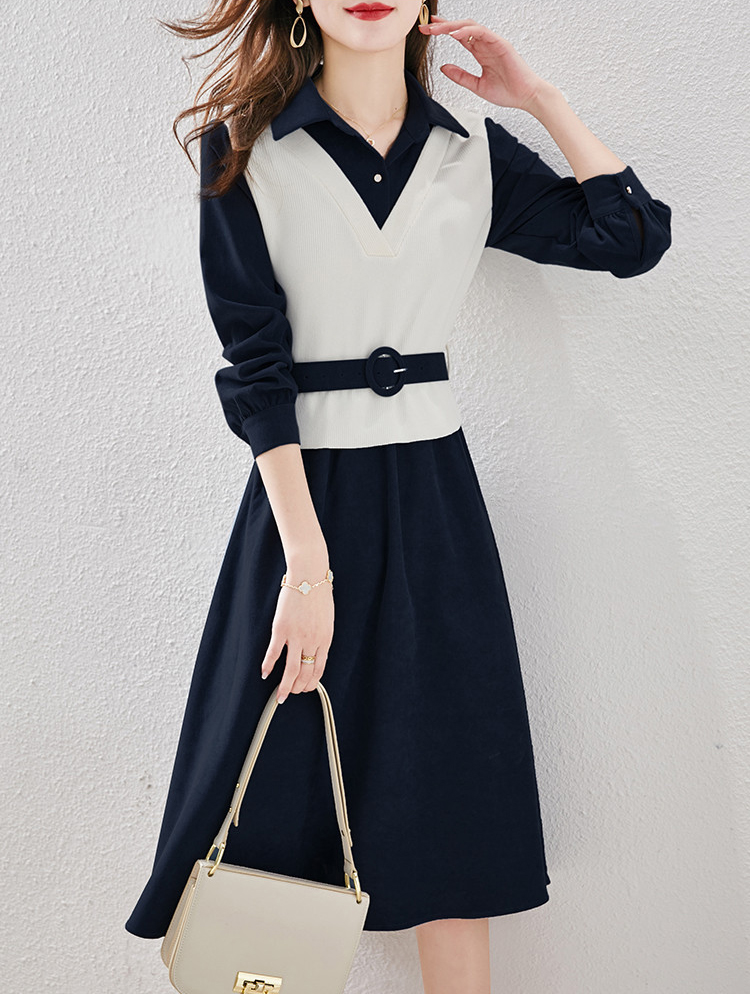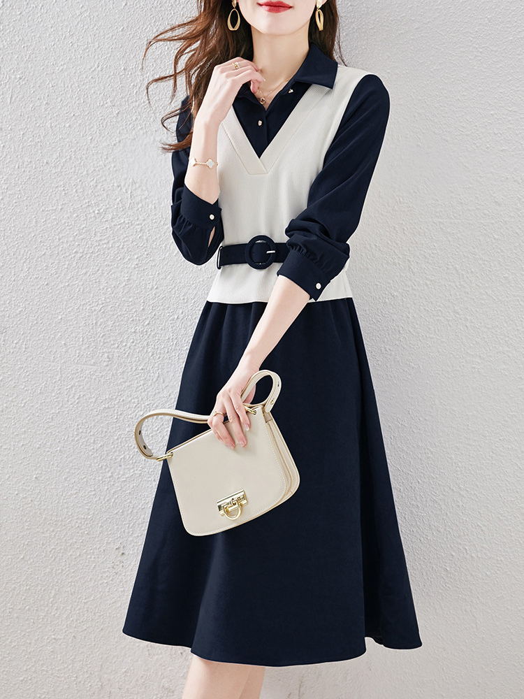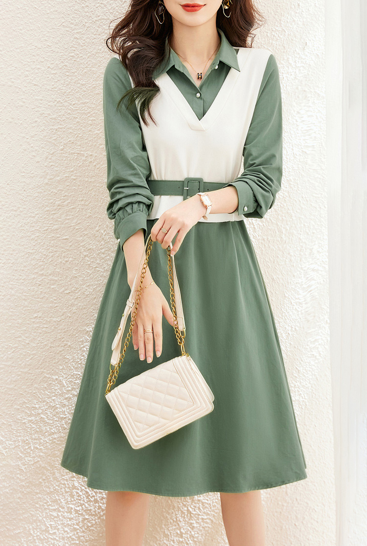 韓系假兩件翻領腰帶收腰A字連身裙(3色)