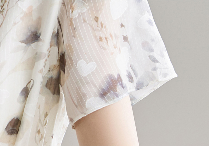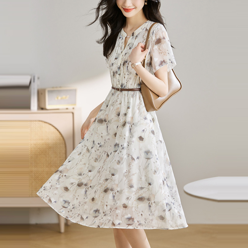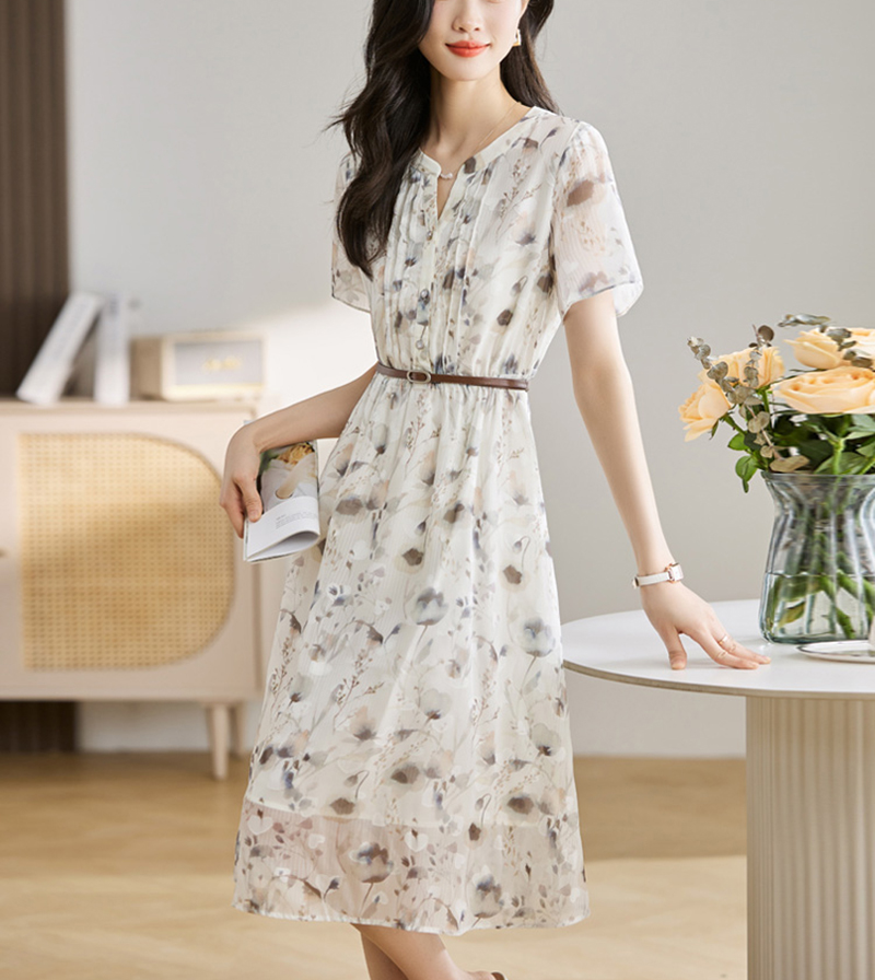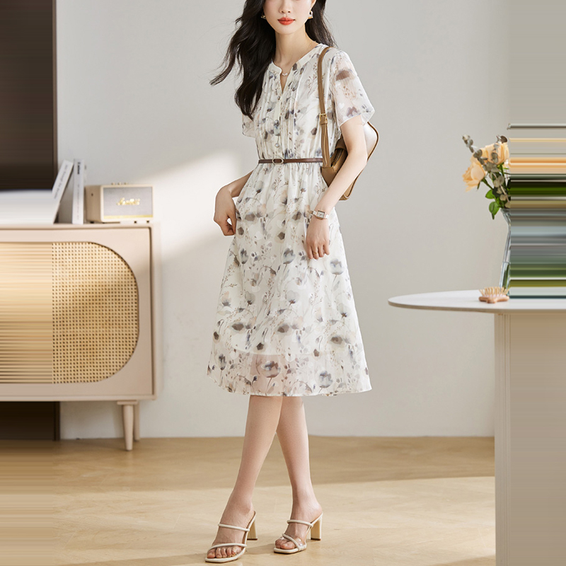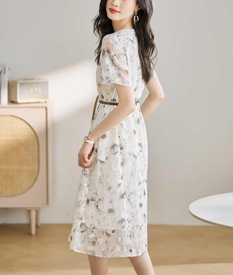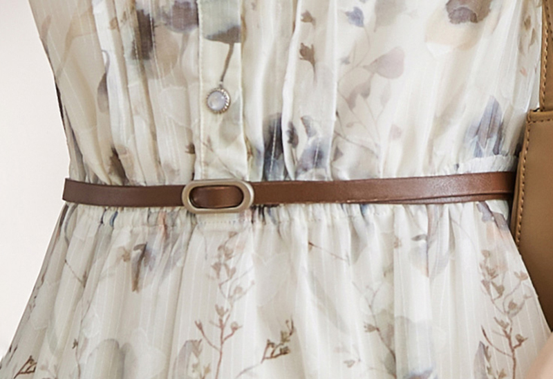 法式桔梗水墨印花收腰連身裙【贈皮帶】