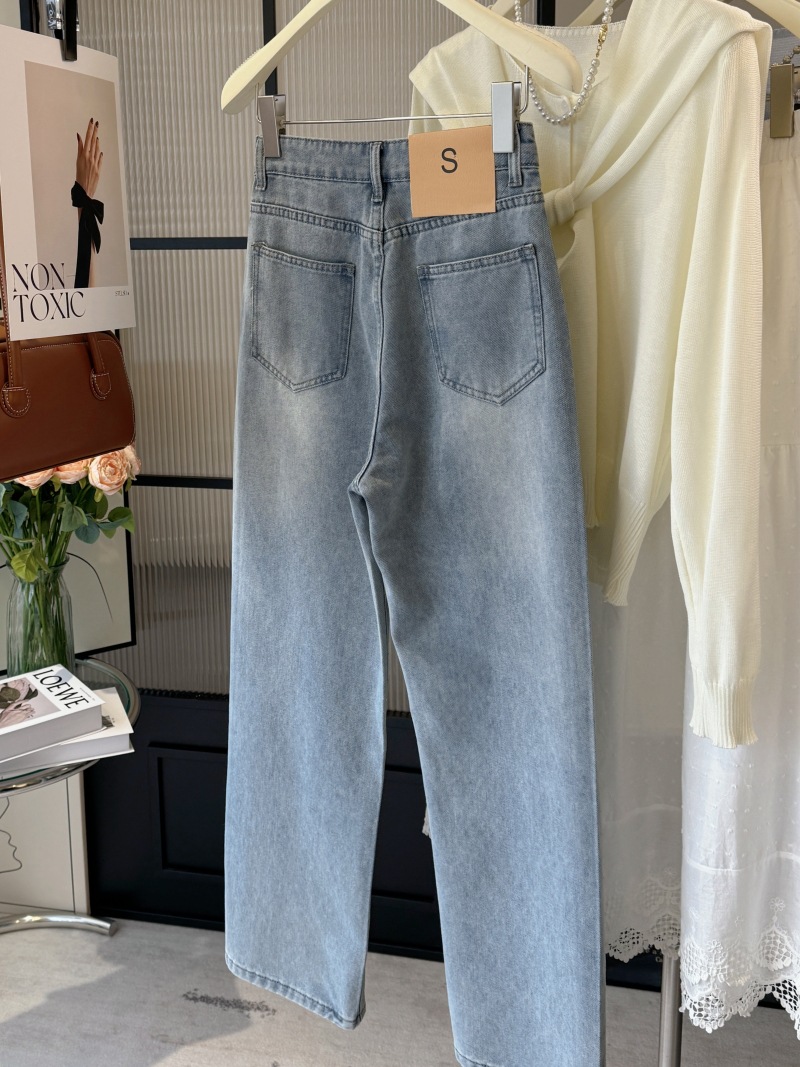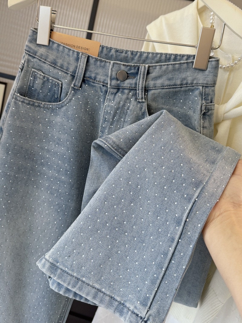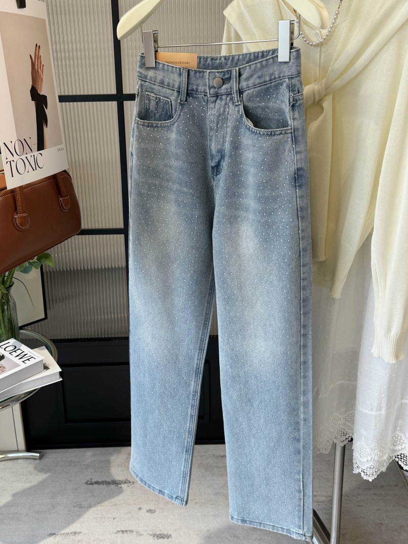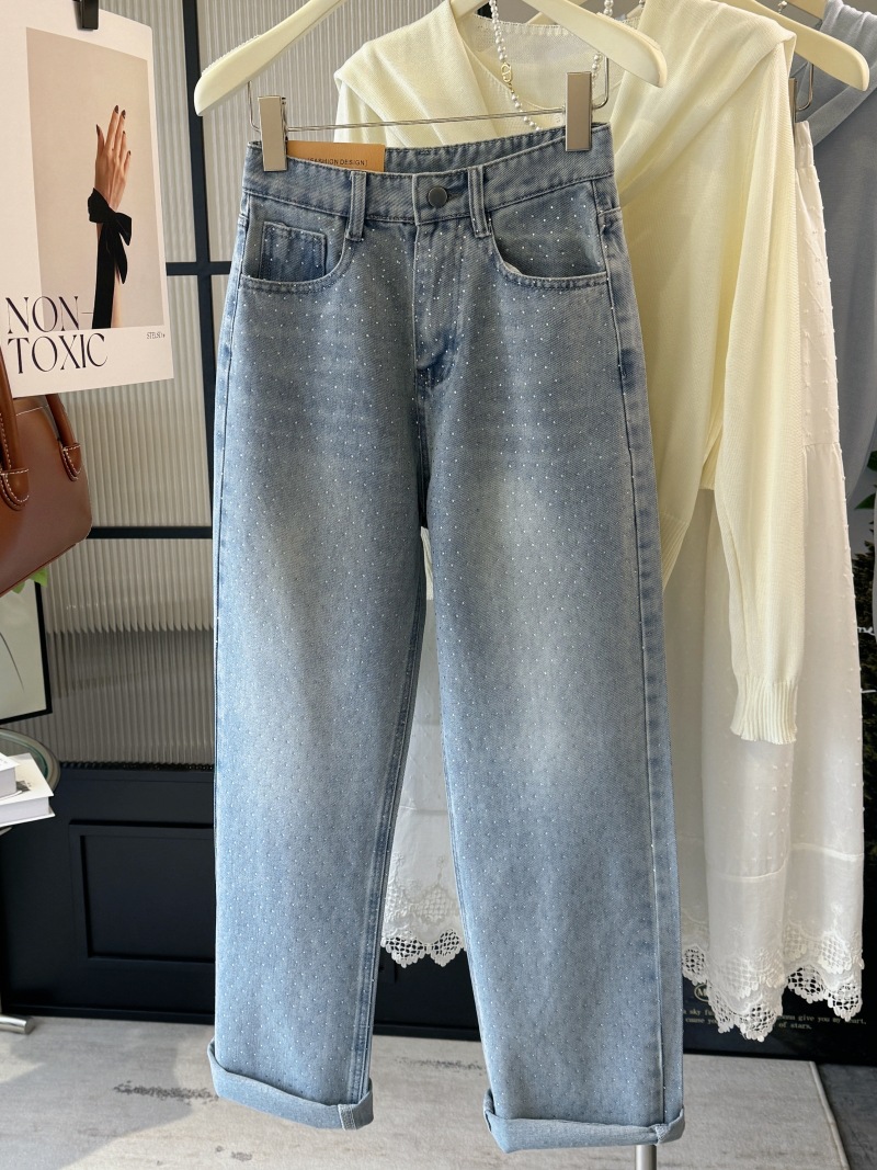 重工燙鑽高腰直筒牛仔褲