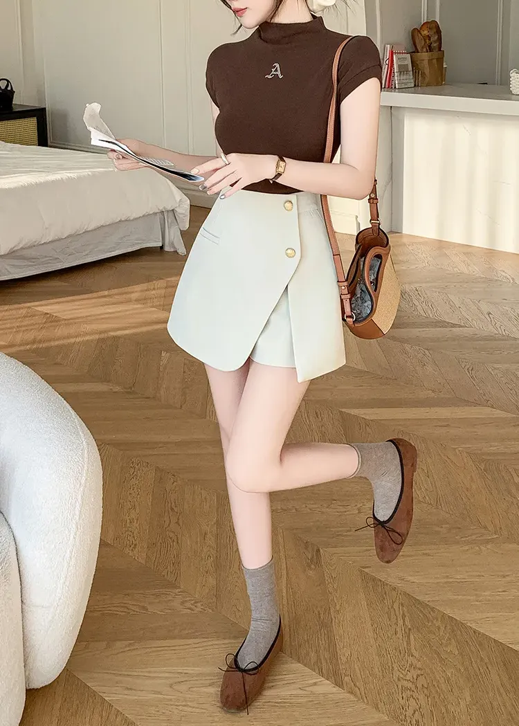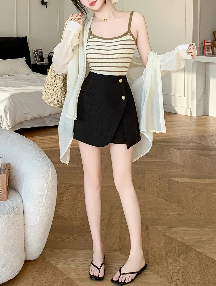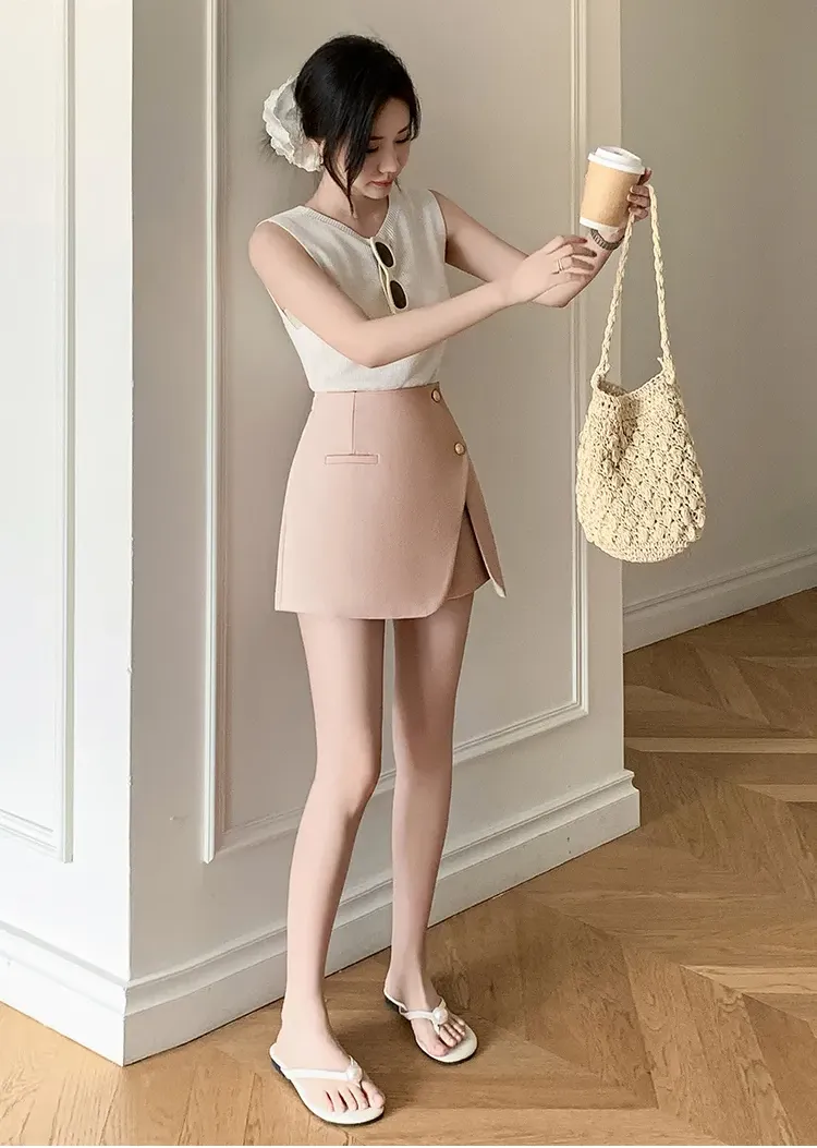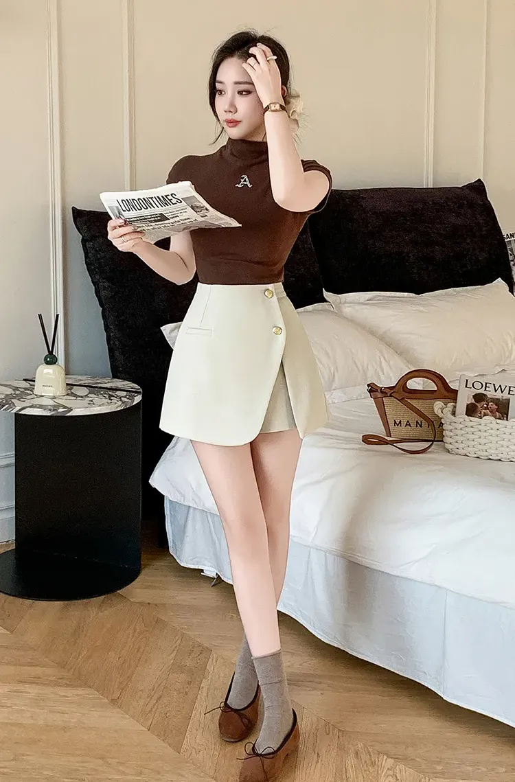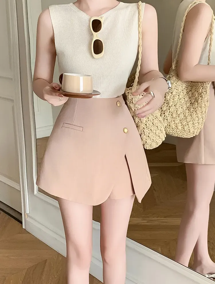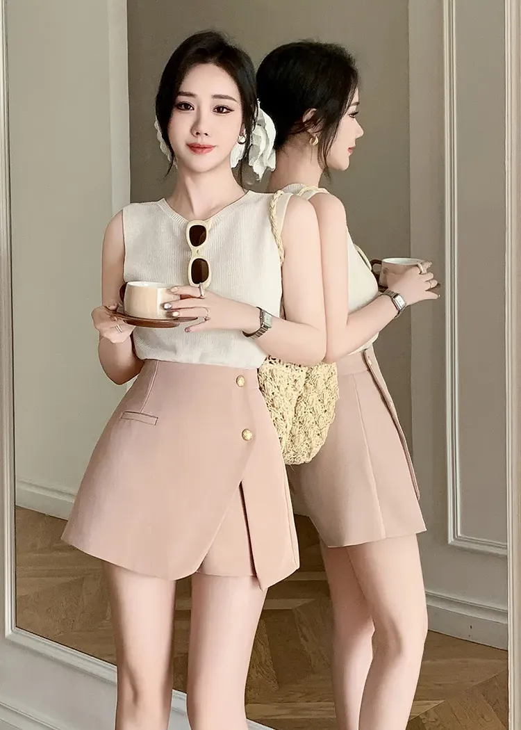 小香風高腰寬腿排扣不對稱A字裙褲(3色)