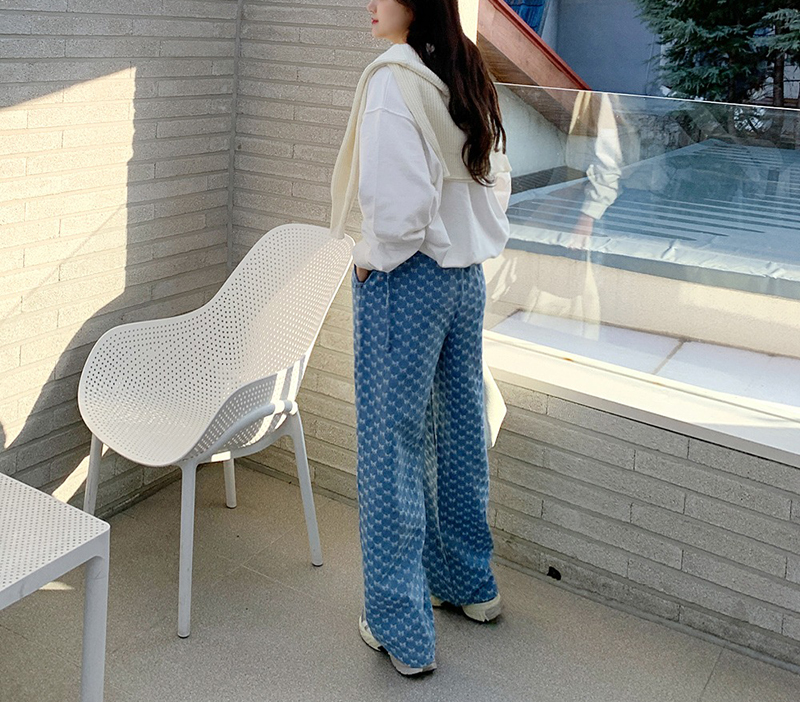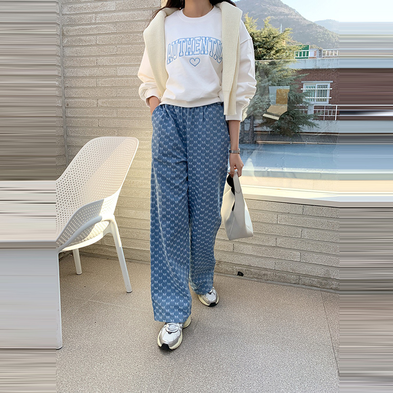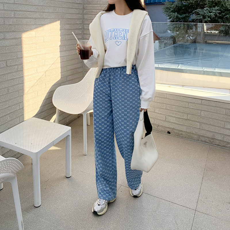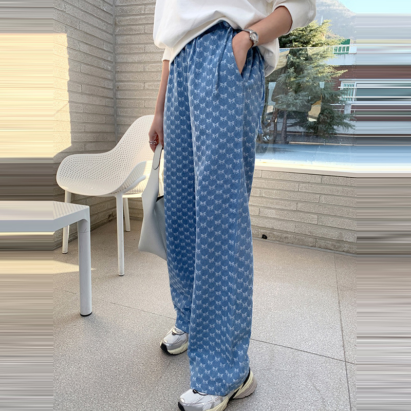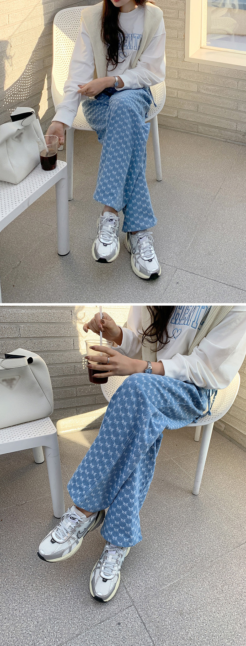 韓系復古蝴蝶結提花直筒繫帶水洗牛仔褲