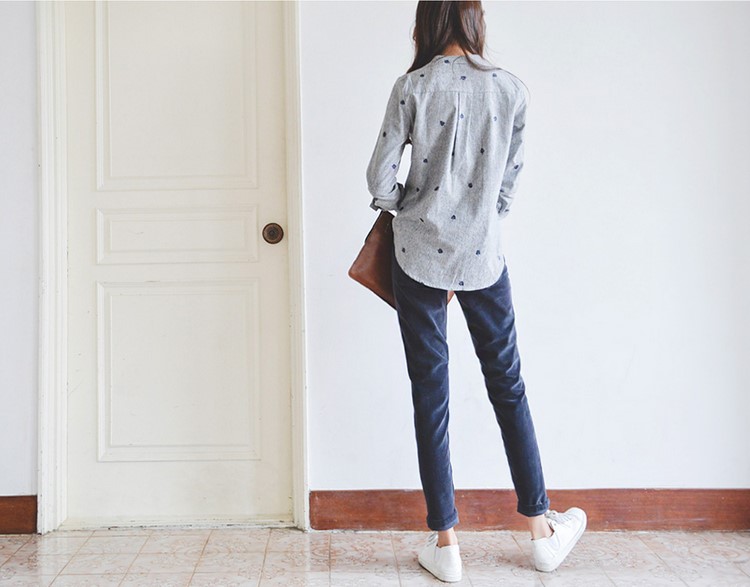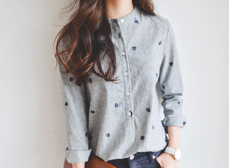 韓版樹葉刺繡立領休閒襯衫