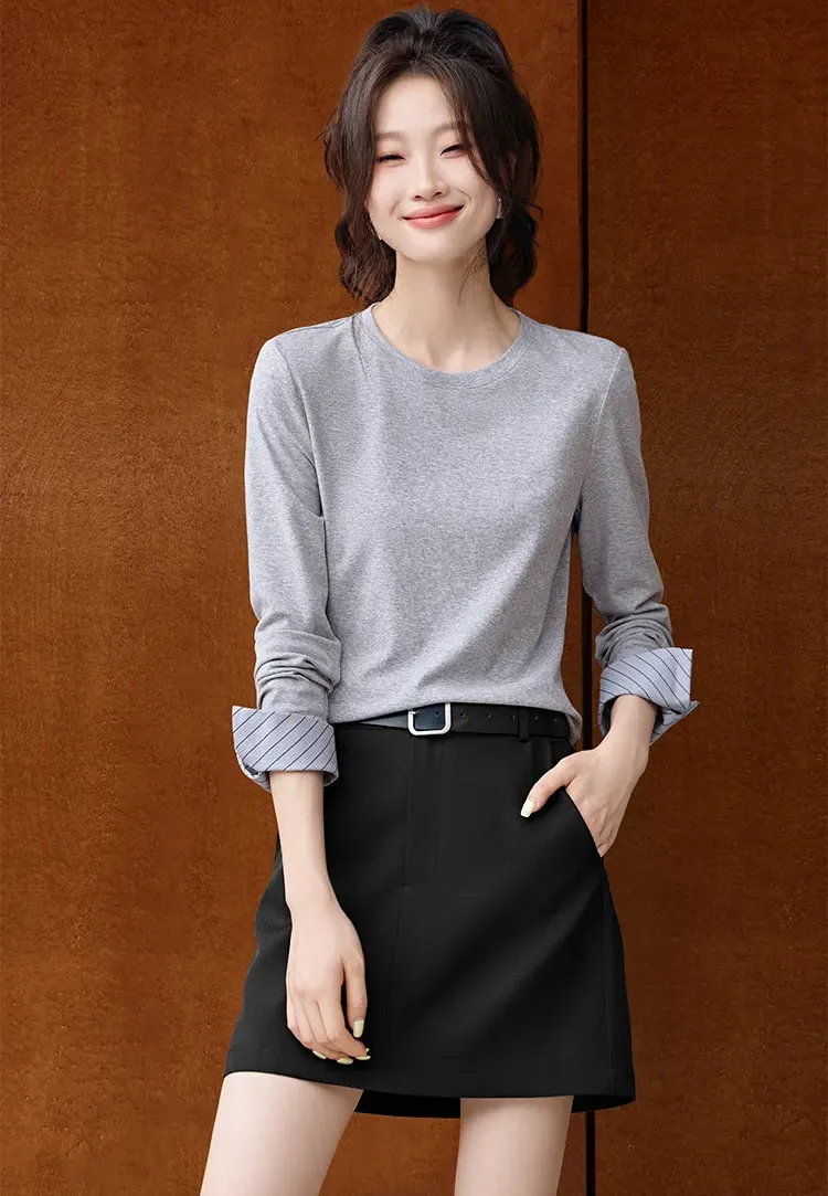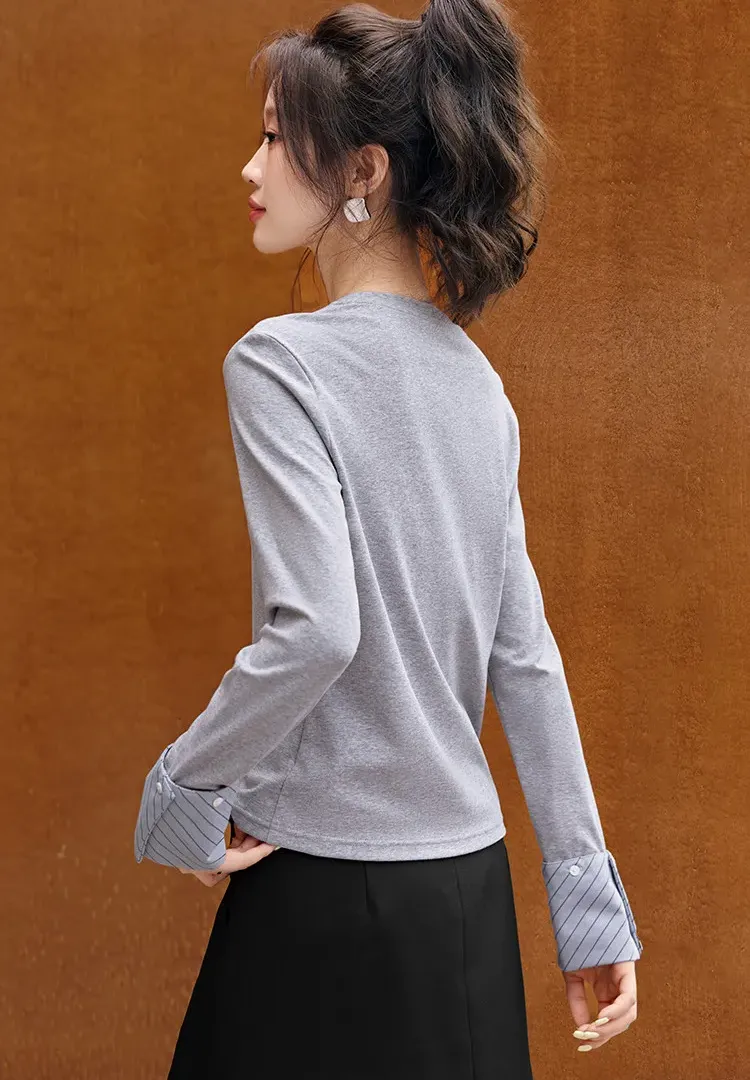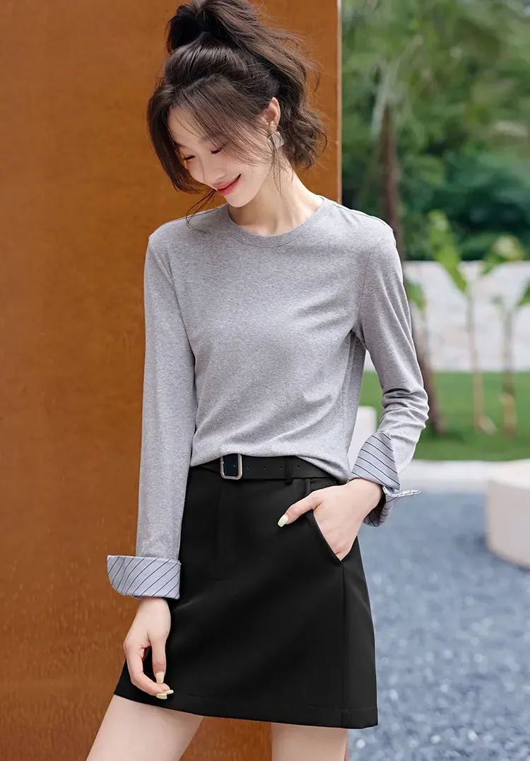 韓系條紋袖口撞色拼接長袖T恤(2色)