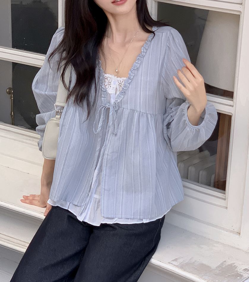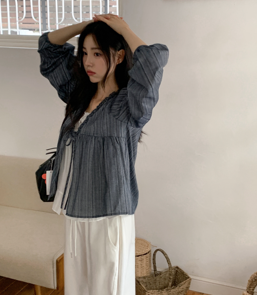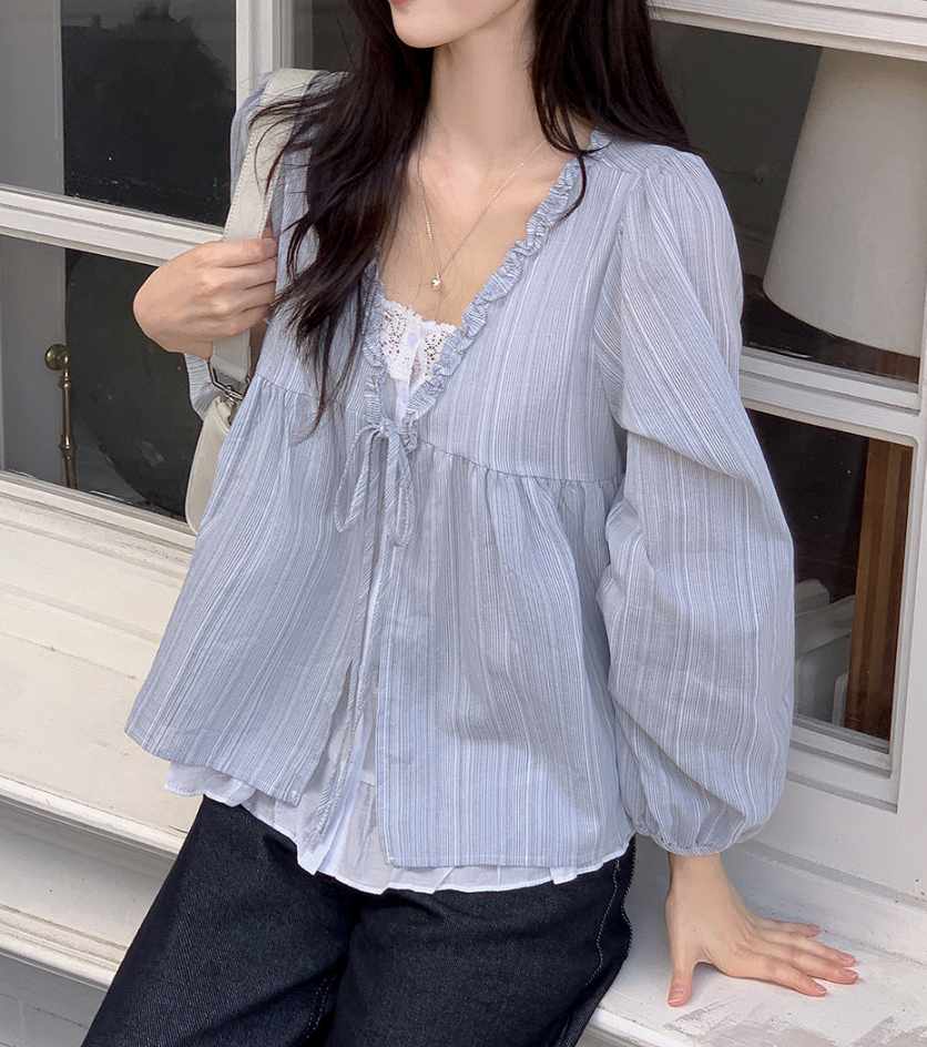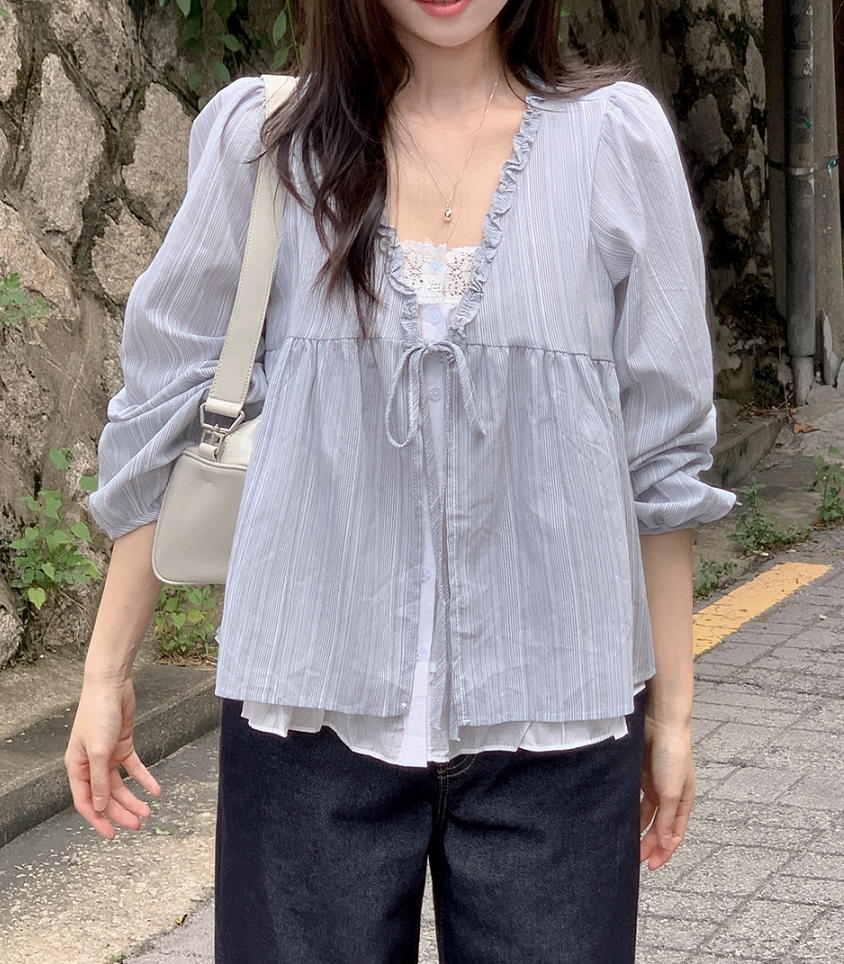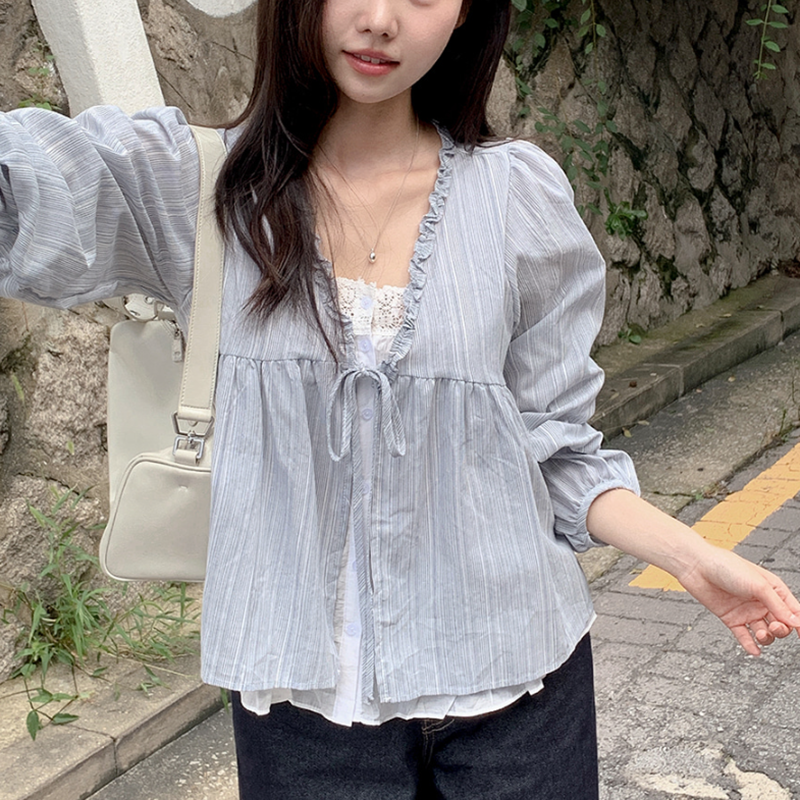 韓系甜美木耳邊條紋上假兩件娃娃衫(2色)