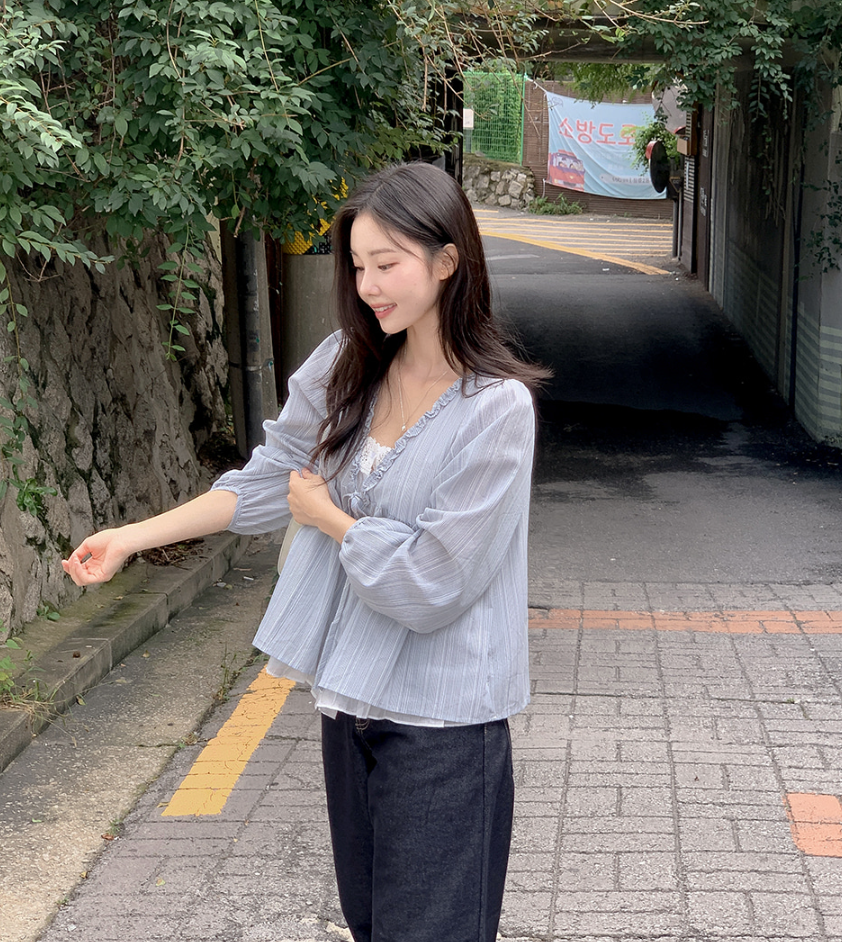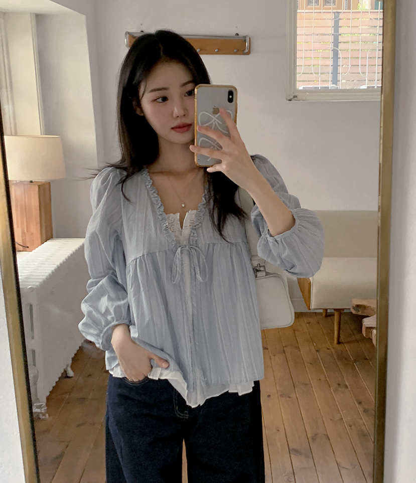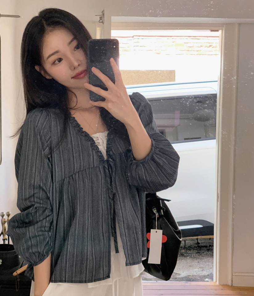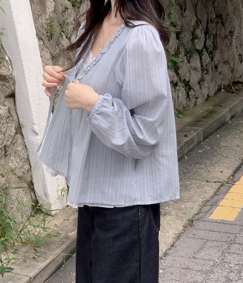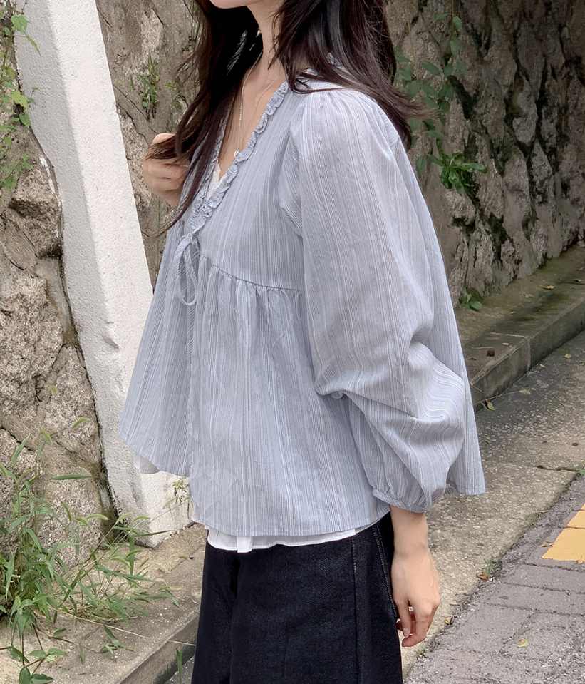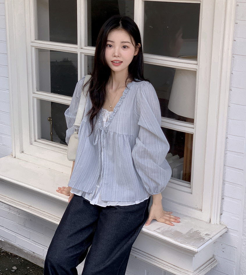 韓系甜美木耳邊條紋上假兩件娃娃衫(2色)