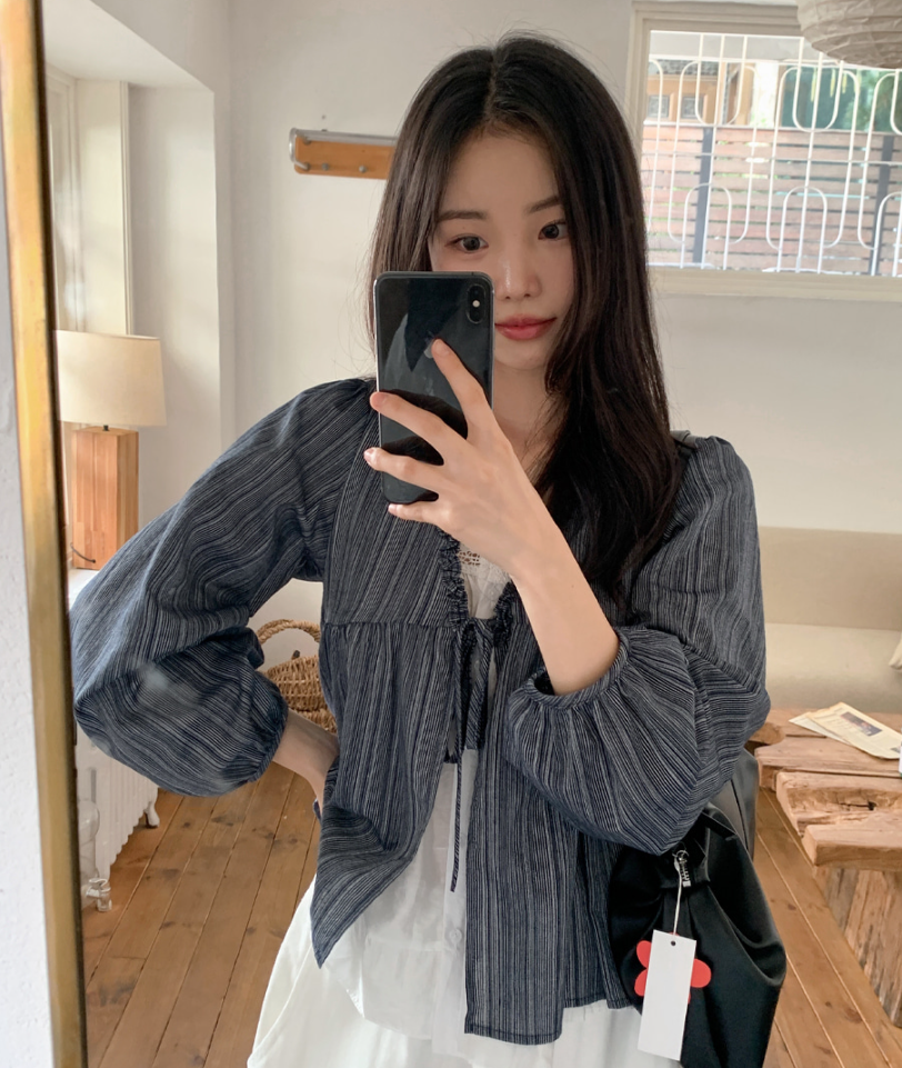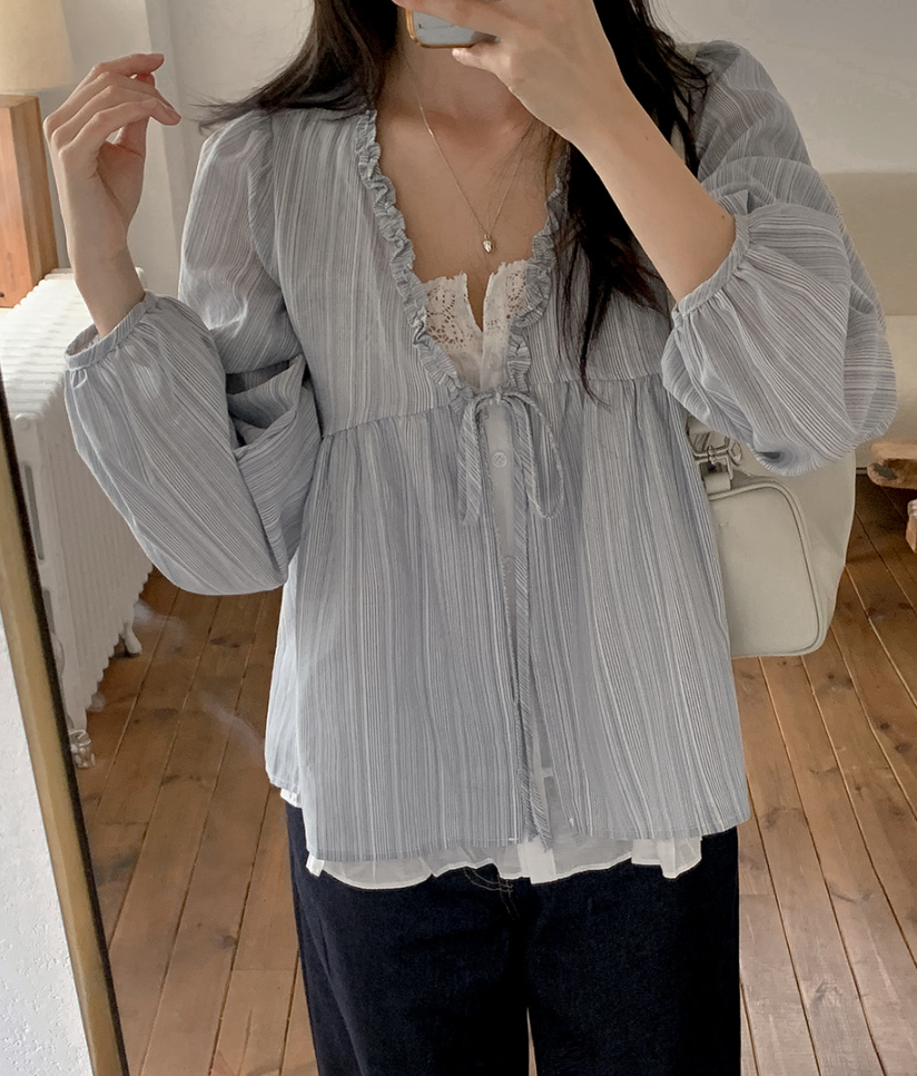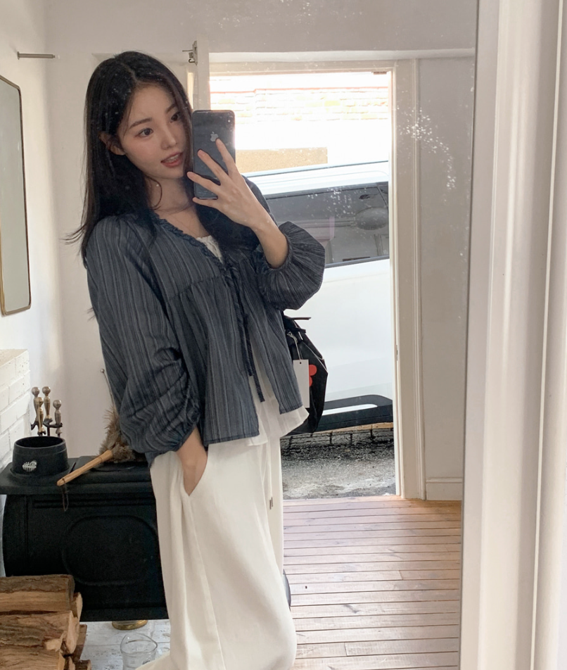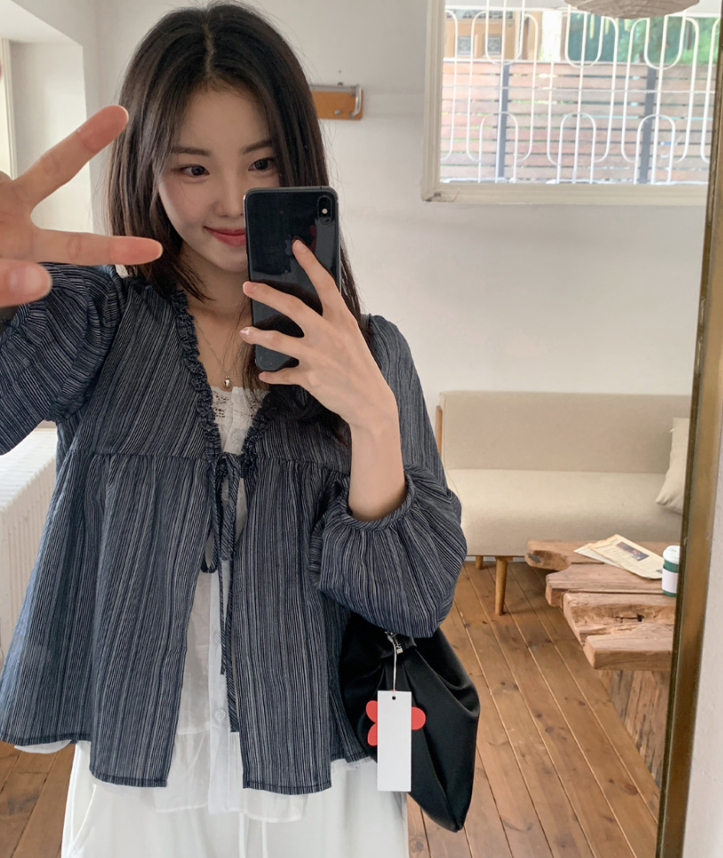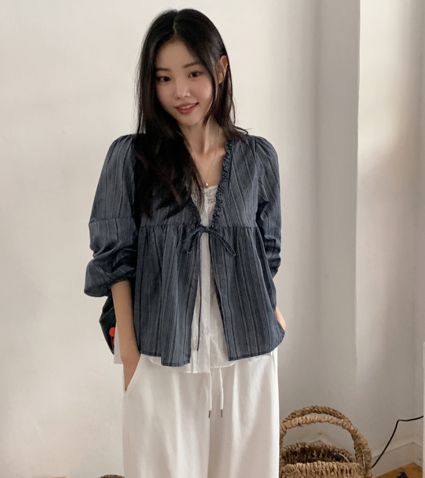 韓系甜美木耳邊條紋上假兩件娃娃衫(2色)