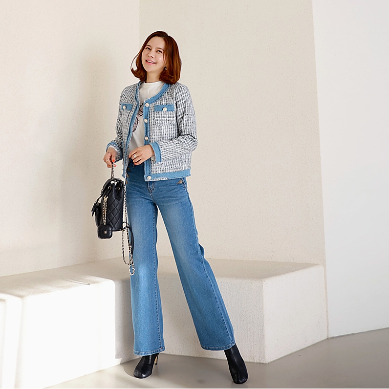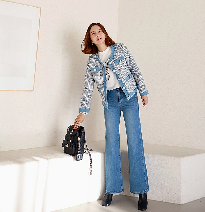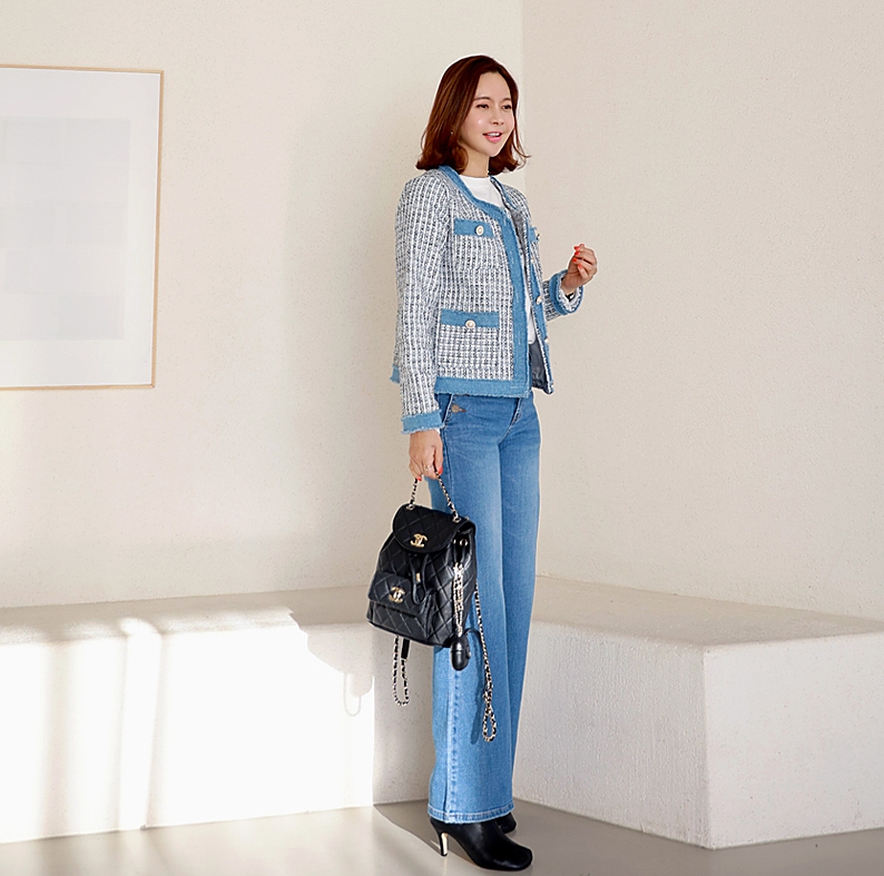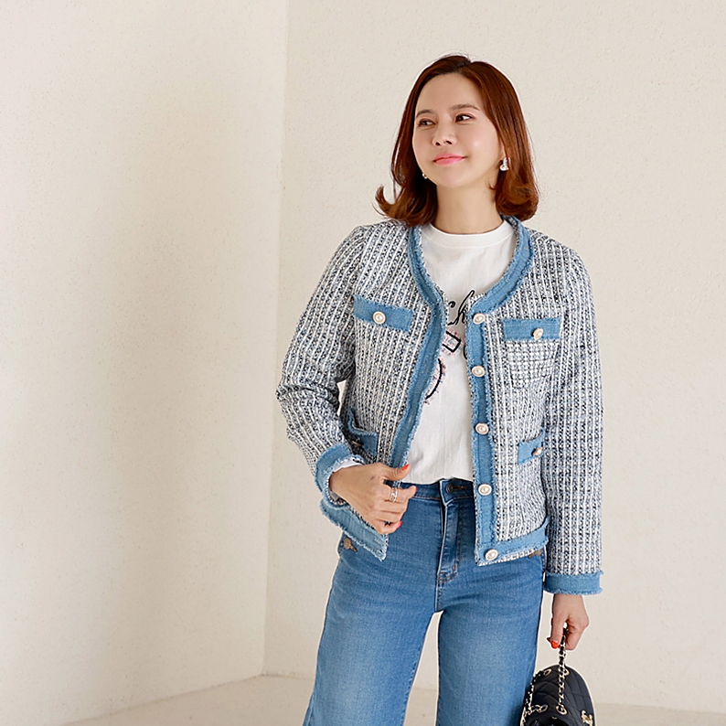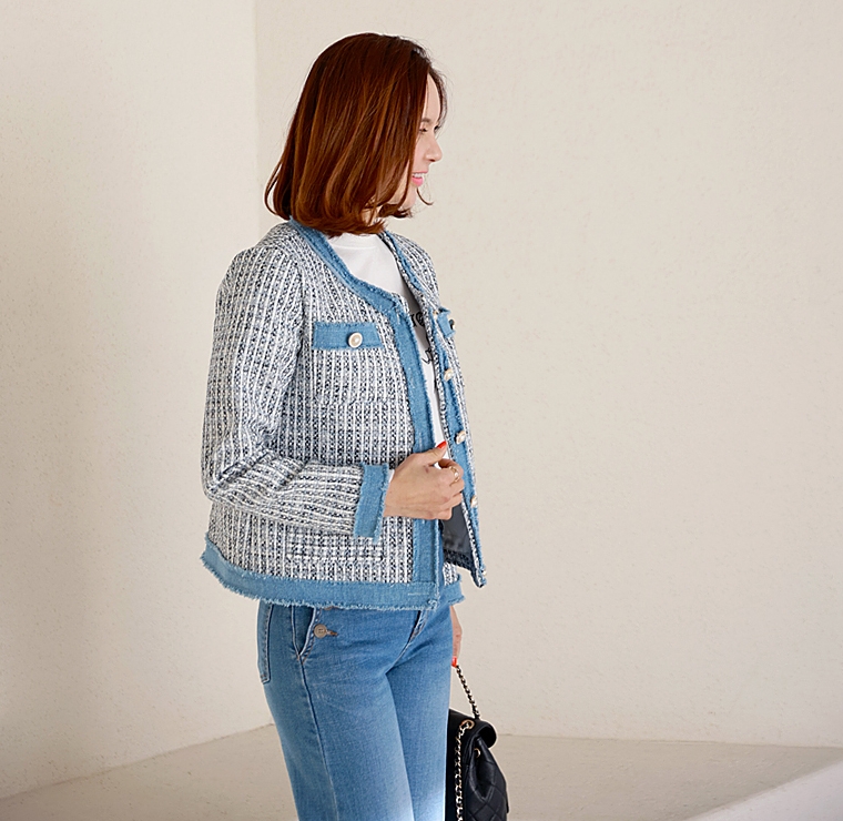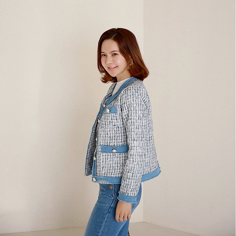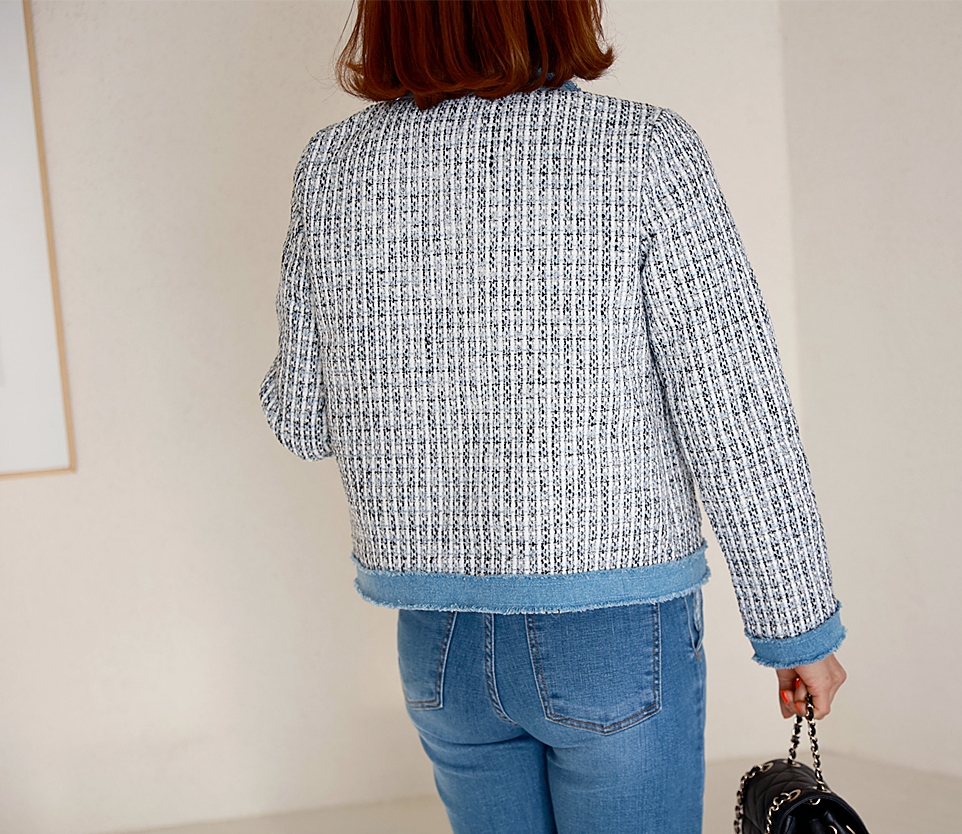 韓國粗花呢珍珠扣格紋牛仔拼色短外套