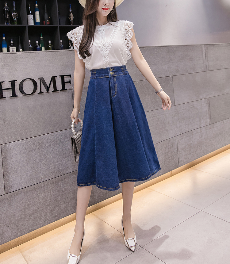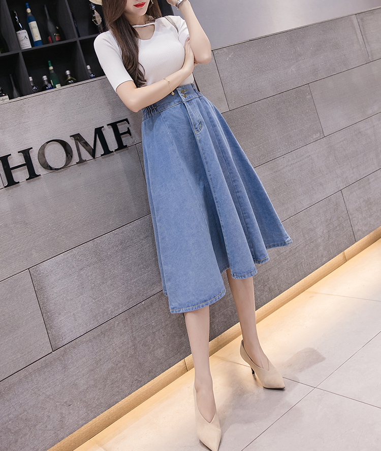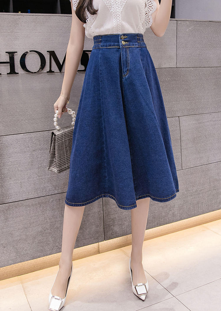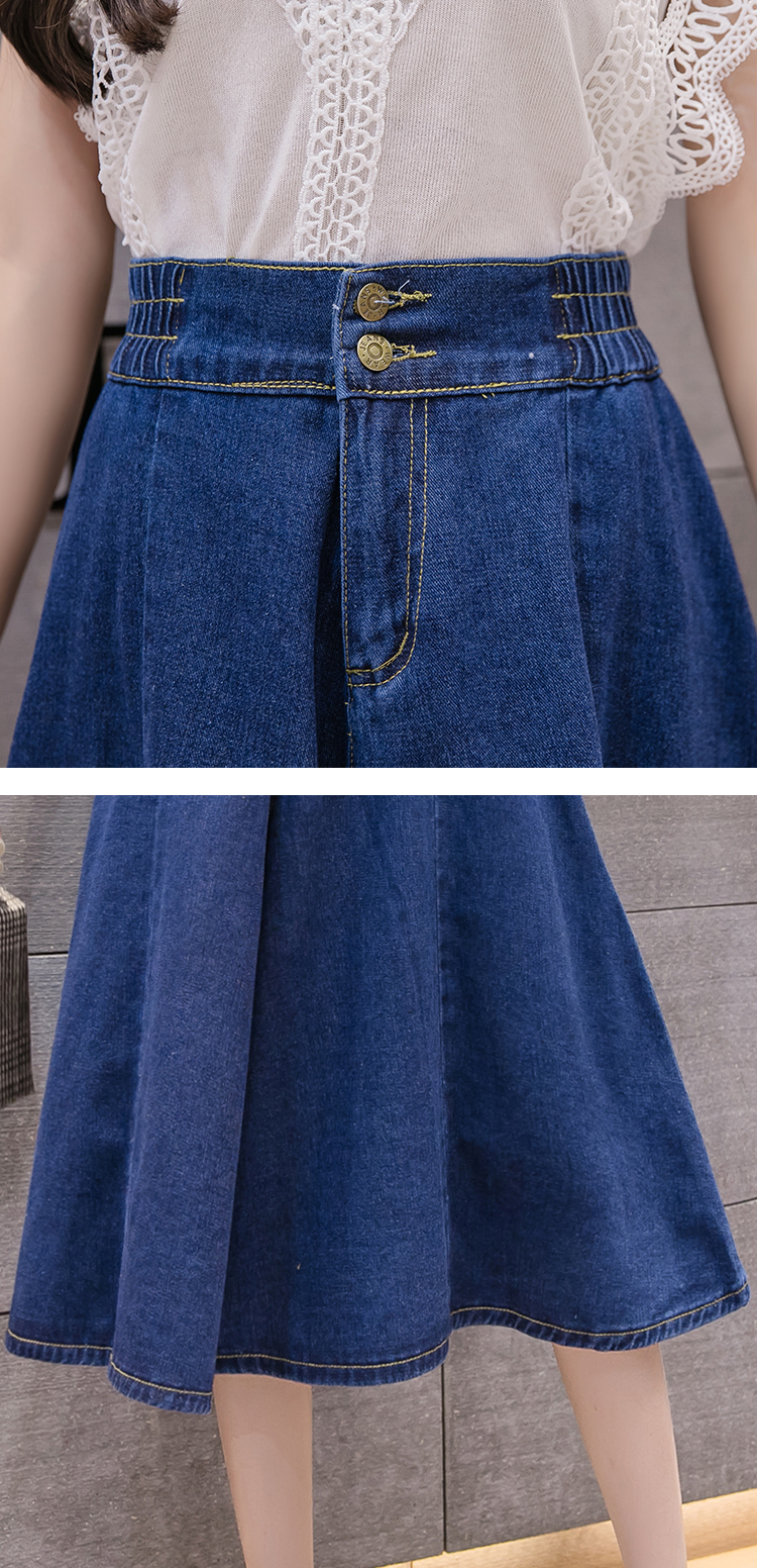鬆緊高腰中長款大擺牛仔裙(2色)