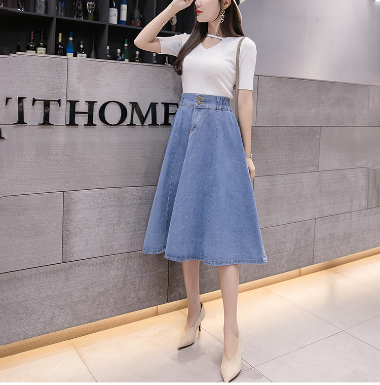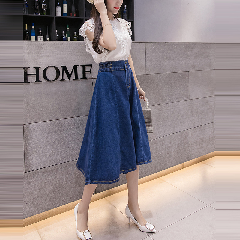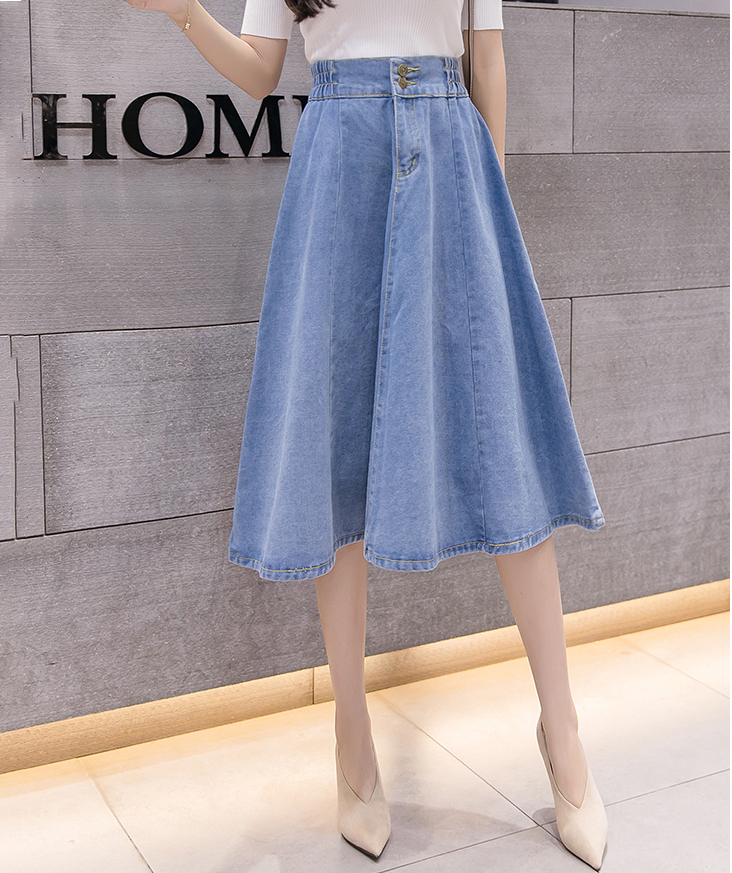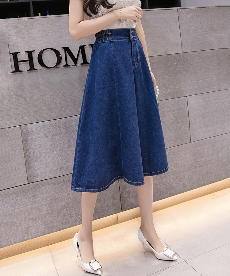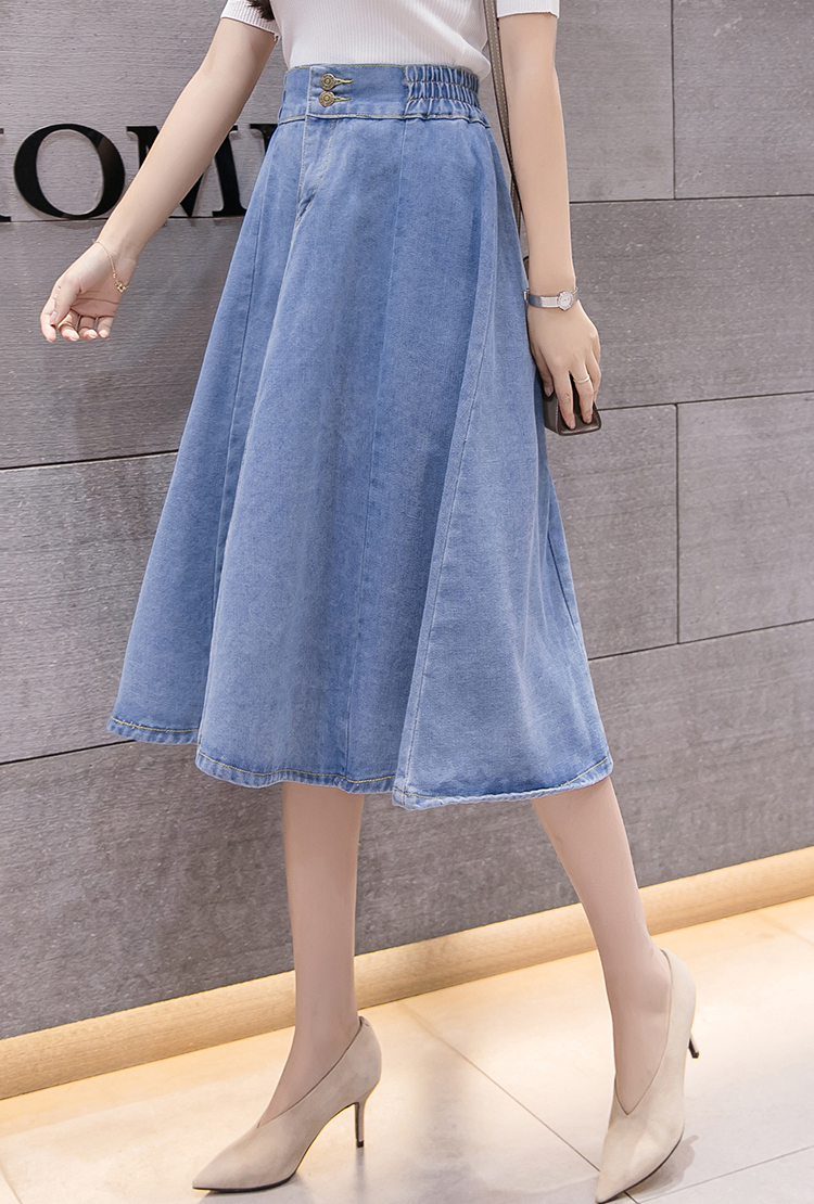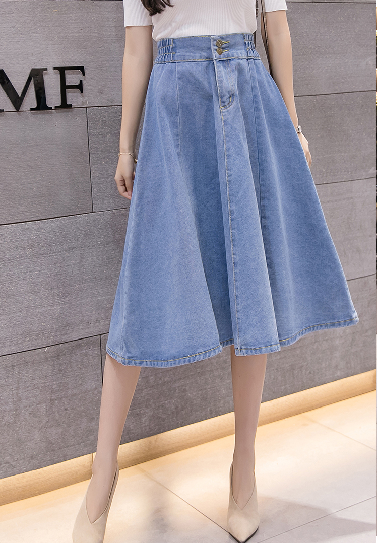 新款鬆緊高腰中長大擺牛仔裙(2色)