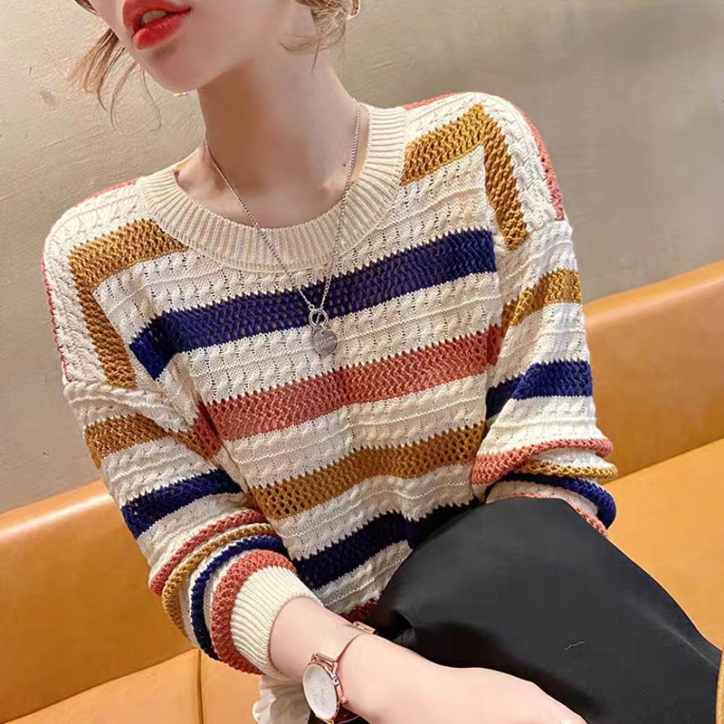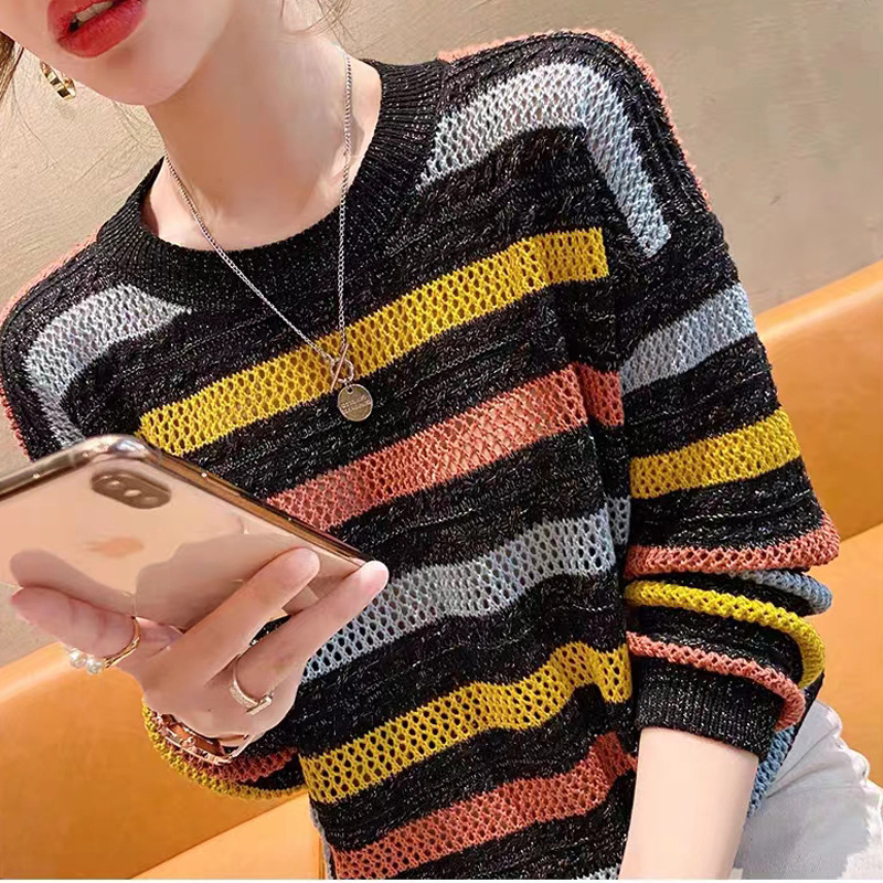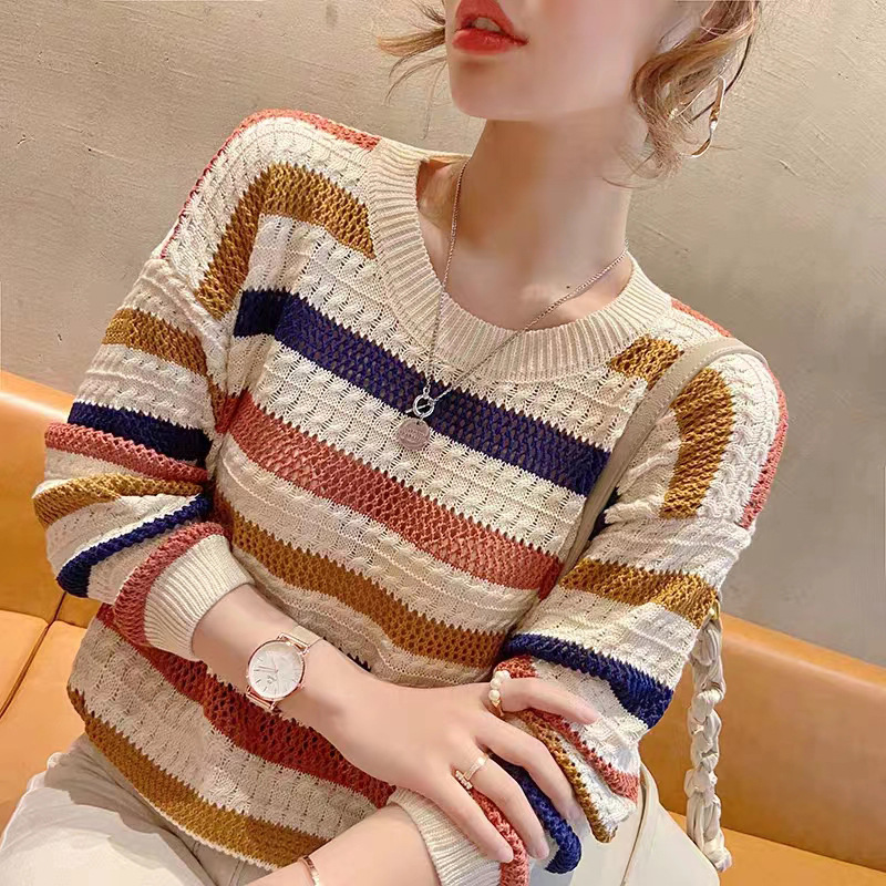 彩虹條紋撞色鏤空針織衫(3色)