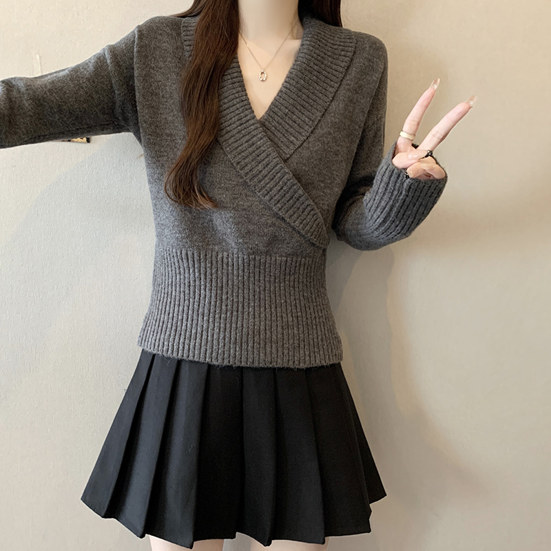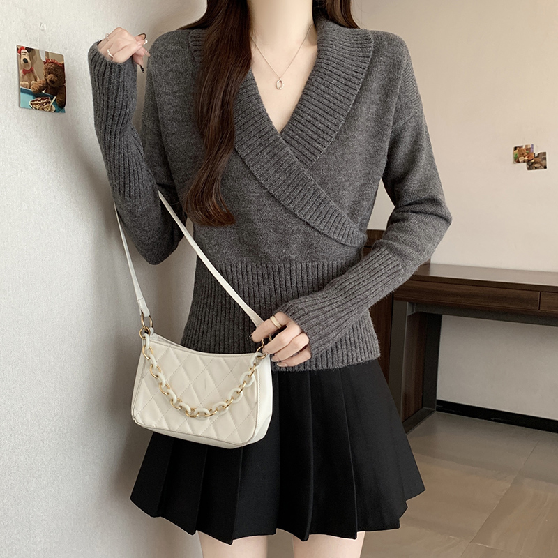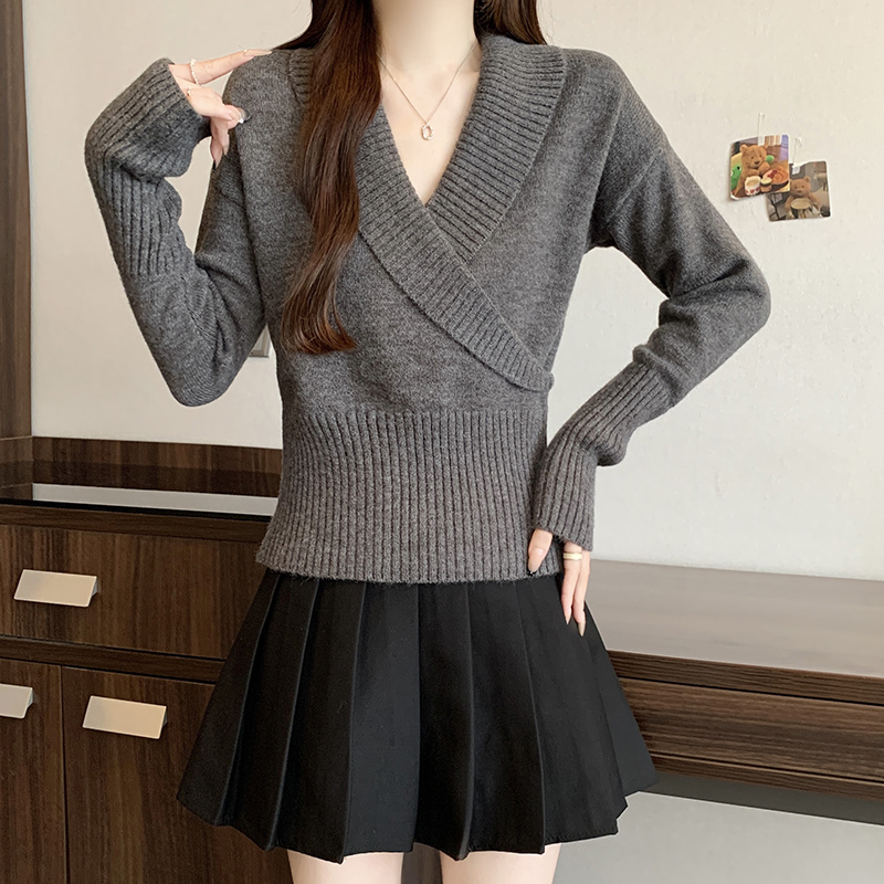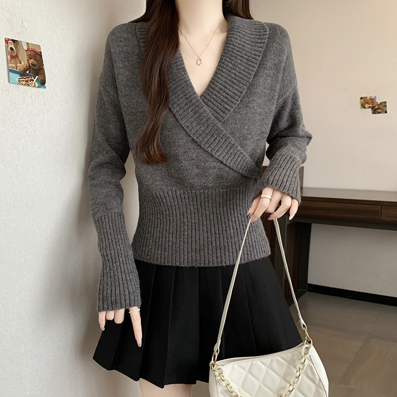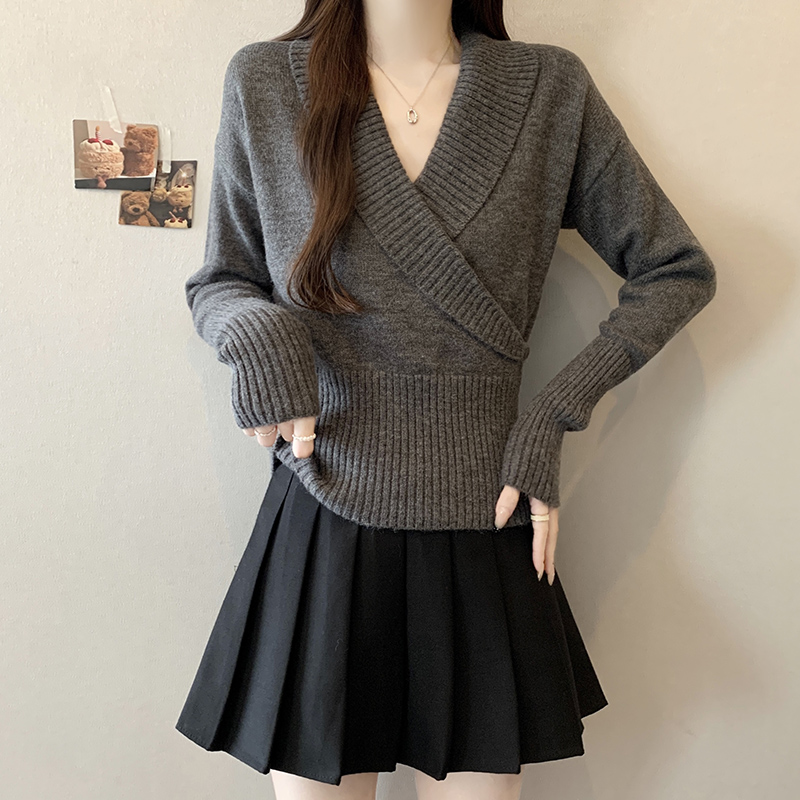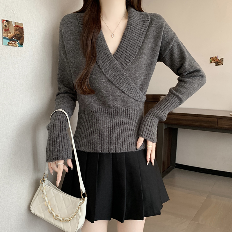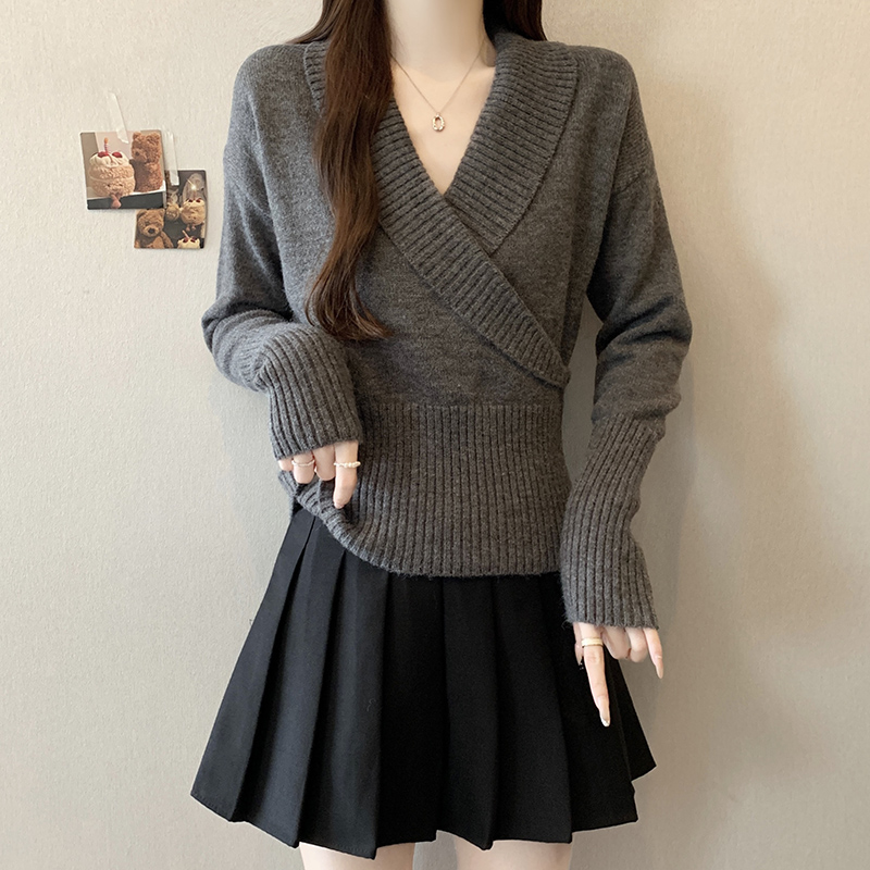 復古交叉V領長袖針織衫