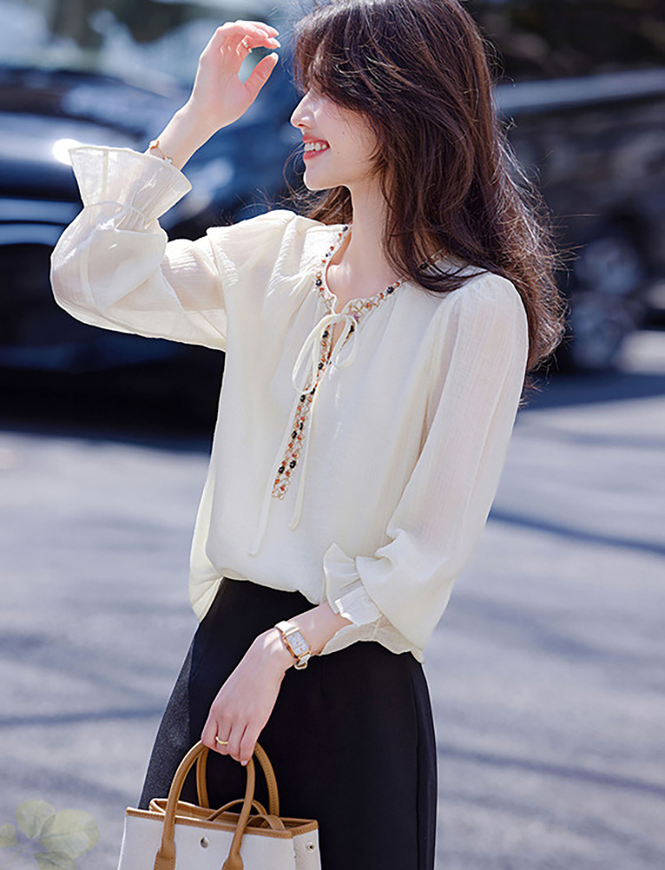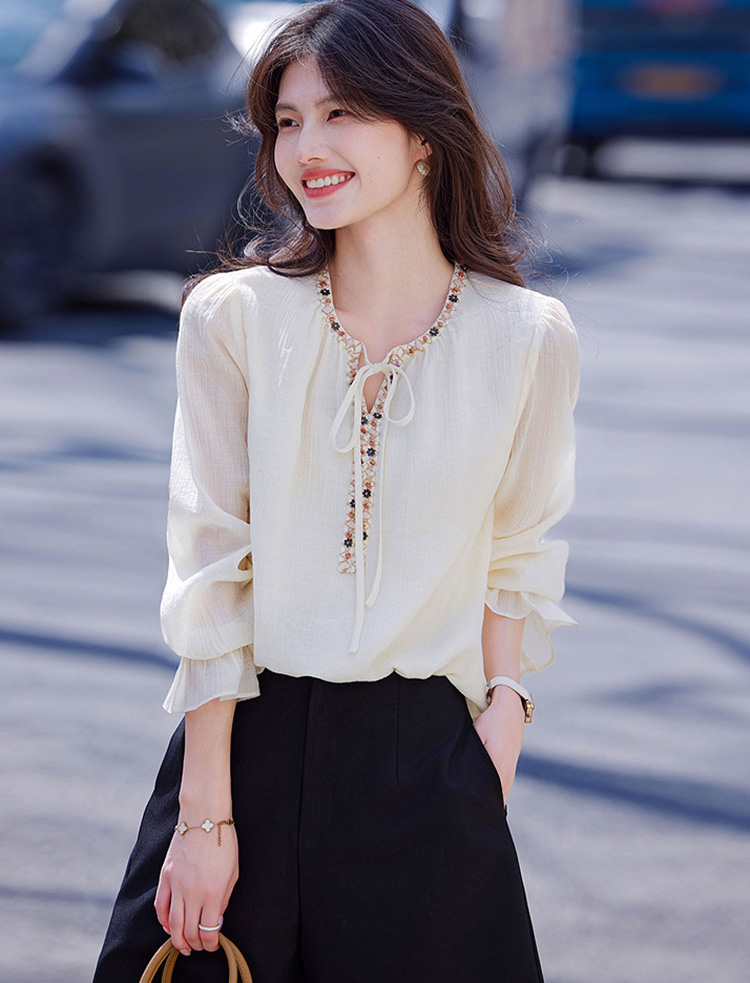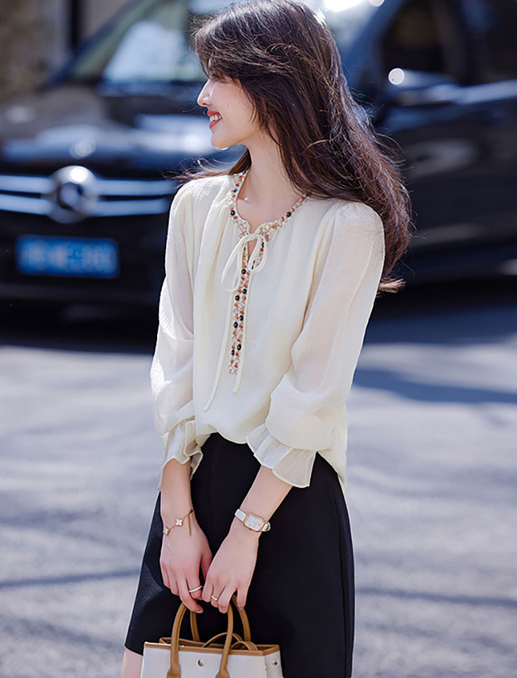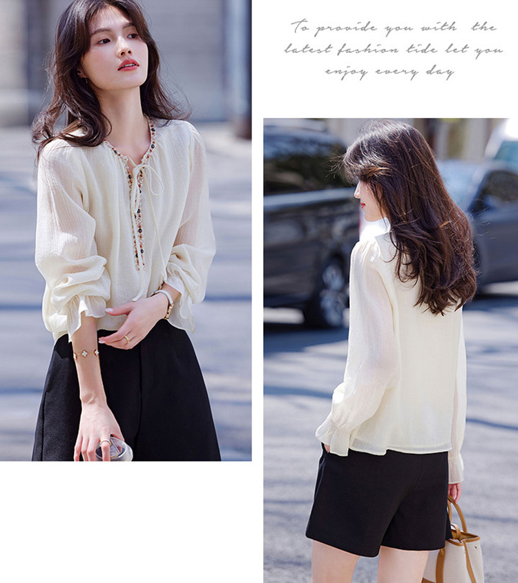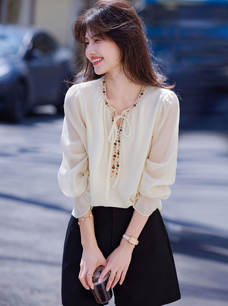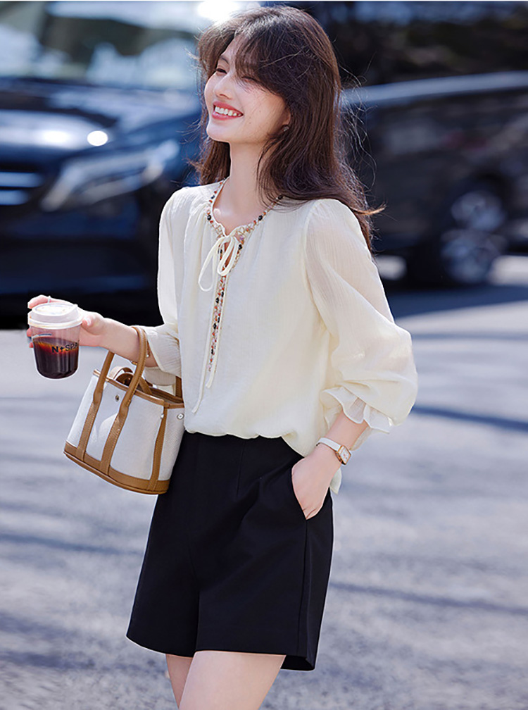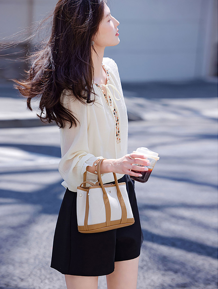 復古文藝風半開領撞色拼接襯衫