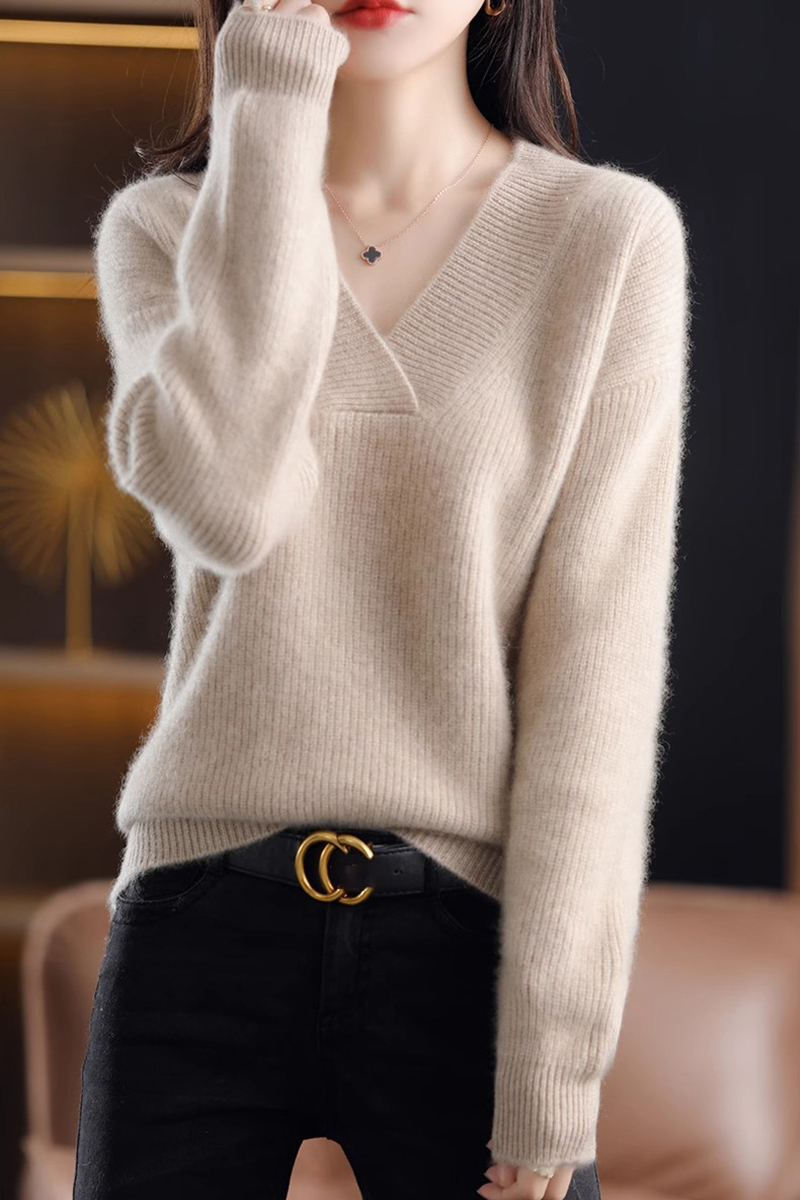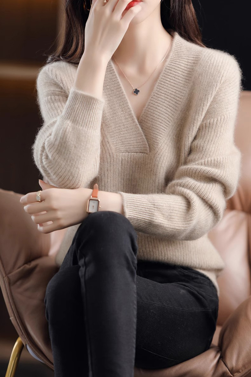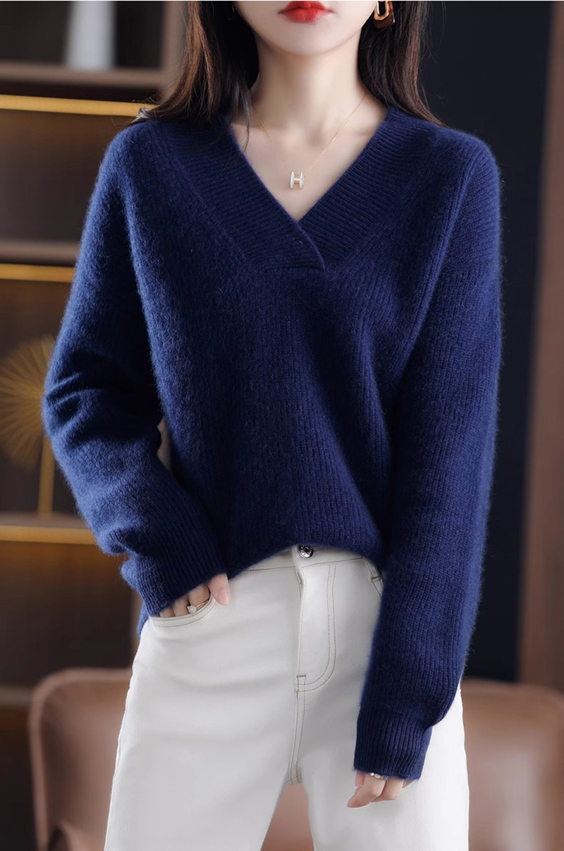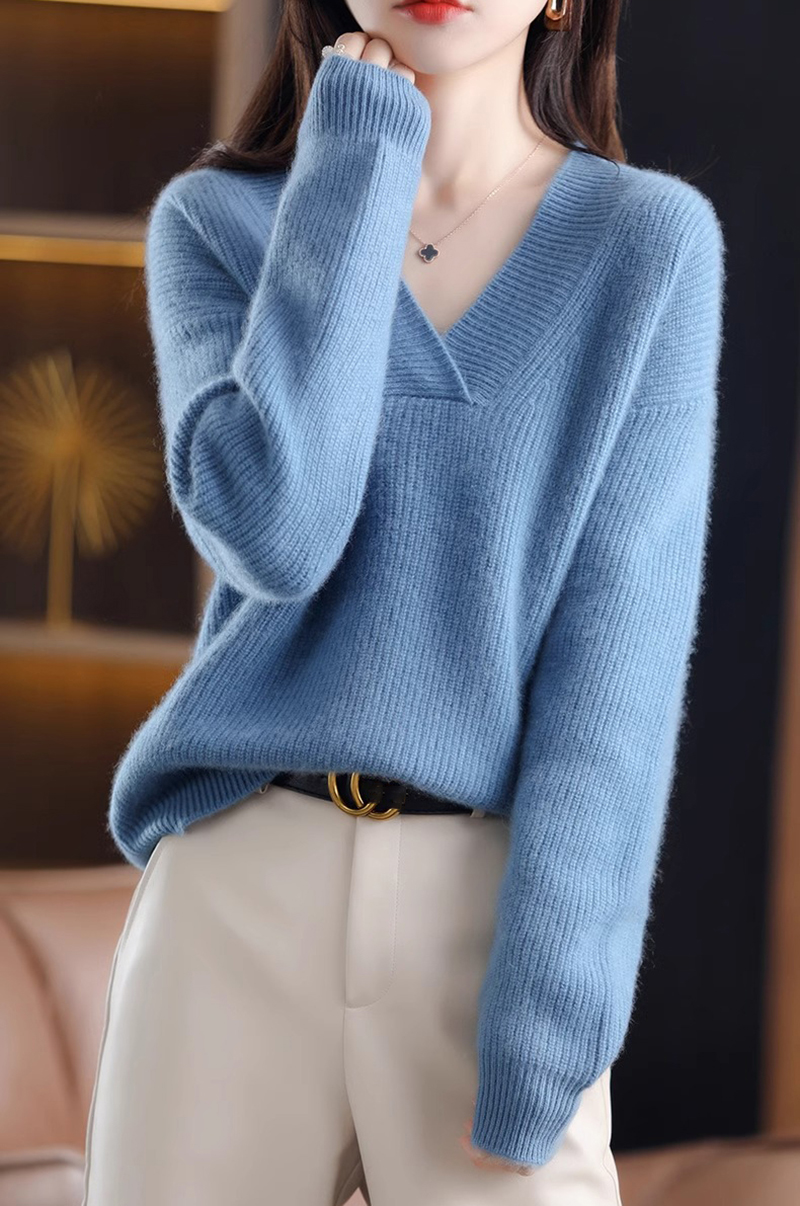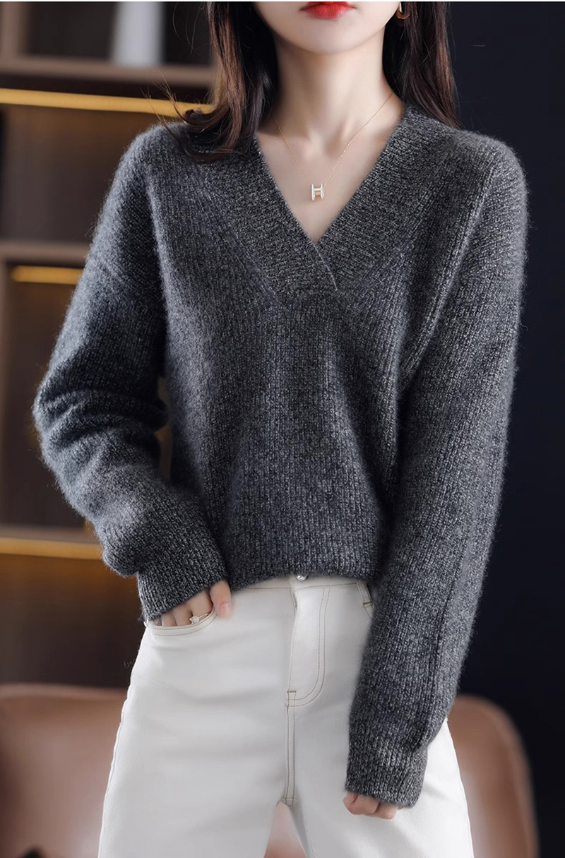 復古寬鬆純色V領針織抽條毛衣(10色)