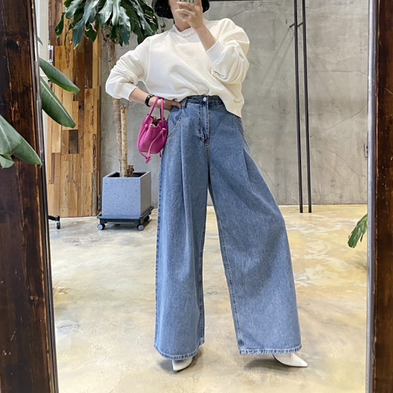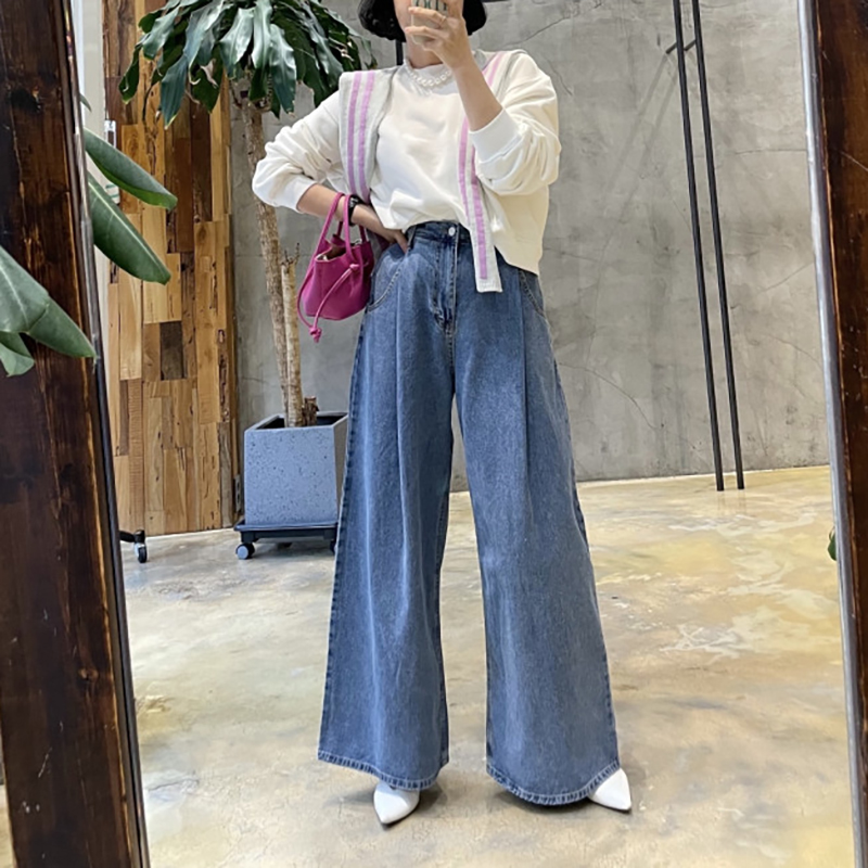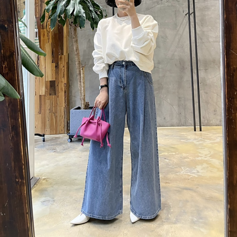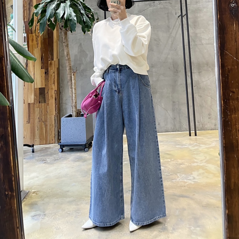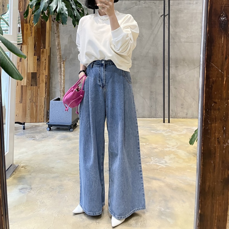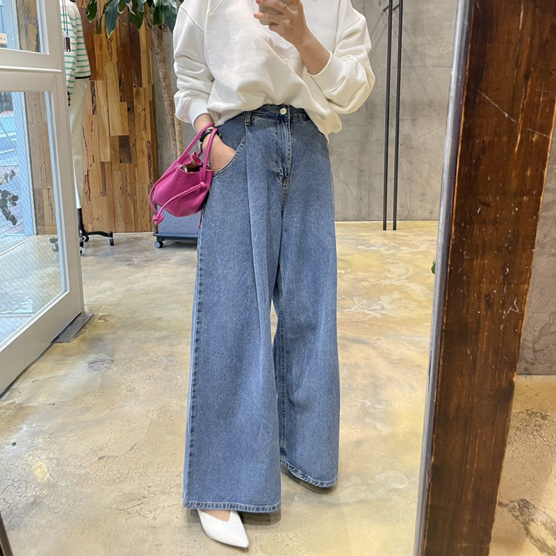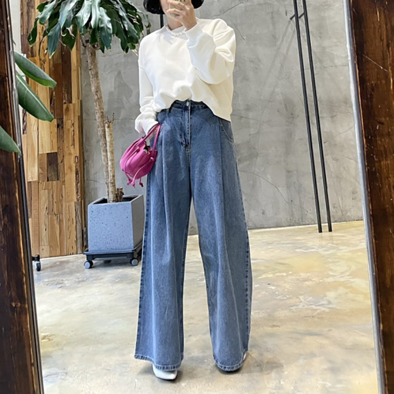 復古百搭壓褶高腰顯瘦闊腿牛仔褲