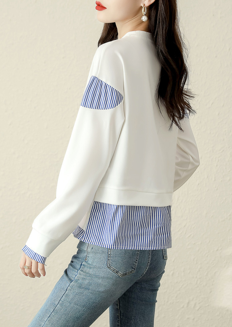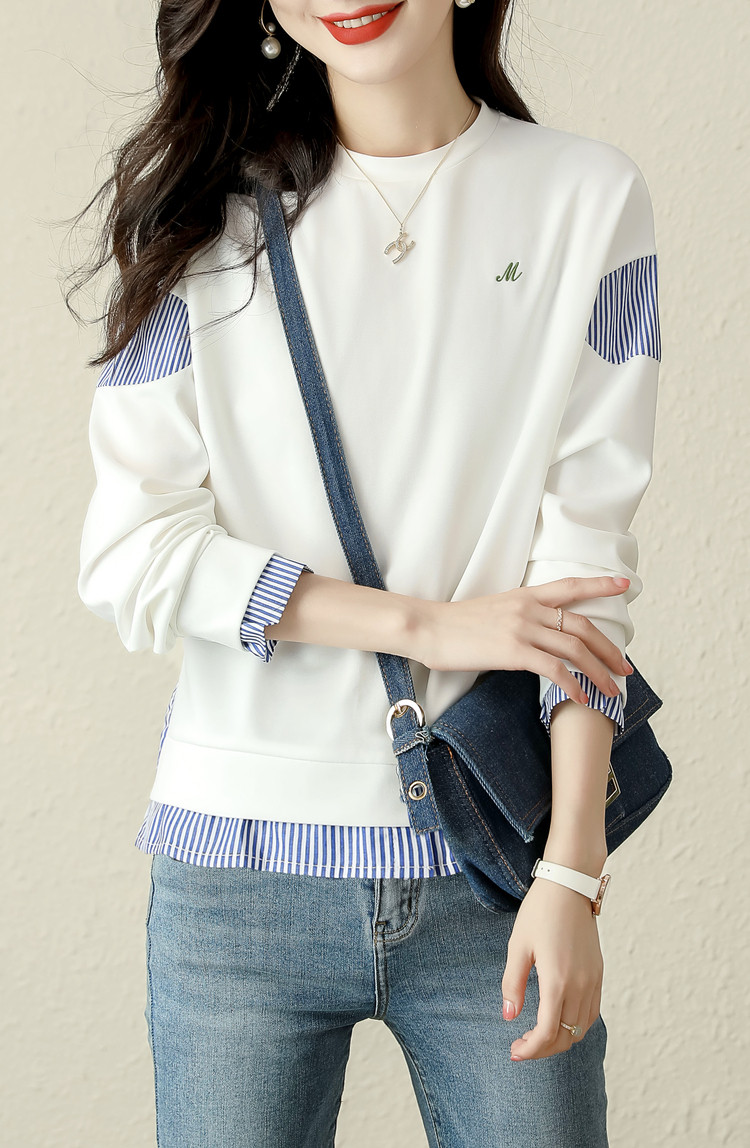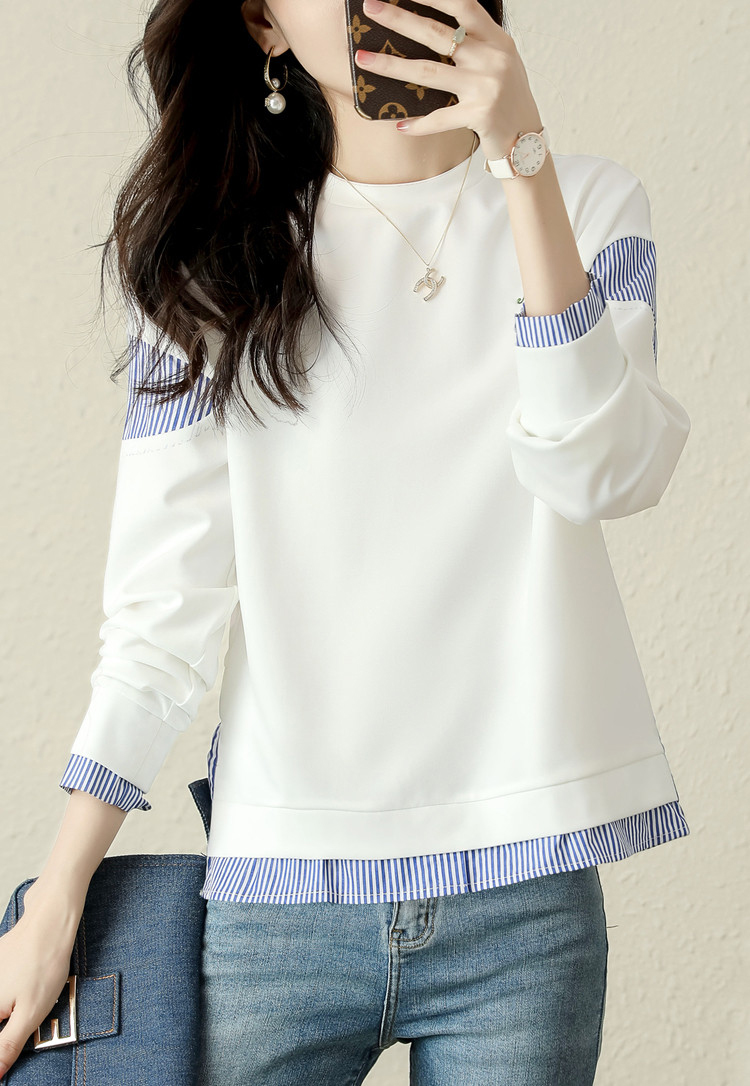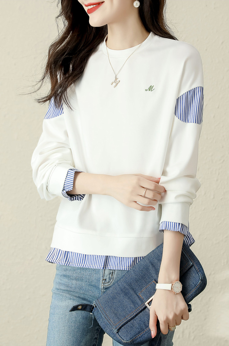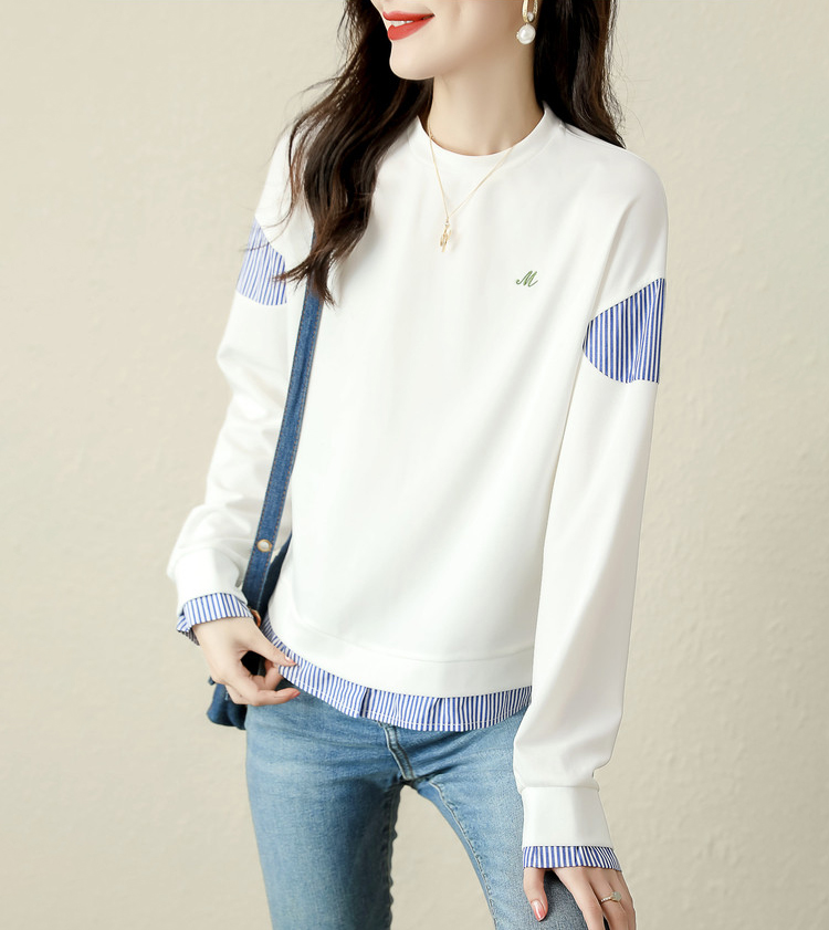 簡約拼接撞色假兩件條紋長袖T恤