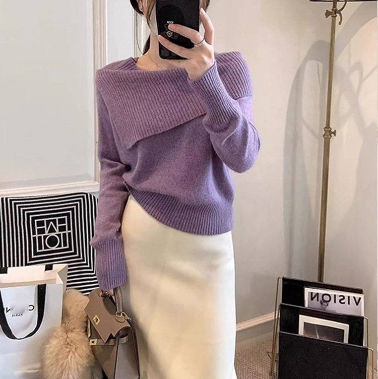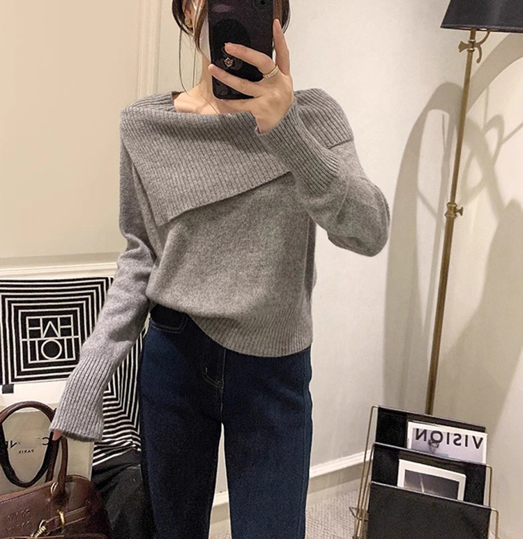 通勤翻領一字肩長袖針織衫(2色)