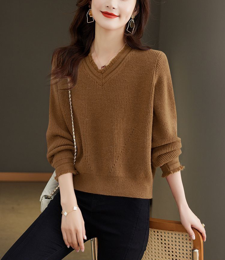 洋氣V領流蘇短款針織毛衣