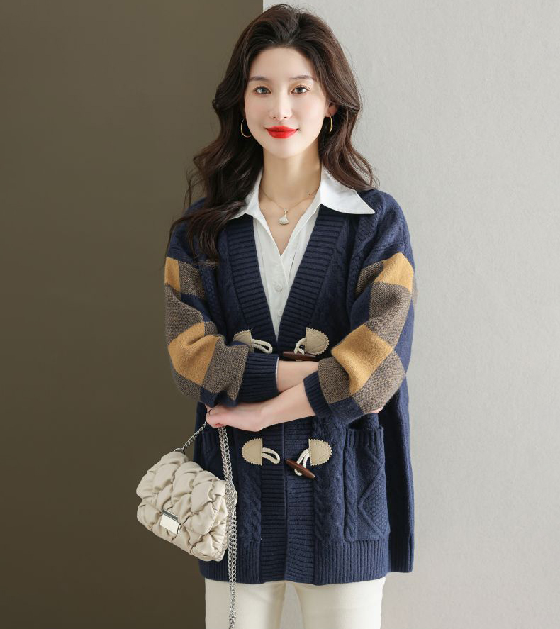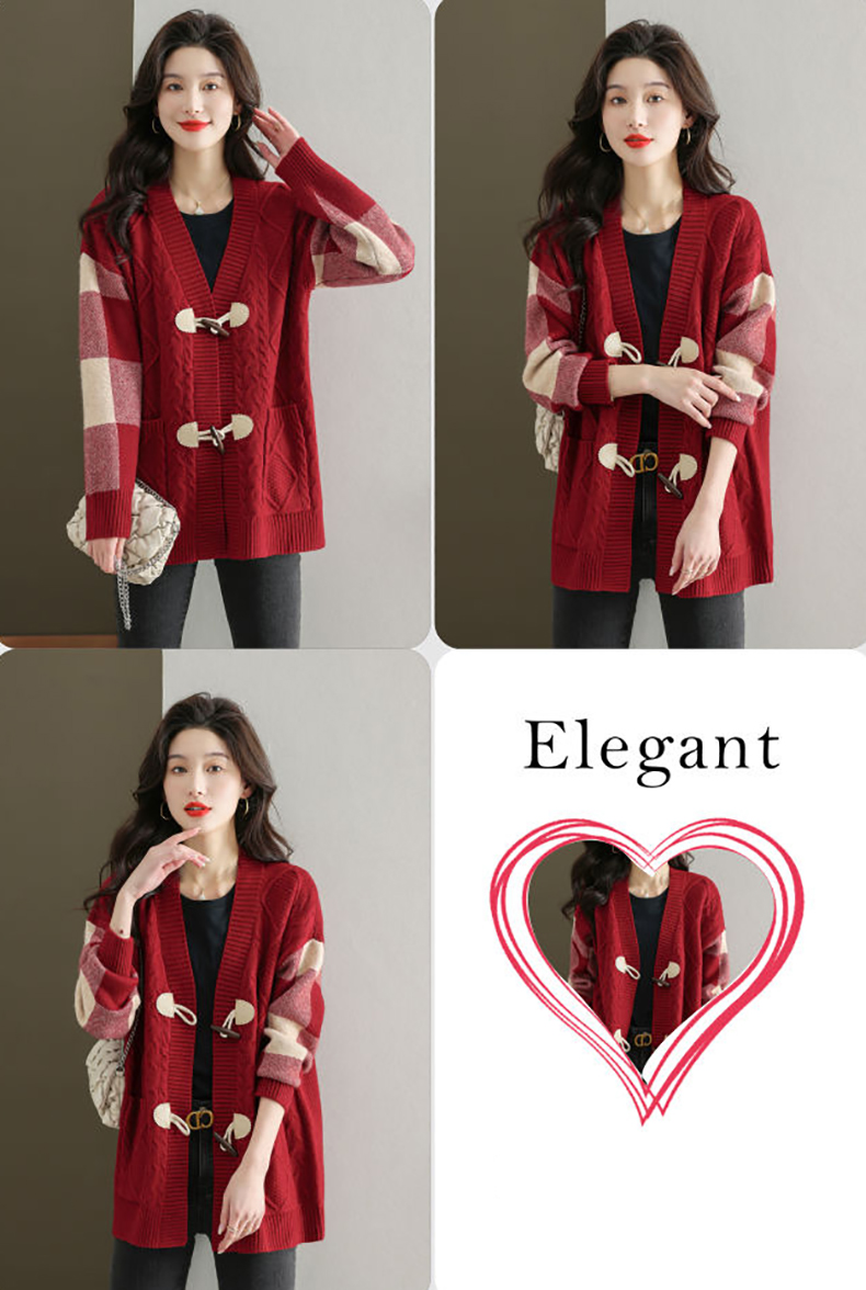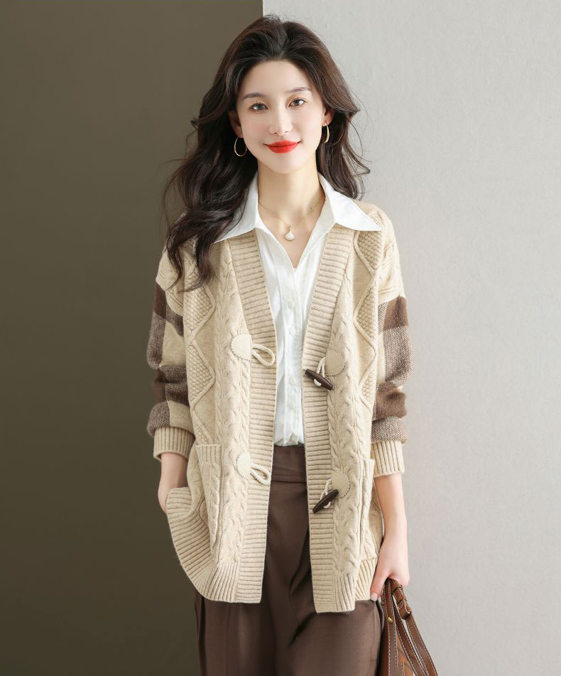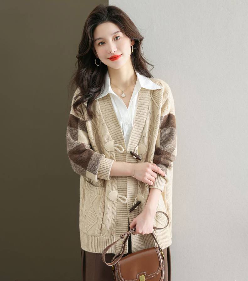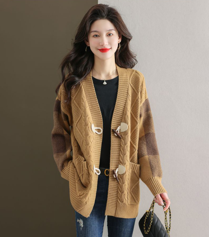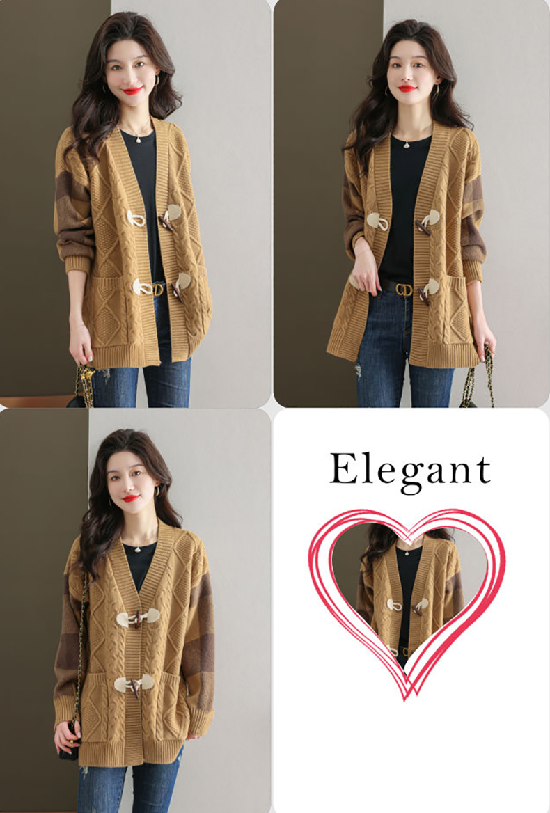 麻花紋理格紋拼接袖牛角釦針織外套(5色)