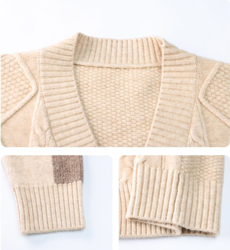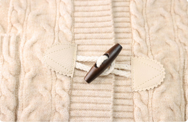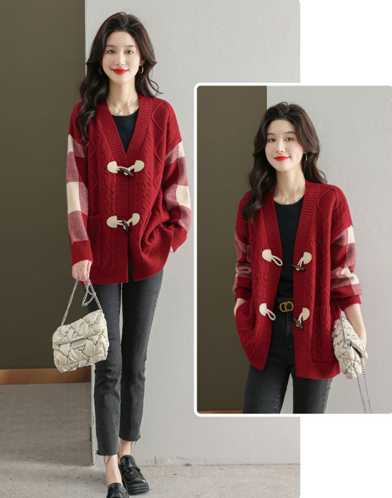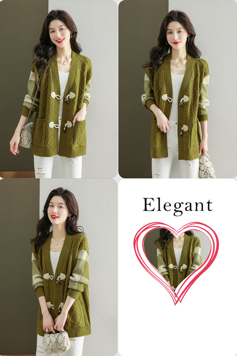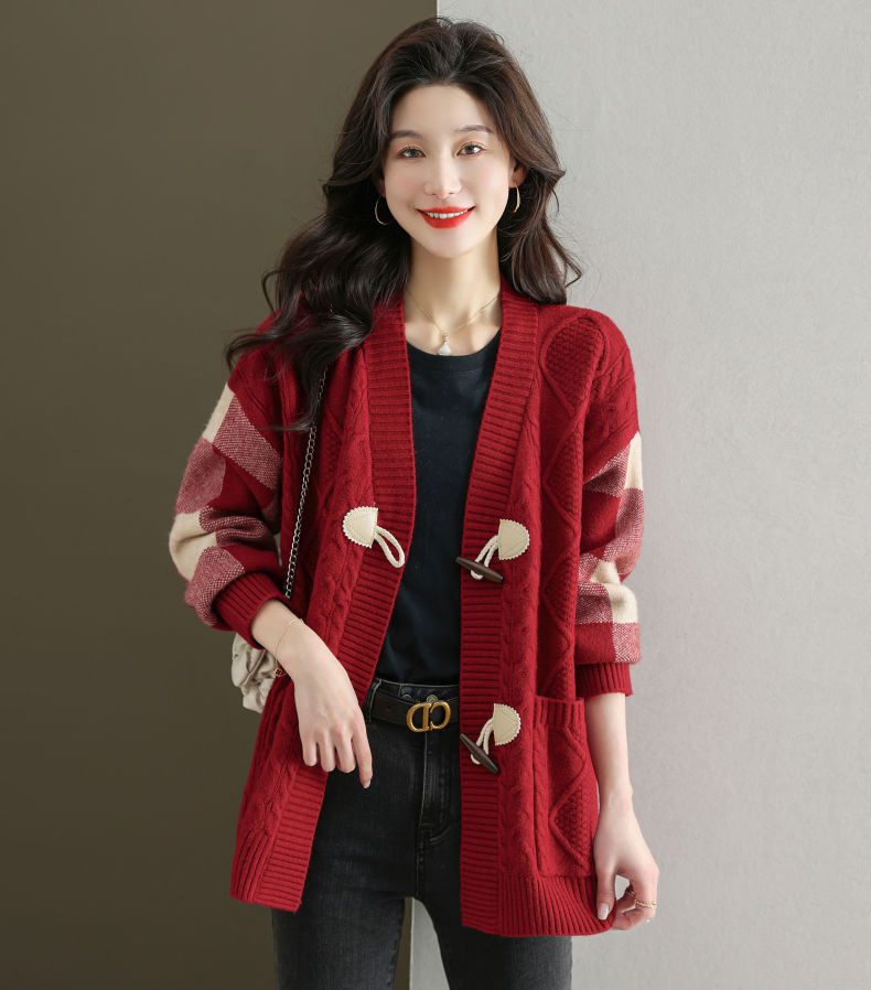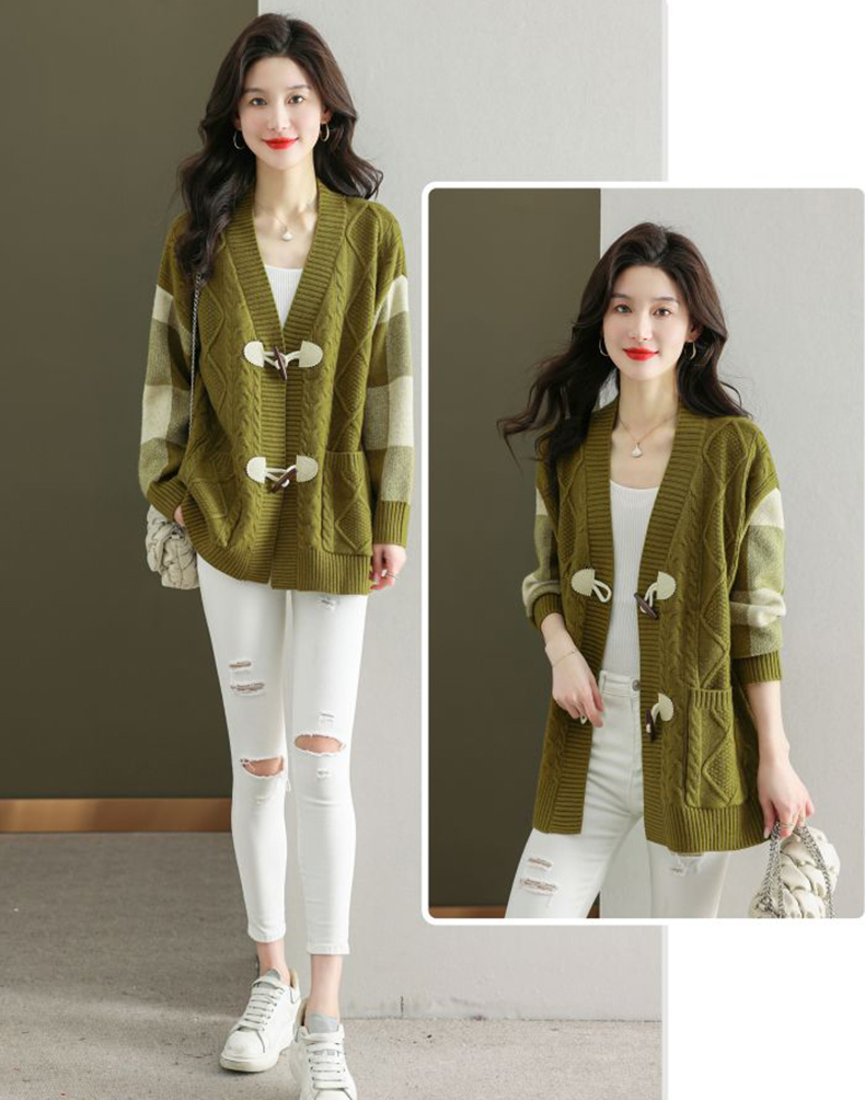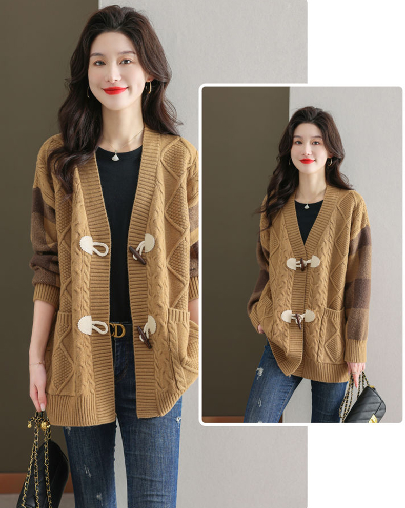 麻花紋理格紋拼接袖牛角釦針織外套(5色)