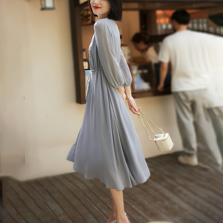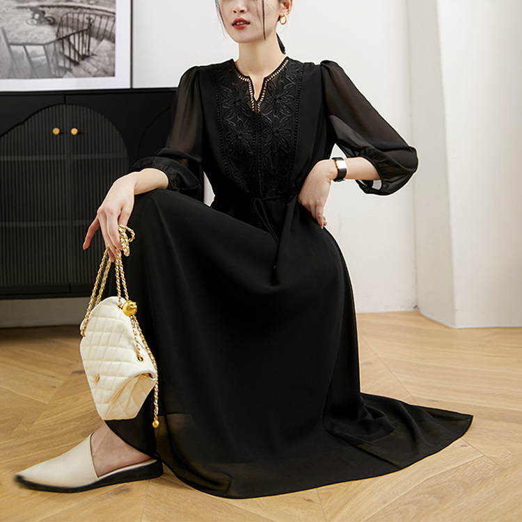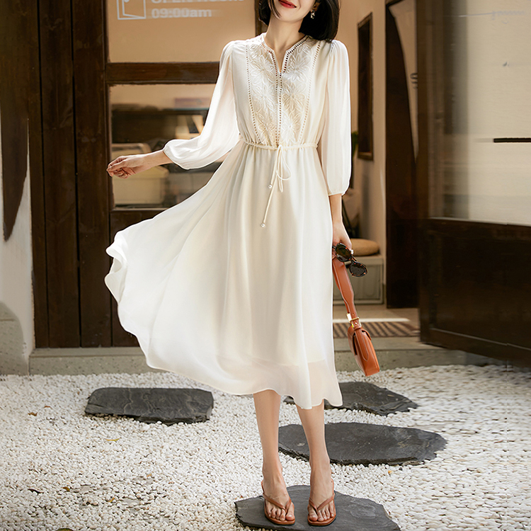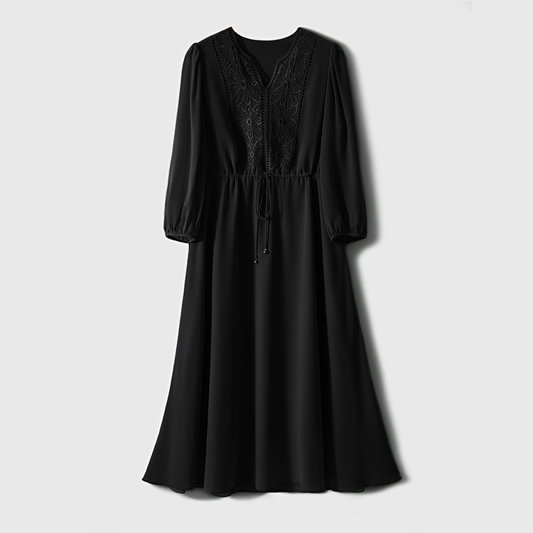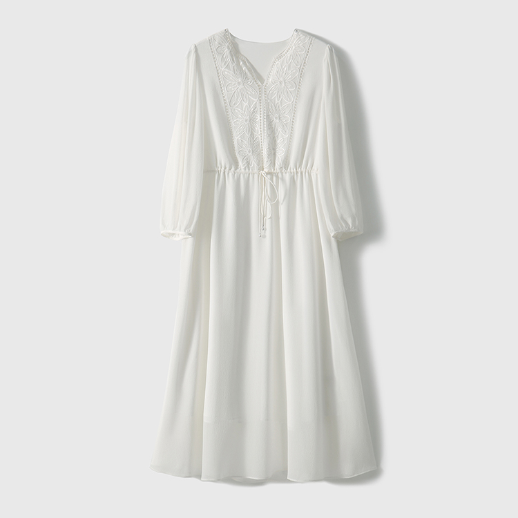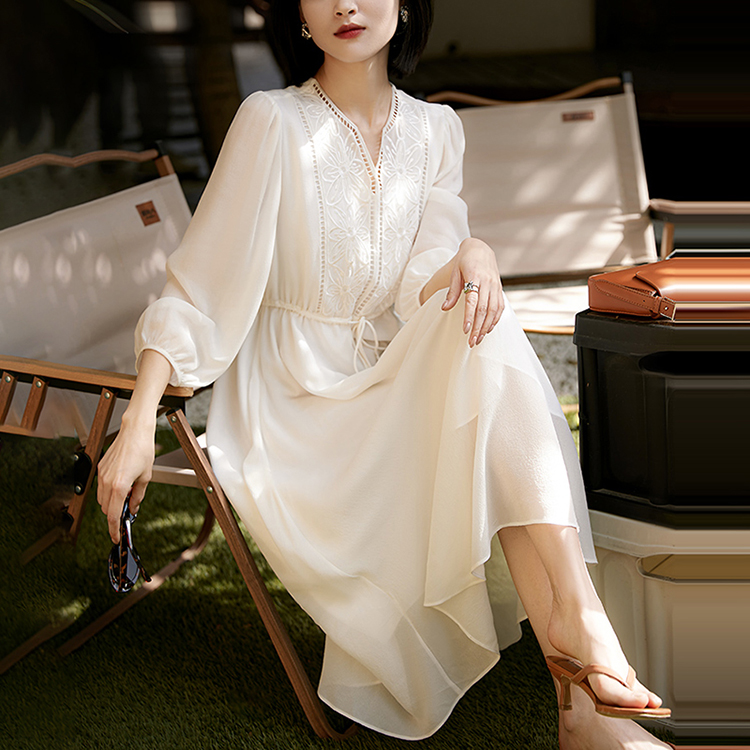 V領刺繡輕薄飄逸燈籠袖連身裙(3色)