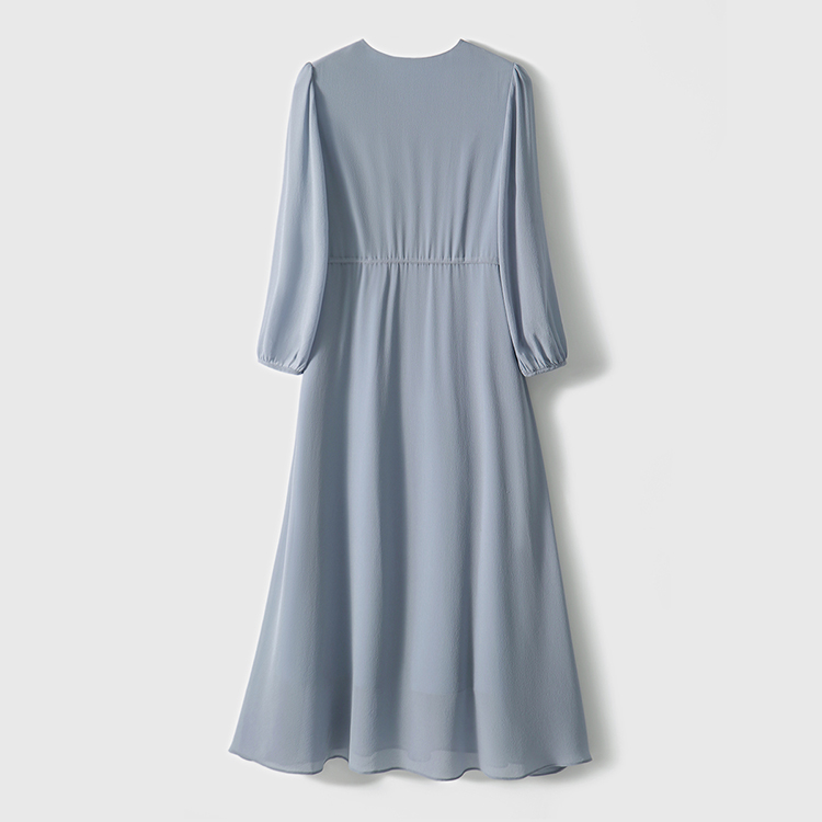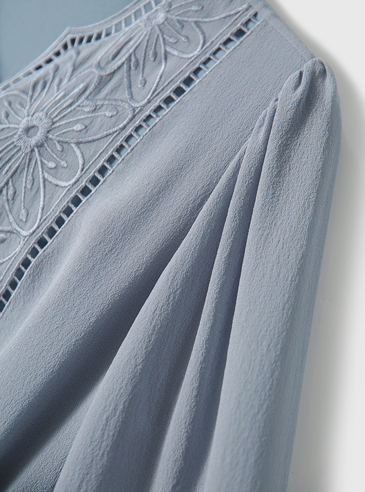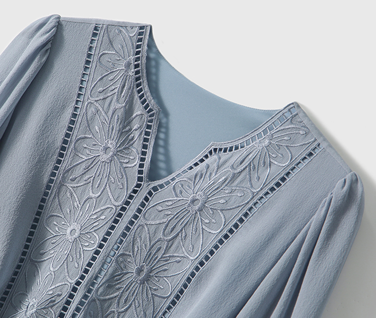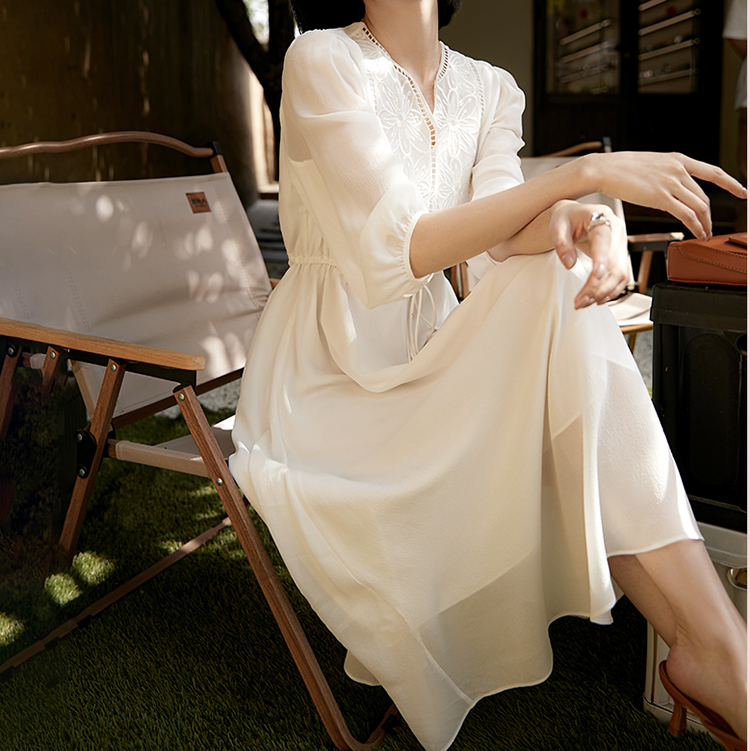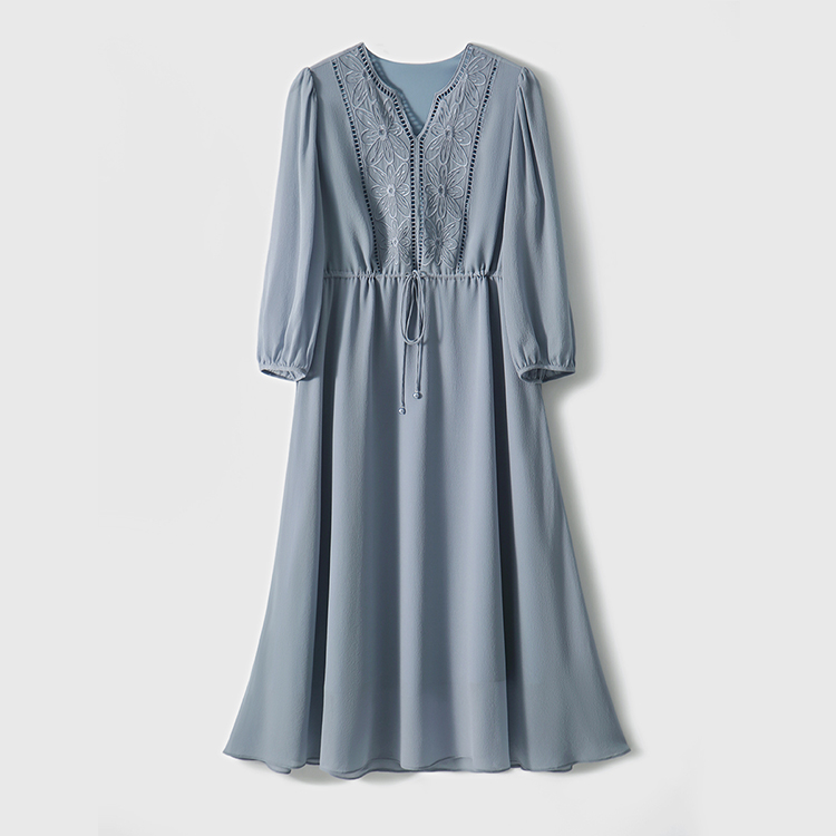 V領刺繡輕薄飄逸燈籠袖連身裙(3色)